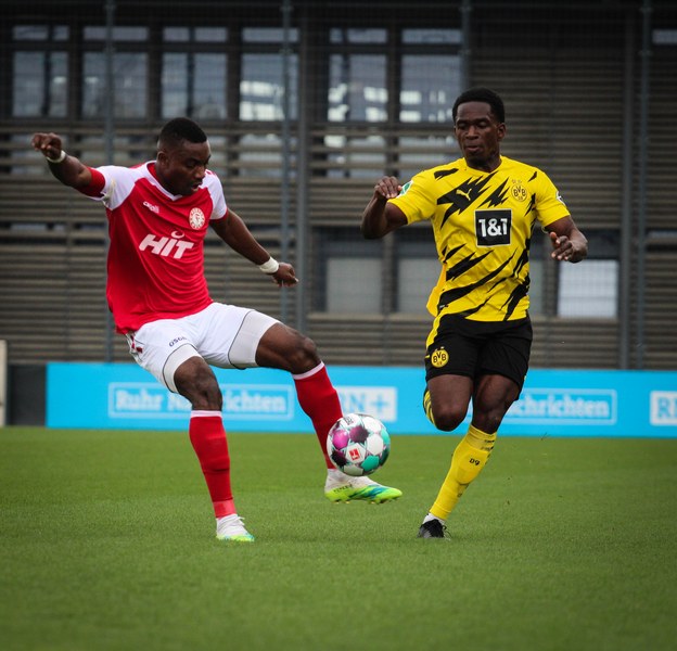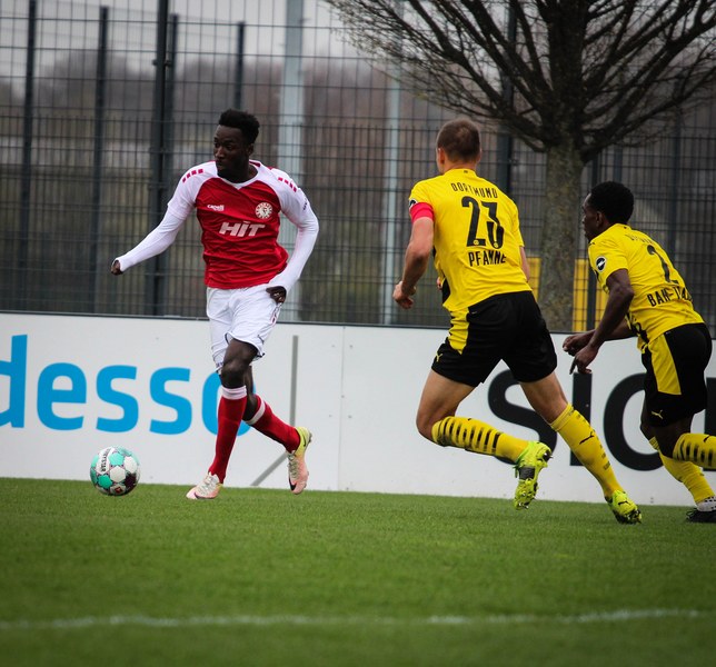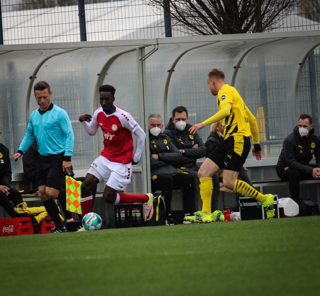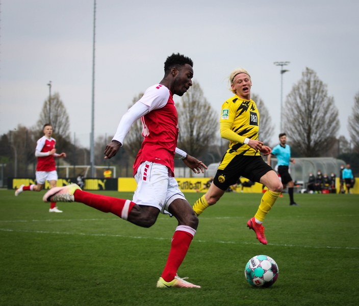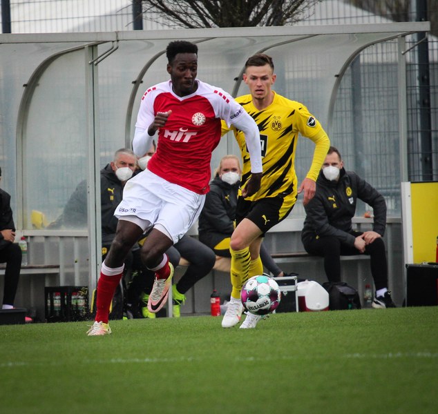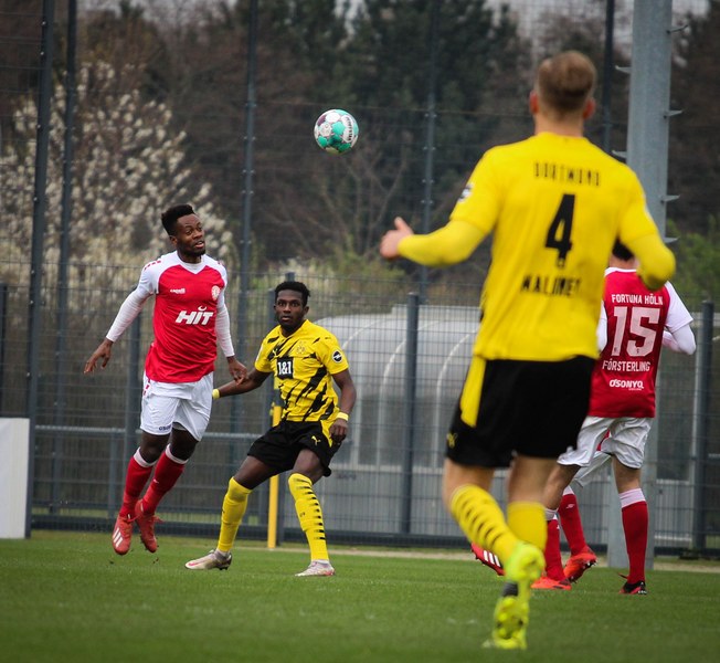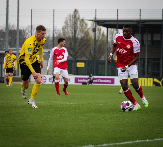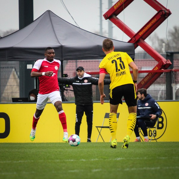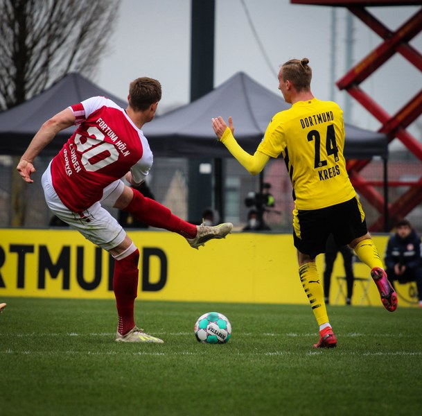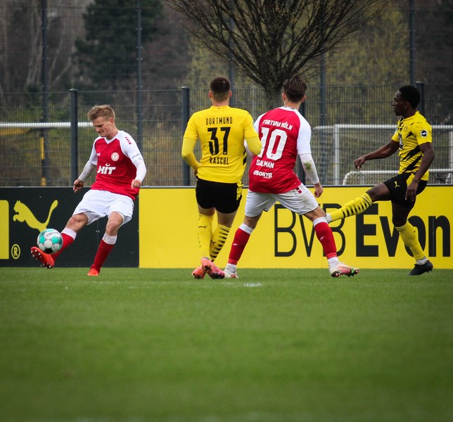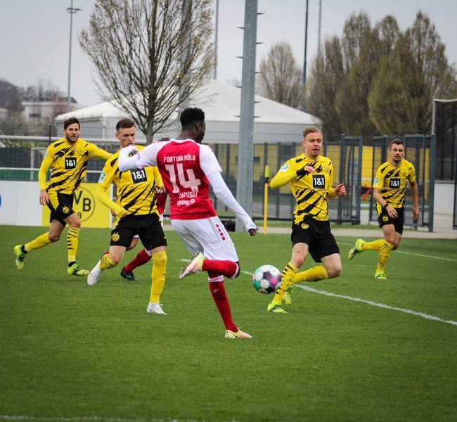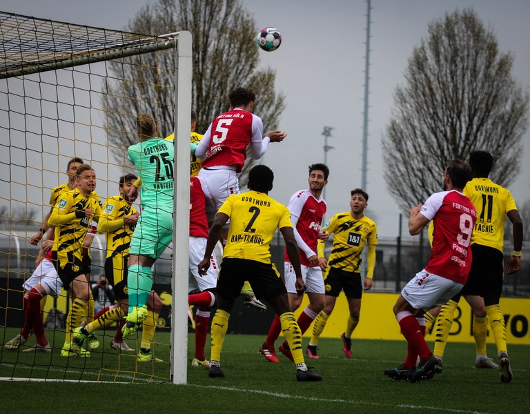 Beide Mannschaften kamen personell unverändert aus den Kabinen zurück, ehe Prokoph zur zweiten Halbzeit anstieß. Die Fortuna kam sichtlich motiviert zurück auf das Spielfeld und erspielte sich sofort die erste große Gelegenheit. Poggenbergs Flanke landete am hinteren Fünfereck bei Owusu, welcher sofort draufhielt. Der Keeper der Dortmunder war noch rechtzeitig zur Stelle und lenkte den Ball zur Ecke (46.). Fast dieselbe Chance erspielten sich die Kölner zwei Minuten später. Diesmal war es Salman, der einen Freistoß auf Höhe der Mittellinie ausführte und den Ball somit in den gegnerischen Sechzehner brachte. Durch die Kopfball von Löhden wurde das Spielgerät auf den am zweiten Pfosten stehenden Owusu verlängert. Diesmal war der Winkel aber zu spitz, sodass Unbehaun den Schuss problemlos festhalten konnte (48.). Fortuna kam mit viel Schwung aus der Kabine, musste in der 51. Minute dann aber einen Rückstand hinnehmen. Poggenberg bekam auf der linken Verteidigerposition den Ball nicht entscheidend aus der Gefahrenzone, wodurch die Kugel letzten Endes unglücklich beim Dortmunder Toptorschützen Tigges landete. Tigges behielt die Nerven, legte sich den Ball in aller Ruhe im Strafraum der Fortuna zurecht und schob gekonnt rechts neben Rauhut zum 1:0 ein. Kurz nach der Führung des BVB schlich sich wieder die Ungenauigkeit in das Aufbauspiel der Fortuna. Durch unkonzentrierte Zuspiele brachte sich die Fortuna teilweise selbstverschuldet in Bedrängnis und hatte Glück, dass die Dortmunder die Fehler bislang nicht ausnutzten. Je mehr Minuten vergangen, desto mehr kämpfte sich die Fortuna zurück in die Partie. Kapitän Löhden ging voran und setzte ein starkes Zeichen, nachdem er gut aufgepasste und Bakir den Ball in aussichtsreicher Position im Strafraum klaute (61.). Die Borussen forderten zwar lautstark einen Elfmeter ein, jedoch war Löhdens Einsatz sauber und auch enorm wichtig. Die erste gelbe Karte des Spiels sah Mittelfeldmann Brandenburger, nachdem er an der Mittellinie zu hart gegen Tigges einstieg (62.). Durch eine von Ubabuike getretene Ecke kam Rumpf im gegnerischen Strafraum vielversprechend zum Abschluss. Sein Kopfball ging aber knapp am Kasten des BVB vorbei. Die Fortuna griff jetzt sichtlich früher den Gegner an und brachte ihn dadurch immer wieder in Bedrängnis. Sie ließen die Dortmunder jetzt nicht mehr ungestört in die eigene Hälfte marschieren, sondern wollten das Spiel selbst spielerisch gestalten. Nichtsdestotrotz kam der BVB im Anschluss zur nächsten riesen Tormöglichkeit. Diesmal war es Ercan, der nach einem durchgesteckten Pass frei vor Rauhut auftauchte. Er nutzte die Chance aber nicht und schlug den Ball aus kurzer Distanz über die Latte (72.). Nach der Aktion wechselte Trainer Alexander Ende das erste Mal und brachte Najar für den gelb vorbelasteten Brandenburger (73.) Außerdem verließ Salman den Platz für Kegel (80.) und Baba kam für Ubabuike (83.). Fortuna gab sich bis zum Schluss nicht auf und versuchte immer wieder den Weg in das letzte Drittel zu finden. Auf der rechten Außenbahn überspielten Ochojski und Owusu die gegnerische Abwehr mit einem schönen Doppelpass, wodurch Owusu an der Grundlinie frei zum Flanken kam. In der Mitte lief Löhden ein und köpfte den Ball wuchtig ganz knapp am linken Pfosten vorbei (83.). Anschließend brachte Ende den jungen Özden für Poggenberg (84.). Die Dortmunder bekamen in den Schlussminuten kaum mehr Entlastung und schlugen die Bälle nur noch raus, sodass Fortuna immer wieder neu anlaufen musste. In der 87. Minute war es erneut Löhden, der den Ausgleich auf dem Kopf hatte. Ochojskis präzise Hereingabe setzte er aber auch wenige Zentimeter am Tor vorbei (87.). Am Ende musste sich die Fortuna gegen den Tabellenführer knapp mit 1:0 geschlagen geben. Die Schlussoffensive kam etwas zu spät.