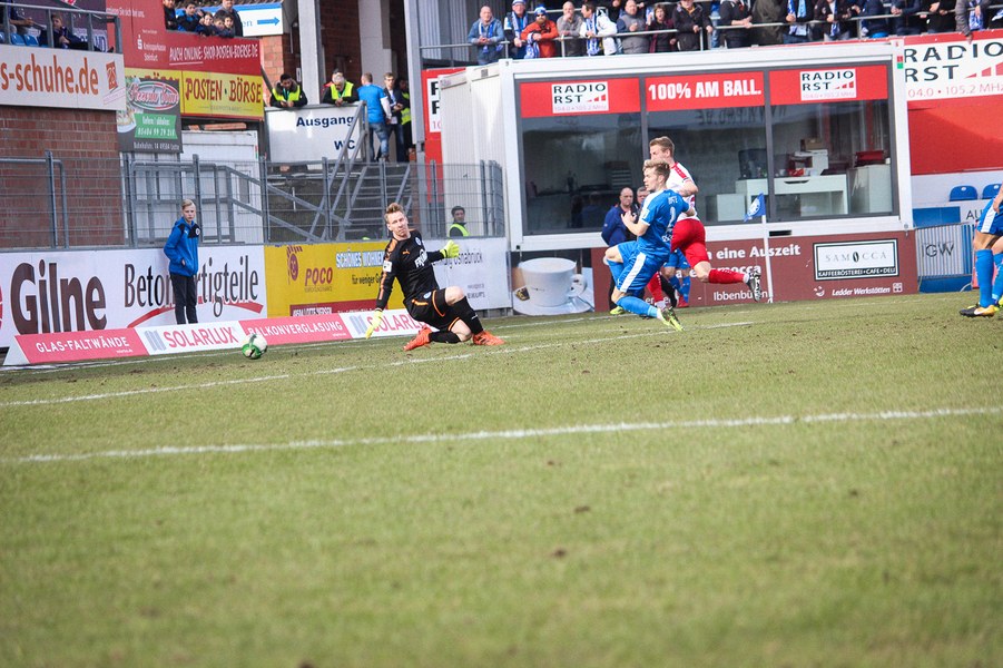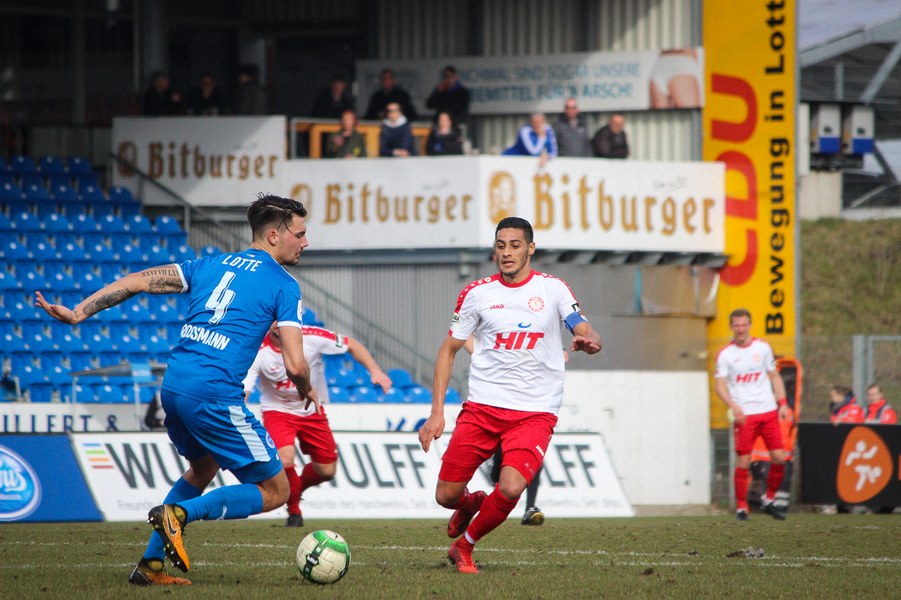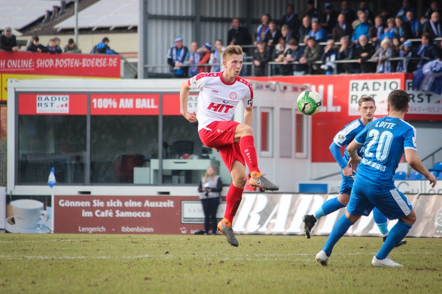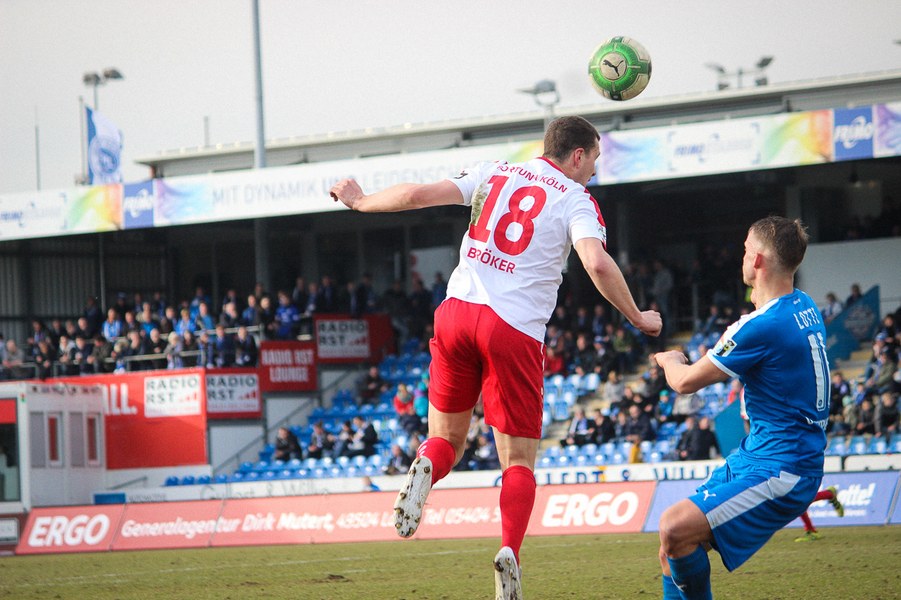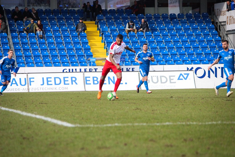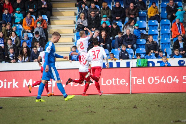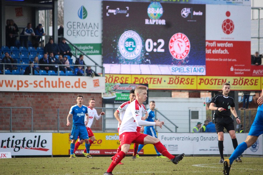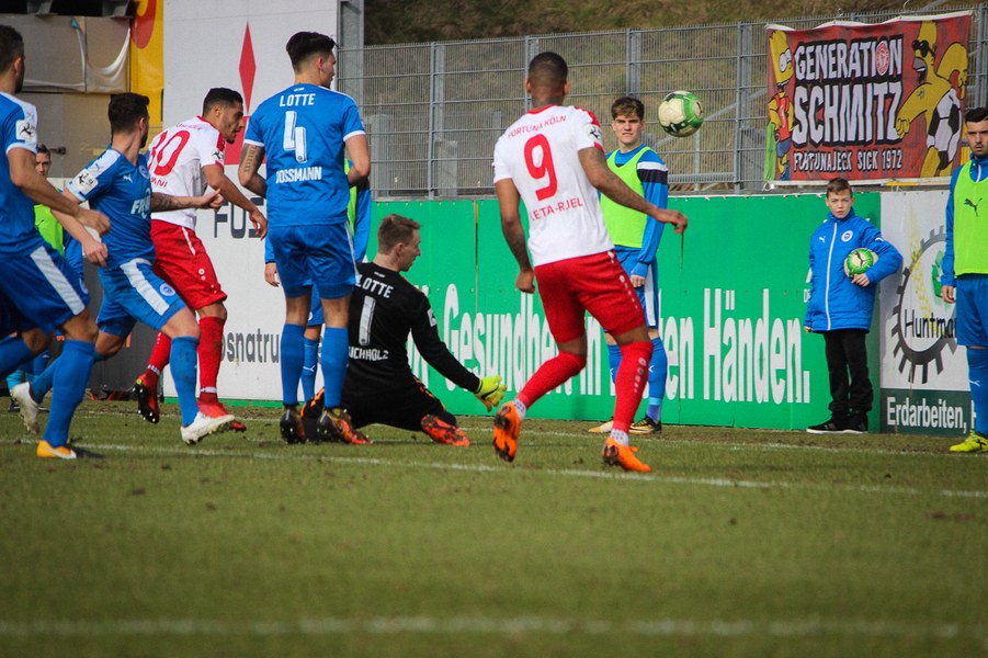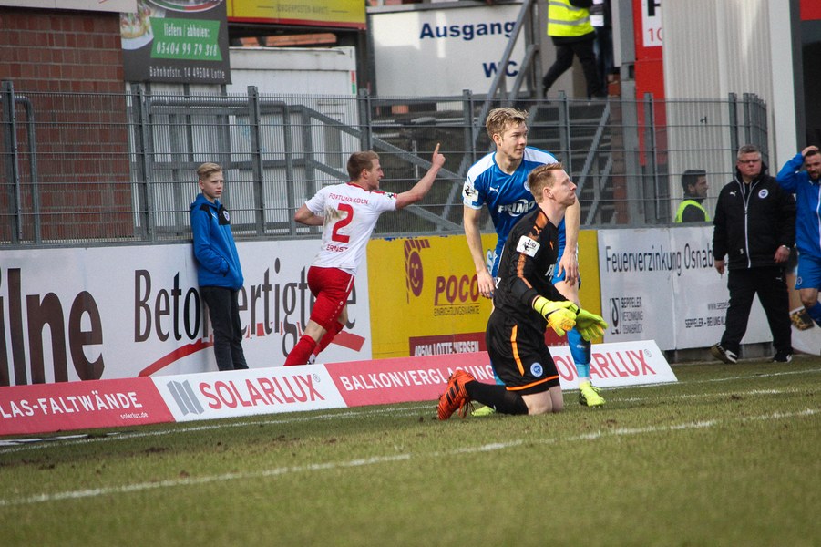 Beiden Mannschaften konnte man zu Beginn der Begegnung die Anstrengungen der englischen Woche anmerken. Während die Fortuna zwei Siege feiern konnte, mussten die Sportfreunde zweimal jeweils spät Gegentreffer hinnehmen. Es entwickelte sich ein Spiel, das Größtenteils im Mittelfeld stattfand. Die erste nennswerte Chance verbuchte allerdings die Fortuna: Nach Zuspiel von Scheu konnte Keita-Ruel in den Strafraum eindrinen. Sein Abschluss wurde jedoch abgefälscht (14.). Danach kamen die Gastgeber besser ins Spiel und setzten per Standards gefährliche Akzente: Osterhelweg verfehlte mit einen Freistoß knapp das Tor (22.). Nach der zweiten Ecke der Sportfreunde zielte Rosinger per Volleyabnahme knapp am langen Pfosten vorbei (25.). Nach der Lotter Drangphase verflachte das Spiel dann wieder, ehe Kegel einen Geniestreich im Fuß hatte: Mit einem punktgenauen Diagonalball hinter Lottes Viererkette spielte er Ernst frei, der Lotte-Keeper Buchholz eiskalt tunnelte und zur Kölner Führung traf (39.). Anschließend konnte sich die Fortuna bei Torhüter Tim Boss bedanken, dass sie nicht den Ausgleich hinnehmen musste: Nach einem Ballverlust tauchte Rosinger frei vor dem Tor auf, aber Boss konnte parieren(41.). So ging es mit der Führung in die Halbzeitpause.
