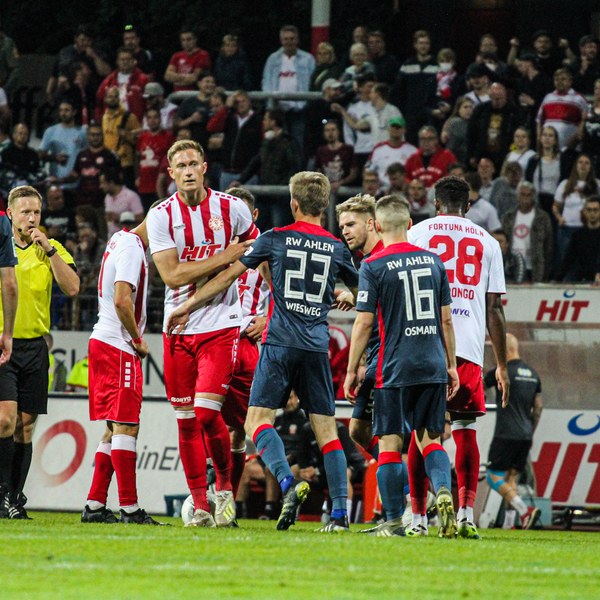 Bereits in der ersten Minute kam Owusu gefährlich vor das Tor der Gäste, sein Schuss ging jedoch deutlich drüber. Anschließend hatten die Gäste etwas mehr Ballbesitz, kamen aber nicht gefährlich vor das Tor von Schlussmann André Weis. Die Ahlener wurden lautstark von den mitgereisten Fans nach vorne gepeitscht und der Fortuna gelangen kaum Befreiungsschläge. In der siebten Spielminute gab es dann die erste Ecke des Spiels für die Südstädter, die Ahlener konnten die Schussversuche jedoch klären. Kurze Zeit später eroberte Najar auf der rechten Seite den Ball, lief schnell aufs Tor der Gäste zu und passte im richtigen Moment auf den mitgelaufenen Marquet, der nur noch zur 1:0 Führung (9.) einschieben musste. Die Fortuna war nach dem Treffer besser im Spiel und bemüht zu erhöhen, Rot Weiss Ahlen ließ allerdings keine Chance zu und versuchte das Spiel zu kontrollieren. In der 18. Spielminute klärte ein Fortune dann den Ball direkt vor die Füße eines Ahleners. Die Ahlener machten dann das Spiel schnell und Holldack überwand Weis zum 1:1 Ausgleich. Im weiteren Verlauf der Halbzeit waren die Südstädter die bessere Mannschaft und erspielten sich einige Chancen, die Ahlen allesamt klären konnte. Fortuna ließ sich davon nicht beirren und baute das Spiel in Ruhe auf, doch es ergaben sich aufgrund der starken Defensive der Gäste kaum Lücken. Vor der Halbzeit hatten die Ahlener noch eine sehr gute Chance durch Wiesweg, die André Weis stark parierte. Anschließend waren die Gäste wieder besser im Spiel und das Spiel um einiges ausgeglichener. Die Mannschaften gingen mit einem 1:1 in die Kabine.