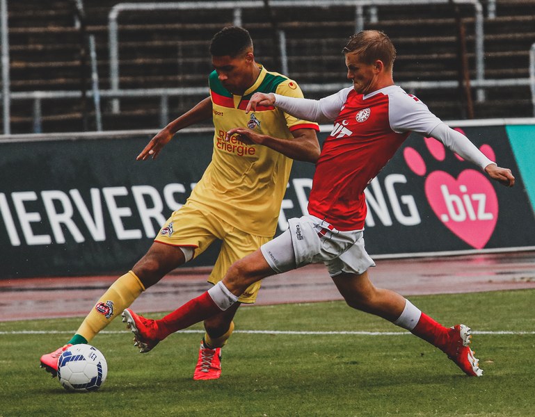 Früh kam die Fortuna bereits zu ihrer ersten Chance. In der 2. Minute war es Hamza Salman, der nach einem Zuspiel von Mike Owusu den gegnerischen Keeper prüfte. Die Fortuna konnte sich in den ersten Minuten gut in der Hälfte der Kölner festsetzen und sich mehrere kleinere Chancen herausspielen, welche allerdings nicht zum Torerfolg führten. Der 1.FC Köln kam in den Anfangsminuten nur mit wenigen Chancen vor das Tor von Kevin Rauhut. Nach einer Ecke von Hamza Salman verfehlte Jannik Löhden das Tor mit einem Kopfball nur knapp (8.). Nach 10 Minuten gab es dann die erste Torannäherung für den 1. FC Köln, aber Rauhut war hell wach und konnte die Chance vereiteln. Hamza Salman spielte in der 13. Minute eine Ecke mit Francis Ubabuike kurz aus und flankte dann gefährlich vor das Tor, der Schiedsrichter pfiff allerdings Foul an Julian Krahl. In den Folgeminuten, kamen die Gäste aus Köln-Müngersdorf dann zu einigen gefährlichen Situationen. So klärte Timo Hölscher nach einem Fehlpass von Jannik Löhden eine Chance des 1.FC Köln im Strafraum, (15.). Kurz darauf kam Christian Clemens von der 16er Kante frei zum Schuss, doch Kevin Rauhut machte die Torwartecke zu und klärte zum Eckball. Die anschließende Ecke brachten die Kölner in den Strafraum, aber der Kopfball landetet zum Glück für Fortuna nur auf dem Tornetz (17.). In der 19. Minute köpft Salman nach einem Einwurf von Dan-Patrick Poggenberg auf das Tor der Kölner, aber Krahl hält den Ball sicher. Kurz darauf kam es zu einer brenzligen Situation vor dem Tor der Fortuna, welche mit einem Freistoß für den 1.FC Köln endete, der allerdings deutlich über dem Tor landete (20.). In der 26. Minute gab es dann die Doppelchance für die Jungs aus der Südstadt. Salman spielt eine kurze Ecke mit Ubabuike aus, welcher den vor dem Tor wartenden Julian Günter-Schmidt sah. Dieser traf allerdings nur den linken Pfosten. Der Ball blieb aber weiterhin gefährlich und fand den Weg in den 5er zu Francis Ubabuike, welcher allerdings in die Arme des Kölner Keepers köpfte. In der 28. Minute setzte sich Owusu stark durch und legte auf Höhe der Strafraumlinie für Ochojski ab, welcher allerdings am linken Pfosten vorbei zog. Nach 30 Minuten gab es einen Freistoß auf Höhe der Mittelinie für die Fortuna, der zunächst gefährlich für das Tor der Geißböcke zu werden schien, dann jedoch in einem Konter für den 1. FC Köln endete, welchen Kevin Rauhut aber parieren konnte. In der 34. Minute spielten die Gäste einen langen Ball auf Henning in den Strafraum, welcher den Ball per Kopf auf Hwang ablegte. Christian Clemens erhielt außen den Ball, hatte das Auge für Lucas Musculus, der aber deutlich über das Tor der Fortuna schoss. Kurz vor der Pause kam die Fortuna wieder besser in das Spiel und erzwang sich einige gute Chancen. So hatten die Gäste in der 40. Minute Glück, als Günther-Schmidt aus kürzester Distanz den Kölner Keeper traf und ein weiteres Mal in der 43. Minute, als Owusu an Krahl scheiterte. Die Fortuna ging mit einem leichten Chancenplus und den deutlich zwingenderen Chancen in die Halbzeitpause. Tore wollten allerdings noch nicht fallen.