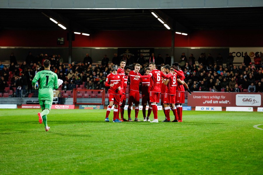 Die erste Aktion von Fortuna war in der 4. Spielminute. Hamza Salman versucht es aus der Distanz, aber sein Schuss hatte nicht die nötige Kraft und Torwart Ricco Cymer hielt den Ball sicher. Fortuna drückte weiter und leitete über Farid Abderrahmane den nächsten Angriff ein. Abderrahmane spielte raus auf Owusu, der mit seiner Flanke Prokoph suchte, allerdings nicht fand (5.). Die Reaktion von Alemannia Aachen kam in der 8. Minute über die rechte Seite. Nico Ochojski klärte den Ball jedoch sicher zur Ecke. Den anschließend ausgeführten Eckball brachte Aachen vor das Tor, wo David Pütz am höchsten sprang, sein Ball ging aber neben dem Tor (9.). Die Gastgeber kontrollierten wieder das Spiel und tauchten mit einem auf das Tor gezogenen Freistoß von Jannes Hoffmann erneut gefährlich vor dem Aachener Kasten auf (13.). Vor allem bei Ecken musste Fortuna immer wieder hell wach sein und die aufgerückten Innenverteidiger im Auge behalten (19./21./23). Auf der Gegenseite setzte Bender den Ball nur an das Außennetz (25.). Nur eine Minute später sah Kevin Rauhut nach einem Freistoß der Gäste den Ball knapp über sein Tor fliegen (26.). Anschließend gab es eine Spielunterbrechung. Beide Fanlager drückten mit Trillerpfeifen ihren Unmut gegenüber Montagsspielen aus, sodass der Schiedsrichter die Spieler in die Kabine bat. Nach 16 Minuten kehrten beide Mannschaften auf das Feld zurück. Fortuna meldete sich erneut über den aktiven Mike Owusu und Roman Prokoph zurück im Spiel. Kurz vor der Grundline klärte Aachen jedoch zur Ecke. Diese brachte allerdings nichts ein. Als die Partie schon in der 11. Minute der Nachspielzeit war, musste Kevin Rauhut schnell reagieren und den Ball von Marco Müller mit dem Fuß zur Ecke befördern. Und so endete die erste Halbzeit ohne Tore.