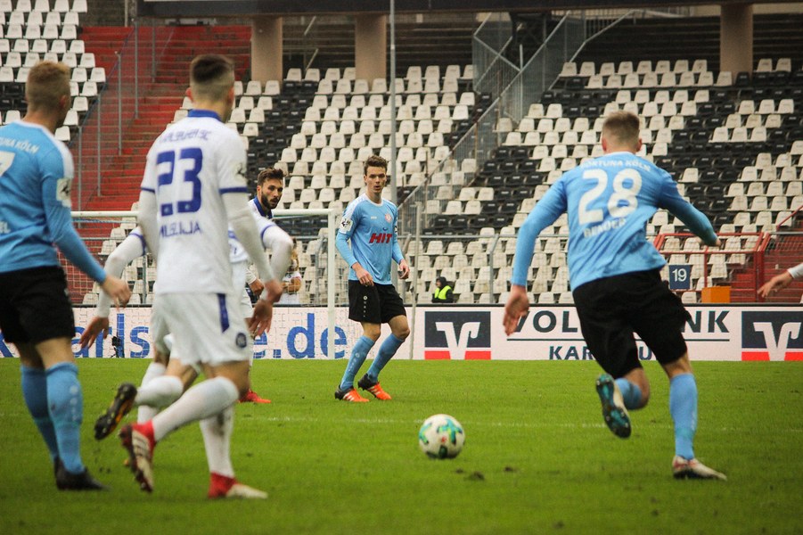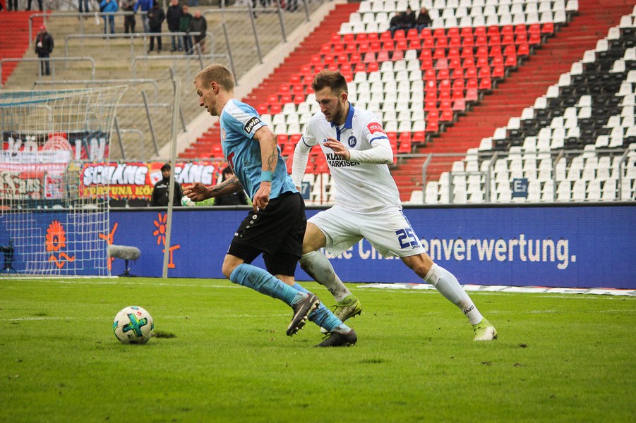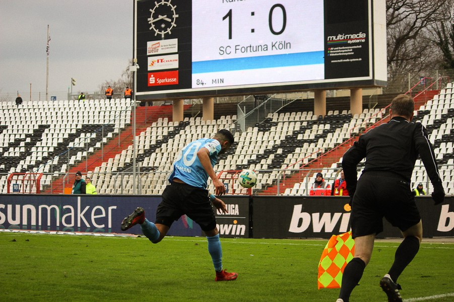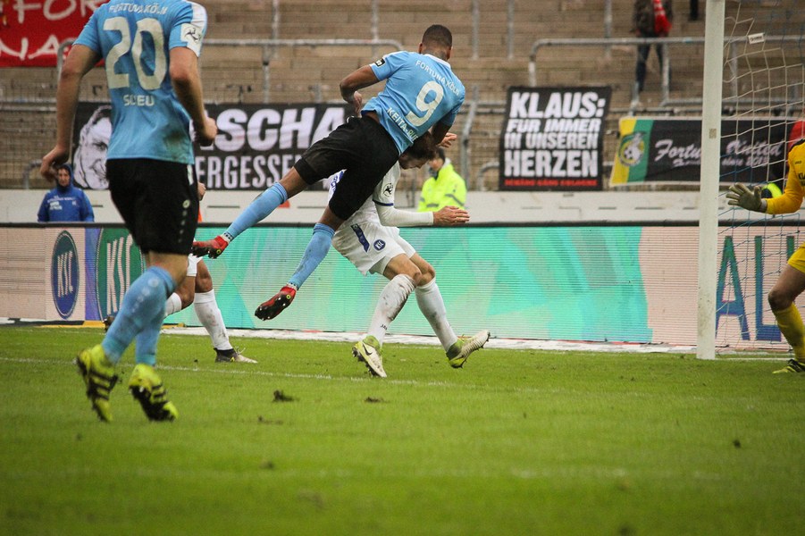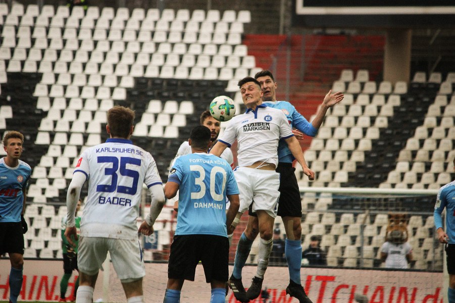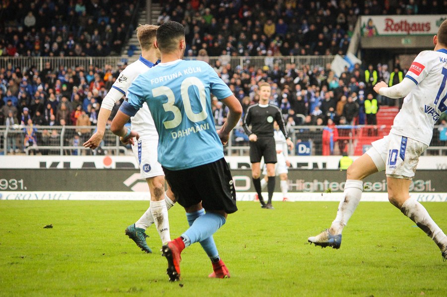Trainer Uwe Koschinat änderte die erste Elf auf insgesamt drei Positionen. Kessel rückte für Farrona-Pulido in die Aufstellung, Theisen und Pazurek starteten für die beiden gesperrten Kegel und Kyere. Die Fortuna begann fehlerhaft in der Partie und so erwischte der KSC einen Auftakt nach Maß! Wanitzek eroberte tief in der Kölner Hälfte den Ball, legte auf Fink raus und dessen Hereingabe fand den Kopf von Schleusener. Der Stürmer verwandelte aus kurzer Distanz sicher (7.). In der Folgezeit leistete die Fortuna sich immer mal wieder Fehler im Aufbauspiel, die der KSC mit gefährlichen Kontern bestrafen wollte. Die Badener zeigten sich zwar spielstark, aber schafften es nicht wieder gefährlich vor das Tor der Kölner zu kommen. Nach und nach arbeiteten sich die Kölner aber ins Spiel und dominierten nach einer guten Viertelstunde teilweise das Geschehen. Abschlüsse von Bender und Dahmani waren die Folge (19./20.). Uphoff war es dann, der den Ausgleich der Fortuna verhinderte: Kessel und Dahmani spielten einen starken Doppelpass und hebelten damit die Defensive der Karlsruher aus. Kessels Abschluss konnte aber vom Schlussmann des KSC pariert werden (26.). Die Kölner probierten daraufhin öfters die Lücke zu finden, aber kamen vorerst nicht mehr gefährlich nach vorne. Kurz vor der Pause musste Boss dann allerdings eingreifen, als er nach einem langen Ball vor einem heraneilenden KSC-Stürmer in höchster Not klären konnte (44.).