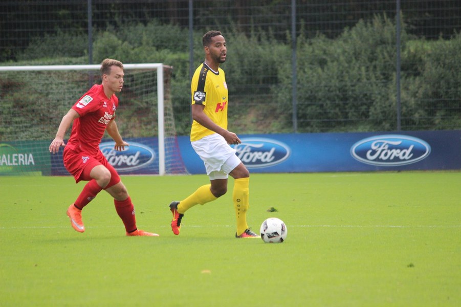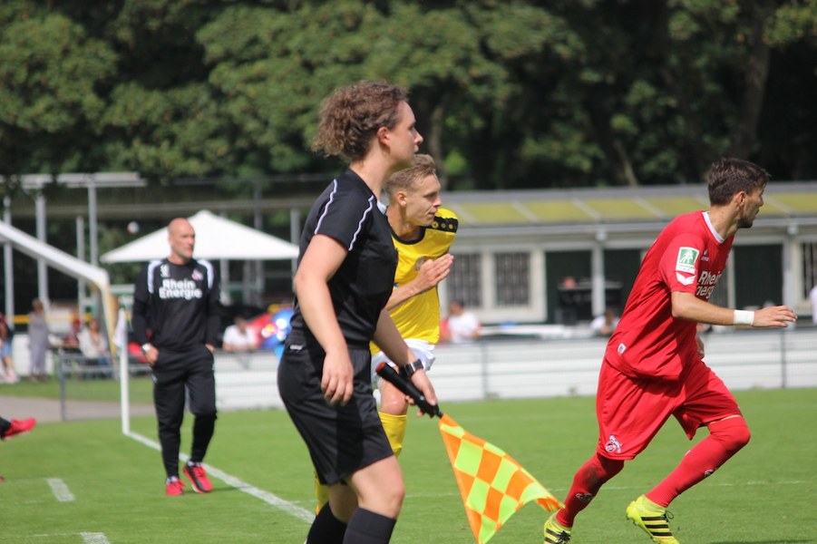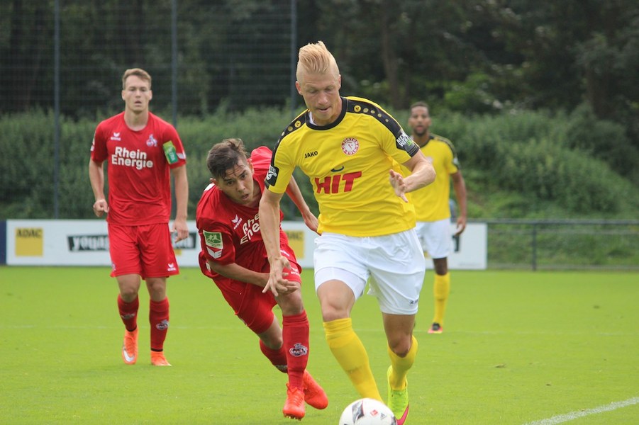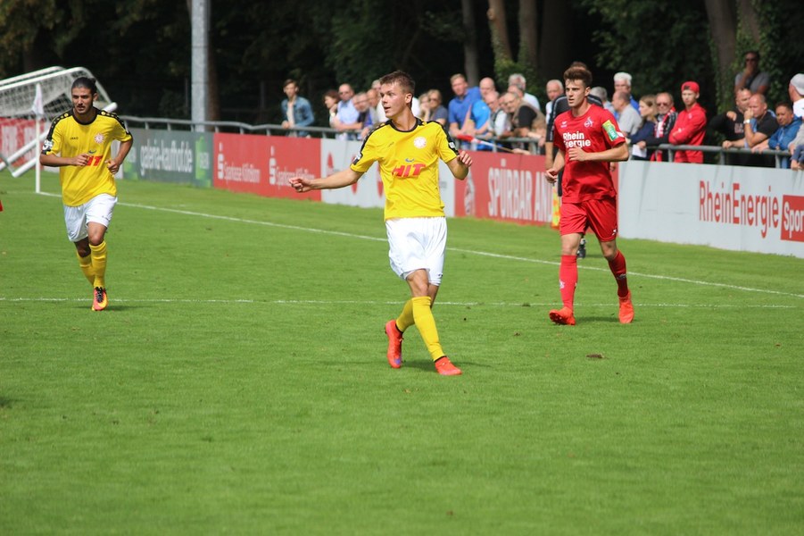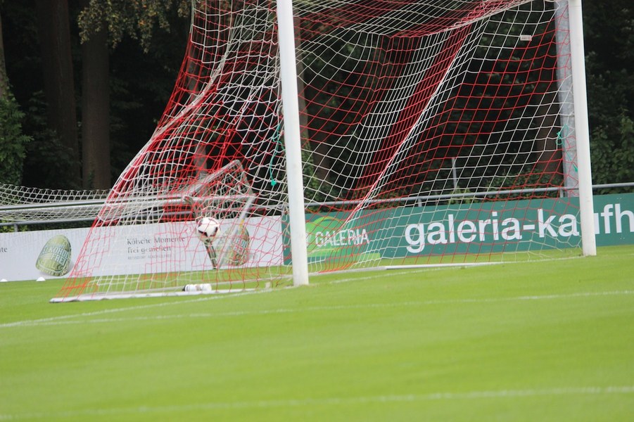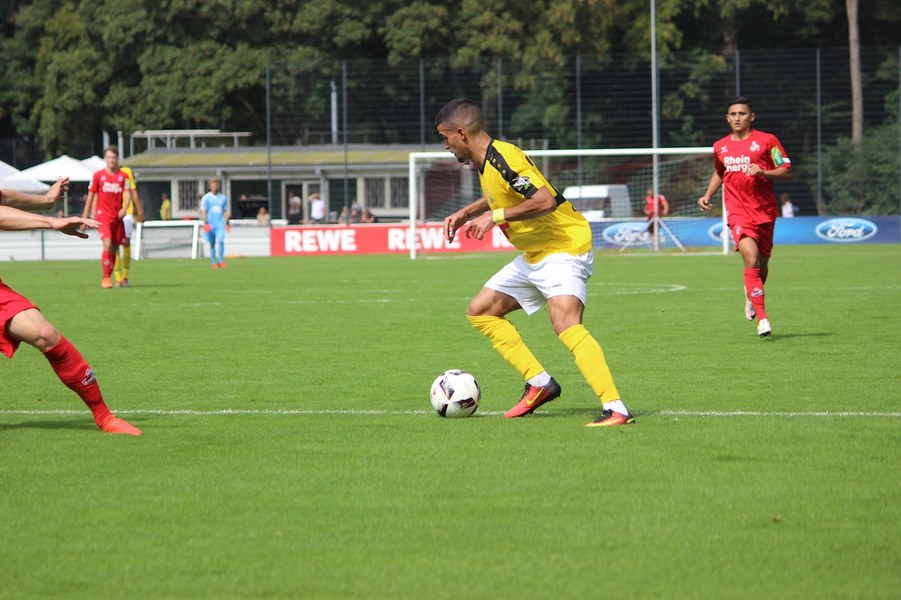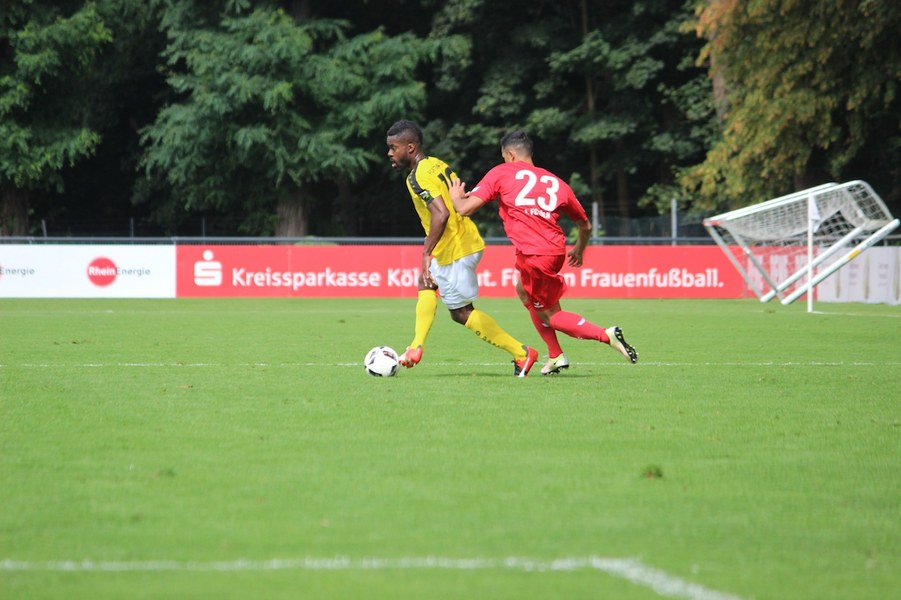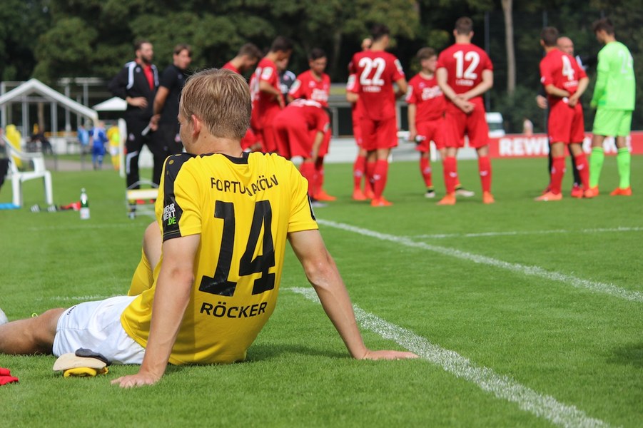 Von Beginn an ging die Fortuna mit der notwendigen Ernsthaftigkeit in den Test gegen die jungen Geißböcke. So setzte Röcker mit einem resoluten Zweikampf früh das erste Zeichen. Die Südstädter versuchten von hinten heraus das Spiel zu kontrollieren, lauerten zugleich aber auch auf Kontermöglichkeiten. Den ersten Torschuss gab jedoch der FC in Person von Bauer ab, nach einem Ballverlust der Fortuna (11.). Danach bestimmte der Drittligist jedoch die Partie. Immer wieder versuchte man schnell nach vorne zu spielen. Nach einem Konter des FC schaltete die Fortuna schnell um, sodass sich Rahn aus der Distanz probieren konnte (19.). Wenige Minuten zuvor wurde der Stürmer nach einem blitzsauberen Konter über Engelman in aussichtsreicher Position wegen Abseits zurückgepfiffen. Trotzdem ging die Fortuna anschließend in Front: Nach einem Ballgewinn von Engelman marschierte Andersen in Richtung FC-Tor. Schließlich war es Kessel, der nach Spielverlagerung von Bösing trocken ins kurze Eck verwandelte - 1:0 für die Fortuna (26.). Der Regionalligist kam gegen kompakte und giftige Südstädter nicht zur Entfaltung. Vielmehr hat Stoffels einen Distanzschuss für die Fortuna parat (39.). Dass die jungen Geißböcke aber nicht zur Entfaltung kamen, lag auch an der Aggressivität des Drittligisten. So war es nicht überraschend, das mit Stoffels ein Fortune kurz vor der Pause die einzige Verwarnung in der Partie sah (43.).