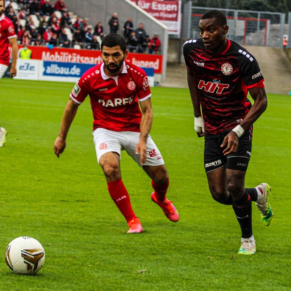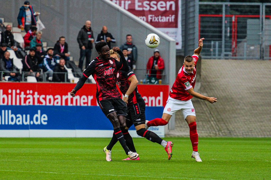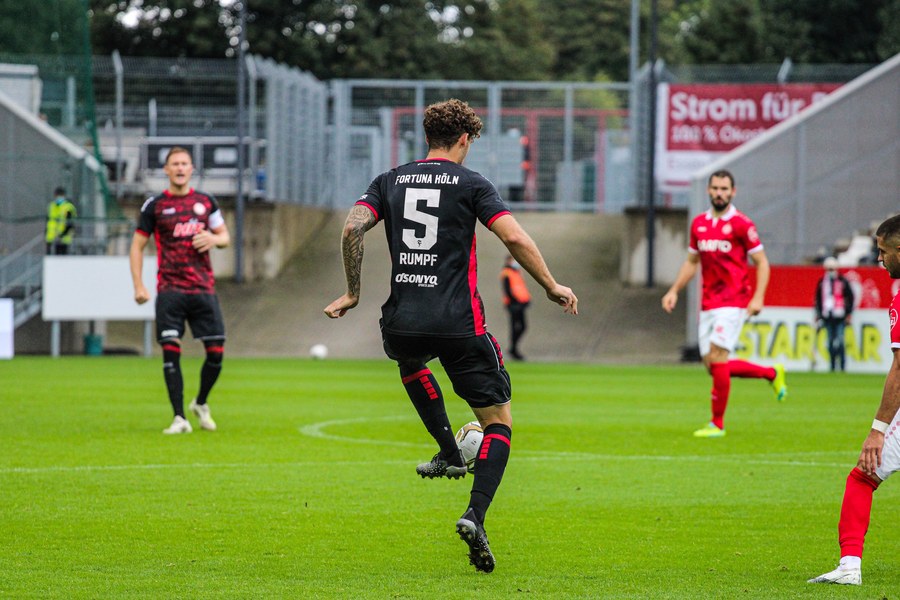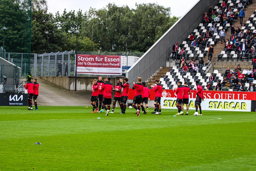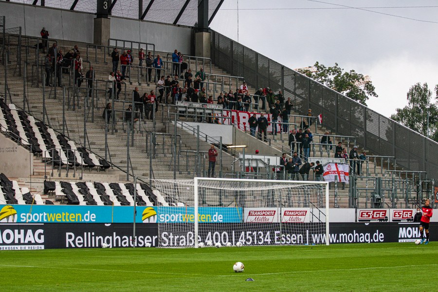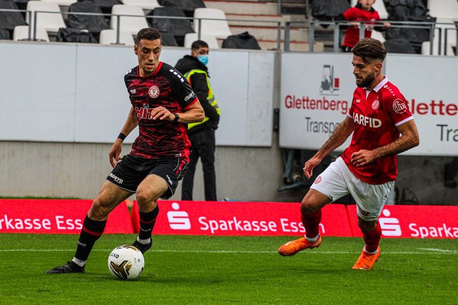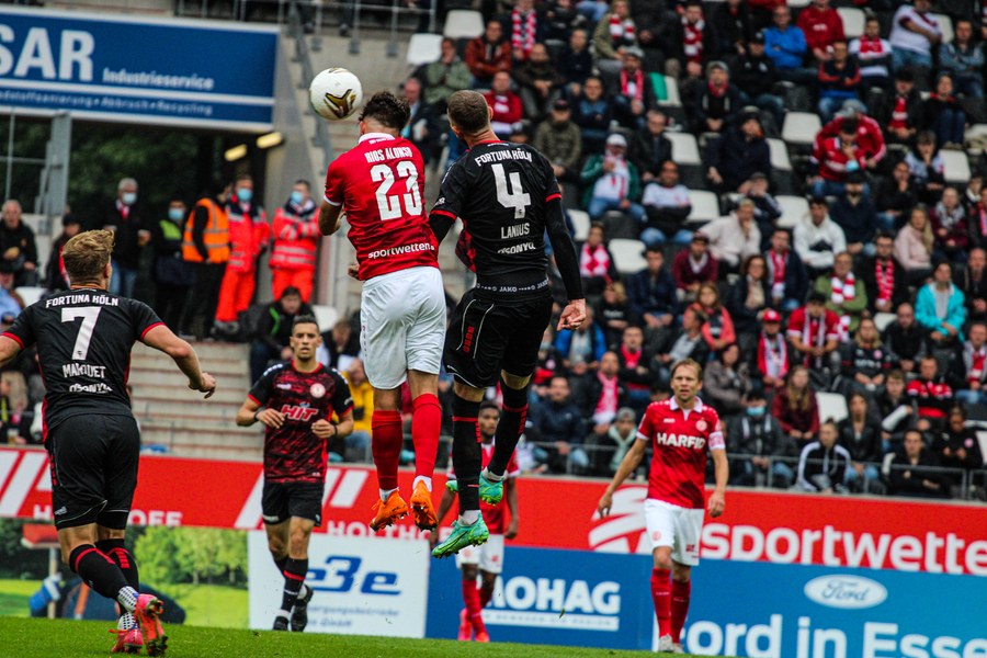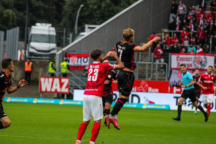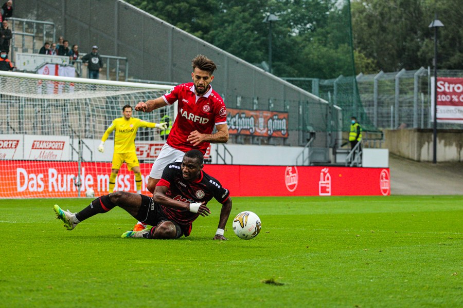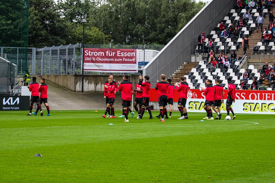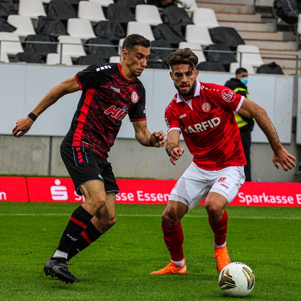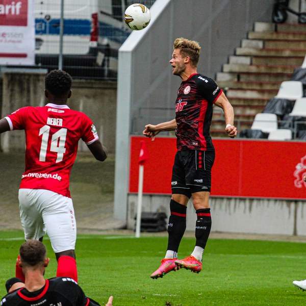 Bereits in der zweiten Spielminute gab es die erste Schrecksekunde für die Fortuna: Plechaty kam nach einem langen Pass über die rechte Seite und schloss in Richtung langes Eck ab. André Weis war schon geschlagen, aber der Ball prallte an den Pfosten. Engelmann schoss den Abpraller ebenfalls an den Pfosten und die daraus resultierende Ecke brachte nichts ein. Nach fünf schnellen Minuten beruhigte sich das Spiel zunächst wieder, bis Essen ab der zehnten Minute mehr Druck machte. Die Fortuna stand sicher, ließ nichts zu und versuchte selber Druck zu machen. Das Spiel war zunächst ein ständiger Wechsel zwischen beiden Hälften, wobei beide Mannschaften ihre stärkeren Phasen hatten. Ab der 20. Spielminute hatte RWE das Spiel dann für einige Minuten fest im Griff und zwang die Fortuna zu Fehlern, die ohne Folgen blieben. Weiterhin blieben beide Mannschaften ohne klare Chancen, Rot-Weiss hatte jedoch optische Vorteile. Die Teams schenkten sich nichts und die Fouls nahmen auch in der Härte zu. Nach einem Foul an Marquet erhitzen sich die Gemüter und Fortuna Coach Alexander Ende musste von seinen Kollegen beruhigt werden. Vor der Pause nahm Ubabuike es allein mit der Essener Verteidigung auf, sein Abschluss segelte allerdings klar über das Tor. In den letzten Sekunden der Nachspielzeit verloren die Essener nach einem Einwurf von Poggenberg den Überblick. Sascha Marquet konnte sich am zweiten Pfosten frei einschieben und konnte die 0:1 Pausenführung für die Fortuna erzielen.