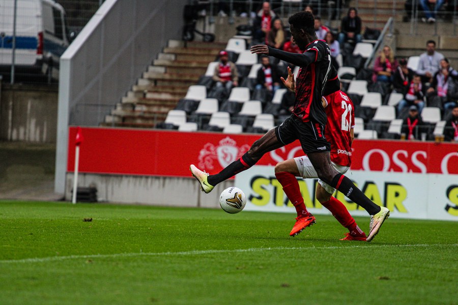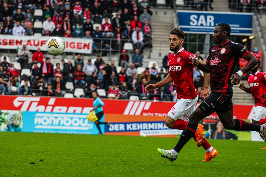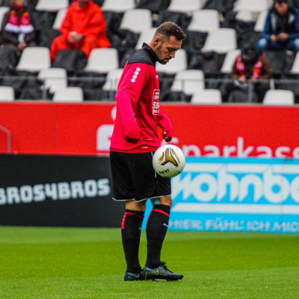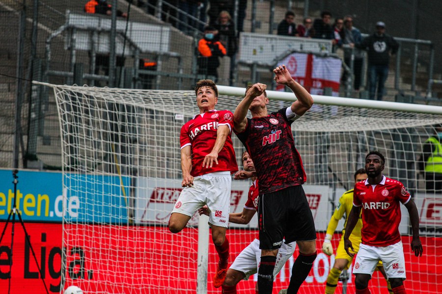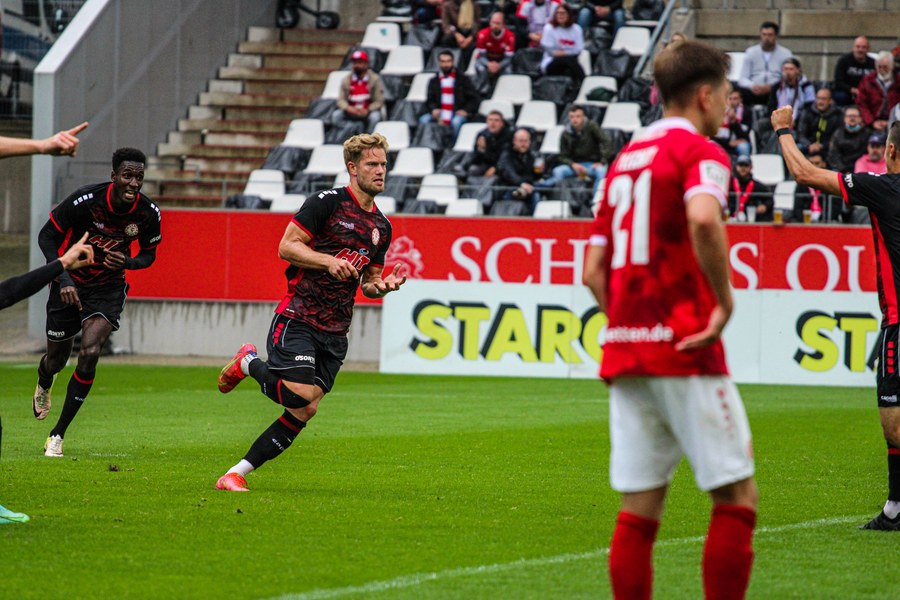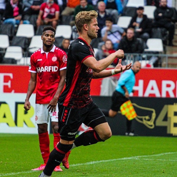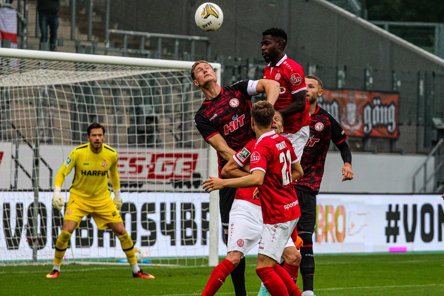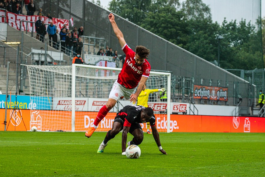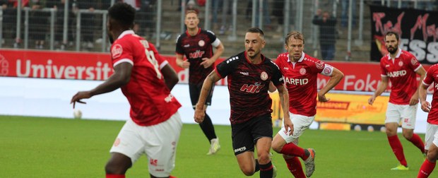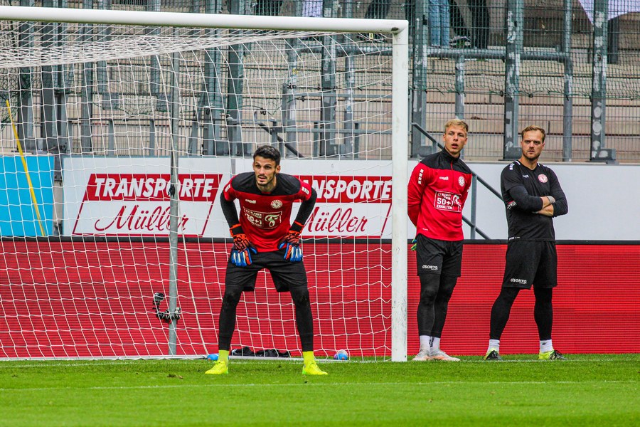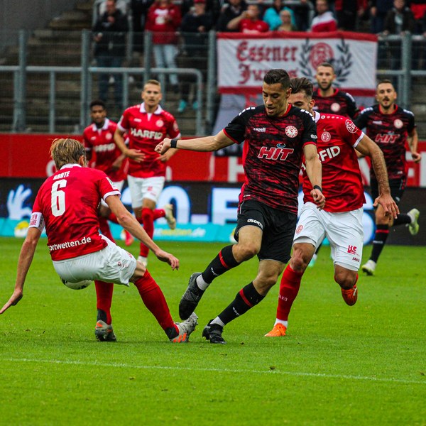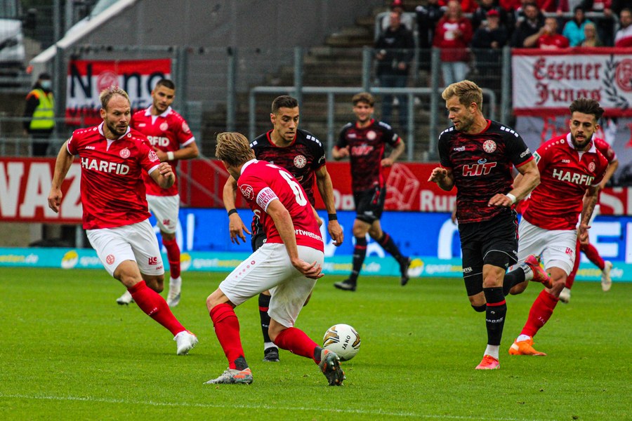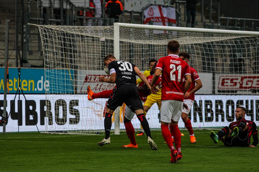 Bereits in der zweiten Spielminute gab es die erste Schrecksekunde für die Fortuna: Plechaty kam nach einem langen Pass über die rechte Seite und schloss in Richtung langes Eck ab. André Weis war schon geschlagen, aber der Ball prallte an den Pfosten. Engelmann schoss den Abpraller ebenfalls an den Pfosten und die daraus resultierende Ecke brachte nichts ein. Nach fünf schnellen Minuten beruhigte sich das Spiel zunächst wieder, bis Essen ab der zehnten Minute mehr Druck machte. Die Fortuna stand sicher, ließ nichts zu und versuchte selber Druck zu machen. Das Spiel war zunächst ein ständiger Wechsel zwischen beiden Hälften, wobei beide Mannschaften ihre stärkeren Phasen hatten. Ab der 20. Spielminute hatte RWE das Spiel dann für einige Minuten fest im Griff und zwang die Fortuna zu Fehlern, die ohne Folgen blieben. Weiterhin blieben beide Mannschaften ohne klare Chancen, Rot-Weiss hatte jedoch optische Vorteile. Die Teams schenkten sich nichts und die Fouls nahmen auch in der Härte zu. Nach einem Foul an Marquet erhitzen sich die Gemüter und Fortuna Coach Alexander Ende musste von seinen Kollegen beruhigt werden. Vor der Pause nahm Ubabuike es allein mit der Essener Verteidigung auf, sein Abschluss segelte allerdings klar über das Tor. In den letzten Sekunden der Nachspielzeit verloren die Essener nach einem Einwurf von Poggenberg den Überblick. Sascha Marquet konnte sich am zweiten Pfosten frei einschieben und konnte die 0:1 Pausenführung für die Fortuna erzielen.