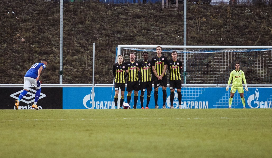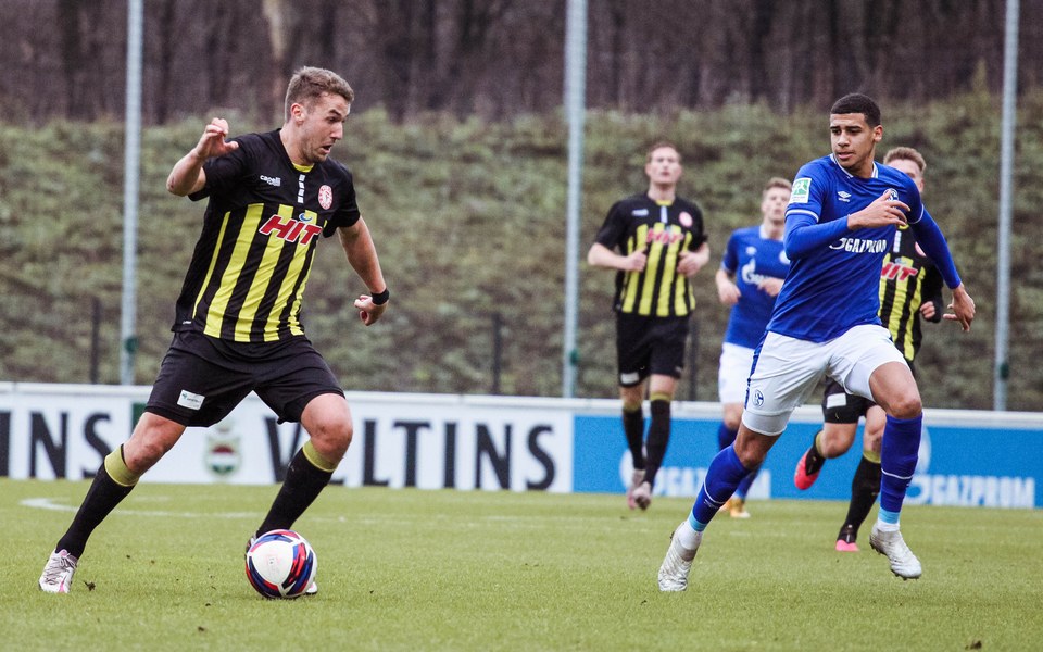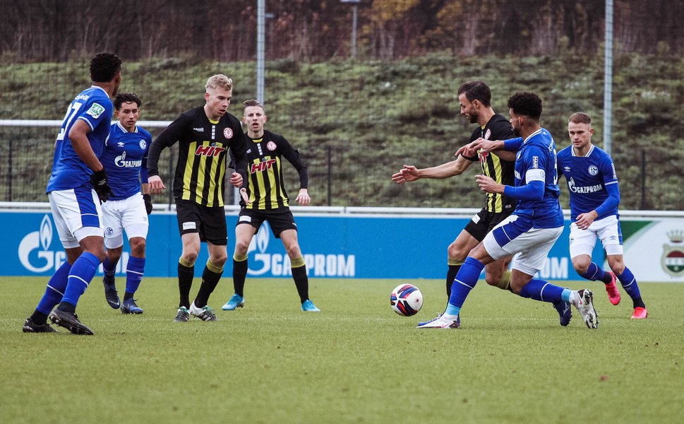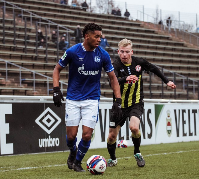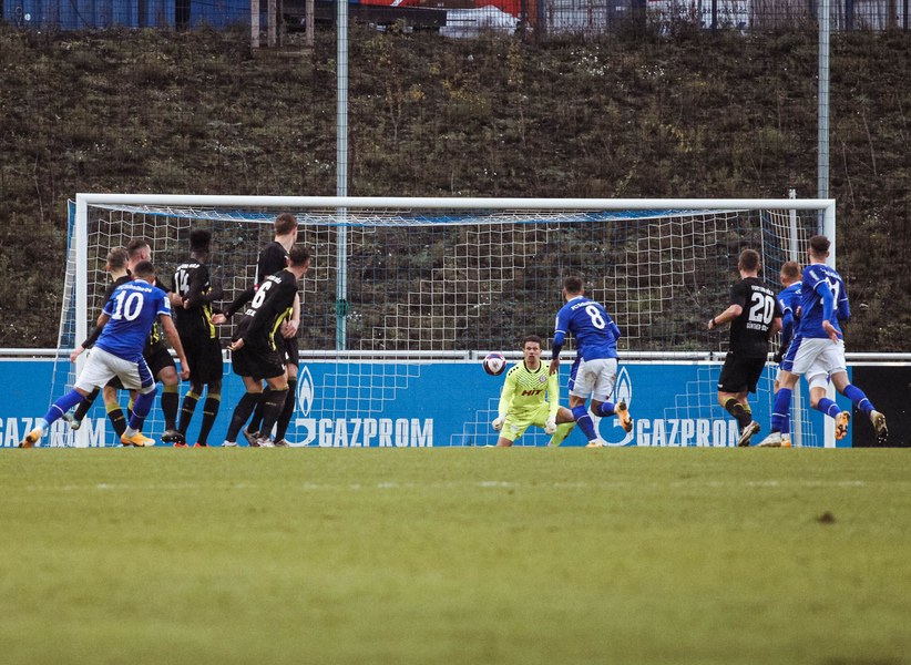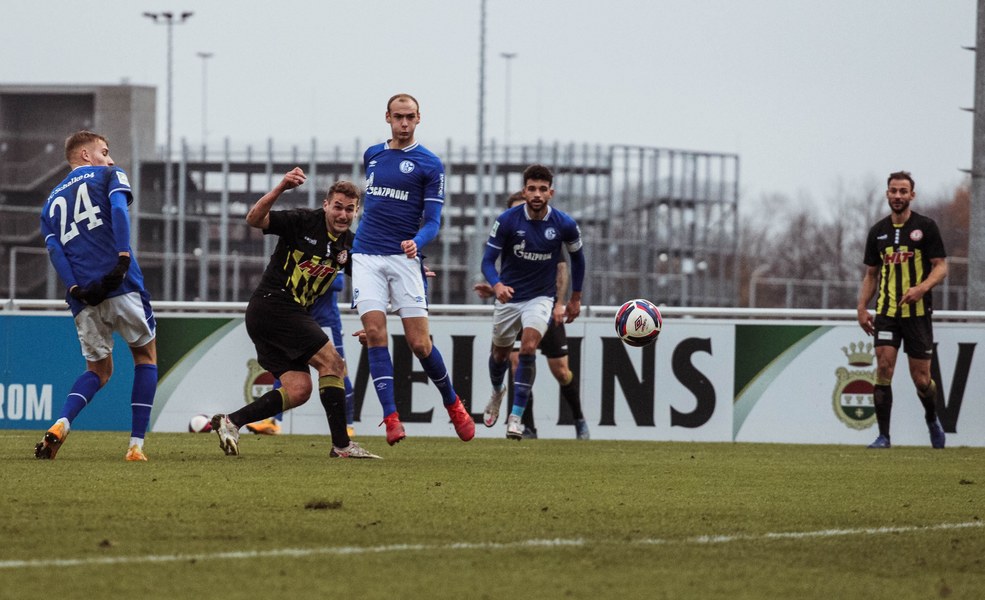 Nach anfänglichem Abtasten kam die Fortuna in der 5. Minute zur ersten Torannäherung. Timo Hölscher verlagerte das Spiel in die Mitte auf Hamza Salman. Der nahm mit einem schnellen Ball Francis Ubabuike mit. Fortunas Nummer 11 suchte aus gut 18 Metern den Abschluss, setzte den Ball aber über den Kasten. Auf der anderen Seite wurde es noch knapper. Weschenfelder-Scienza lief im spitzen Winkel alleine auf Rauhut zu. Fortunas Schlussmann bekam im letzten Moment noch den Fuß dazwischen und lenkte den Ball damit Zentimeter am langen Pfosten vorbei (8.). Die anschließende Ecke klärte die Fortuna und setzte gleich zum Konter an. Der in der Spitze von Prokoph verlängerte Ball landete jedoch in den Armen von Theißen, ehe Günther-Schmidt an das Spielgerät kommen konnte (8.). Es dauerte einige Zeit, bis sich das Spielgeschehen aus dem Mittelfeld wieder vor eines der Tore verlagerte – diesmal vor den Kasten von Kevin Rauhut. Jason Ceka tankte sich durch die Hintermannschaft der Südstädter und spielte auf Schuler ab. Der Schalker kam zwar zum Abschluss, stand dabei jedoch im Abseits (18.). Durch ein taktisches Foul kam die Fortuna zu ihrer nächsten Chance. Nachdem Salman gelegt wurde, setzte Ubabuike zum Freistoß an. Der Ball geriet aber zu lang und segelte an Freund und Feind vorbei (24.). Das weitere Spielgeschehen wurde von vielen kleineren Fouls geprägt, die der Schiedsrichterin immer wieder einen Pfiff entlockten. Ein richtiger Spielfluss kam so nur schwer zu Stande. Zudem setzte Schalke den ballführenden Spieler bereits früh unter Druck, sodass auch Fortunas Abwehr beim Spielaufbau immer wieder aufpassen musste. Nach 30 gespielten Minuten setzten dann Ubabuike und Günther-Schmidt Schalkes Timo Becker an der Schalker Eckfahne gemeinsam unter Druck und sicherten sich so den Ball. Die anschließende Flanke von Brandenburger verunglückte aber sichtlich und fand so in der Mitte keinen Abnehmer. Zwei Zeigerumdrehungen später zielte Diamant Berisha aus der Distanz auf den Kasten von Rauhut, verfehlte diesen aber deutlich (32.). Auch die Fortuna zeigte sich wenig erfolgreich, als sich Prokoph durch starken Einsatz den Ball sicherte, mit seinem Abschluss aber nur ein Schalker Abwehrbein traf. Besser machte es der Stürmer in der 38. Minute. Alleine vor dem Keeper umkurvte er diesen und schob den Ball in Richtung des leeren Tores. Dann aber der Pfiff. Abseits. Und, hier muss man ehrlich sein, das auch deutlich. Dann hieß es durchatmen bei der Fortuna. Wenige Sekunden vor dem Halbzeitpfiff tauchten die Knappen mit einer dicken Dreifach-Chance vor Rauhut auf. Nach einem geblockten Schuss, einem Pfostentreffer und einer weiteren Glanztat von Kevin Rauhut wurde der Ball aus der Gefahrenzone befördert und Fortunas Schlussmann hielt die Null zur Pause (45+1).