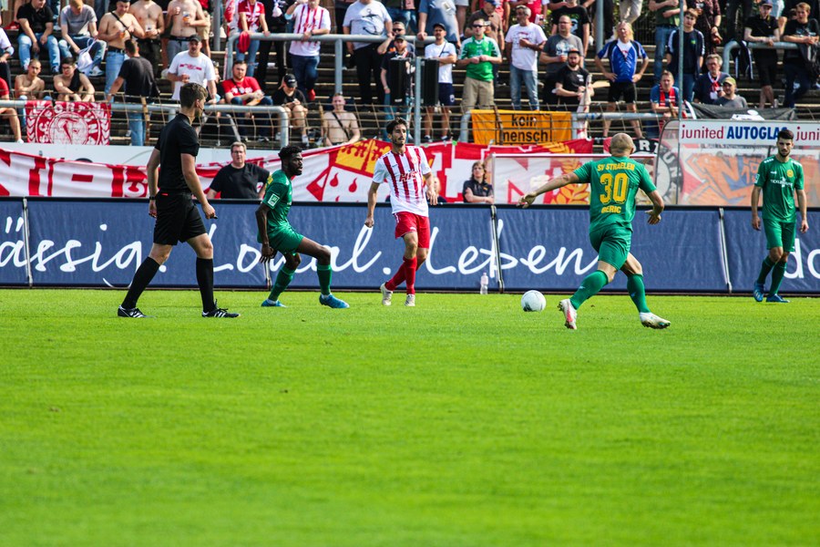 Das Spiel startete ruhig und ohne Chancen auf beiden Seiten. In der 8.Spielminute gab es die erste Chance für die Straelener, der Abschluss ging jedoch klar vorbei. Wenige Minuten später konnte sich die Fortuna zur ersten guten Torchance durchsetzen: nach einem schönen Pass stand Demaj frei, der sich in ein eins gegen eins mit Torwart Udegbe begab. Allerdings entschied der Schlussmann das Duell für sich. Im weiteren Spielverlauf waren die Straelener etwas besser im Spiel, aber zwingend vor das Tor der Südstädter kamen sie nicht. Dennoch bekamen die Fortunen ihre wenigen Chancen, können diese jedoch nicht verarbeiten und der Ball landete neben dem Tor. Bereits in der 36. Minute wechselte Trainer Alexander Ende das erste Mal aus. Für Timo Hölscher kam Kai Försterling auf den Platz.