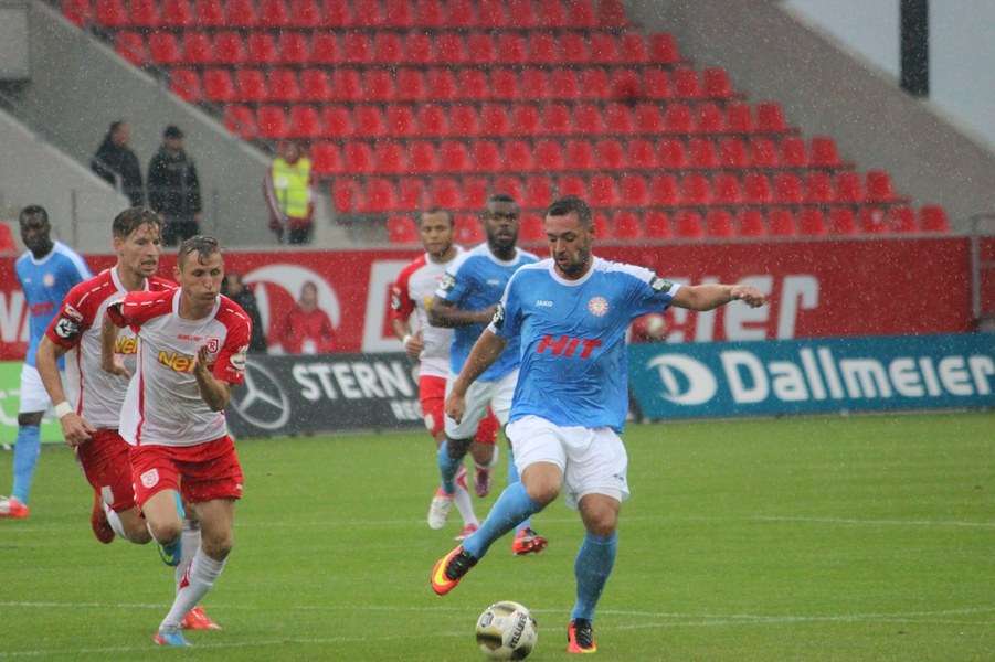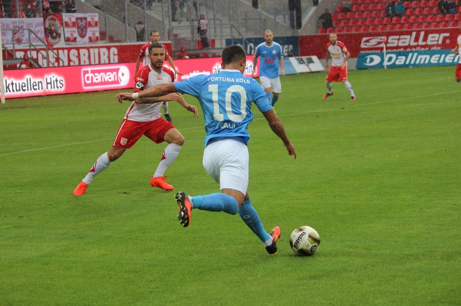Bei starkem Regen versuchte Regensburg früh die Kontrolle über die Partie zu bekommen. Lais und Pusch setzten dabei auf nassem Geläuf erste offensive Nadelstiche (2./3.). Die Fortuna passte sich aber schnell an die Rahmenbedingungen an und versuchte mit einer robusten Defensive ins Spiel zu kommen. Nach einem abgefälschten Schuss von Souza (7.) meldete man sich besonders mit harten, aber fairen Zweikämpfen an. Spielerisch taten sich beide Teams schwer, richtig Druck aufzubauen. So waren es vor allem Einzelaktionen oder Standards, die ansatzweise Torgefahr versprühten. Erst Mitte der Halbzeit sorgte eine Kombination über Engelman, Brasnic und Dahmani für den ersten spielerischen Abschluss (24.). Die Fortuna zeigte sich nun aber fortlaufend dominanter: Nach einer Engelman-Flanke musste Pentke so einen Kopfball von Brasnic in höchster Not klären (28.). Ein paar Minuten später war der SSV-Keeper aber machtlos: Nach Vorarbeit Souza brachte Dahmani einen Flachschuss überlegt im Tor unter - 1:0 für die Fortuna (32.). Der Gegentreffer schockte den Jahn und die Fortuna hätte aus der Verunsicherung beinahe Kapital geschlagen: Nach einem Konter lief Souza alleine auf Pentke zu, am Ende fehlte dem Fortunen aber die Kraft (38.). In die beste Phase der Fortuna hinein kam dann allerdings ein Schockmoment: Maik Kegel musste ohne Gegnereinwirkung verletzt ausgewechselt werden, für ihn kam Alibaz (40.). Die Fortuna verdaute die Szene aber gut und hatte mit einem Schuss von Alibaz die letzte Chance der ersten Hälfte (45.).