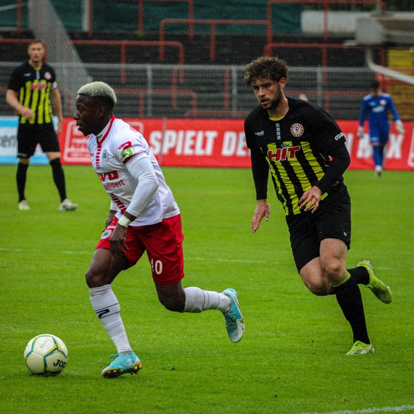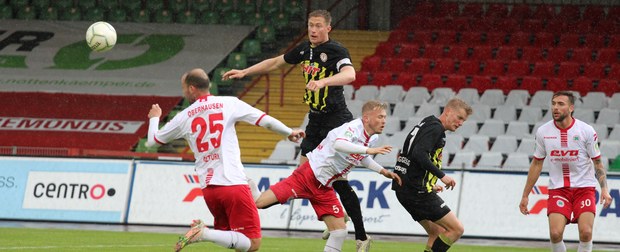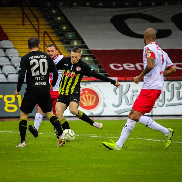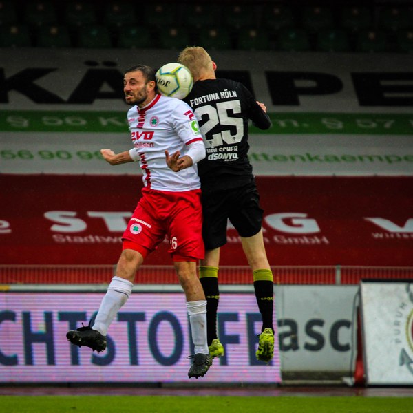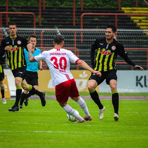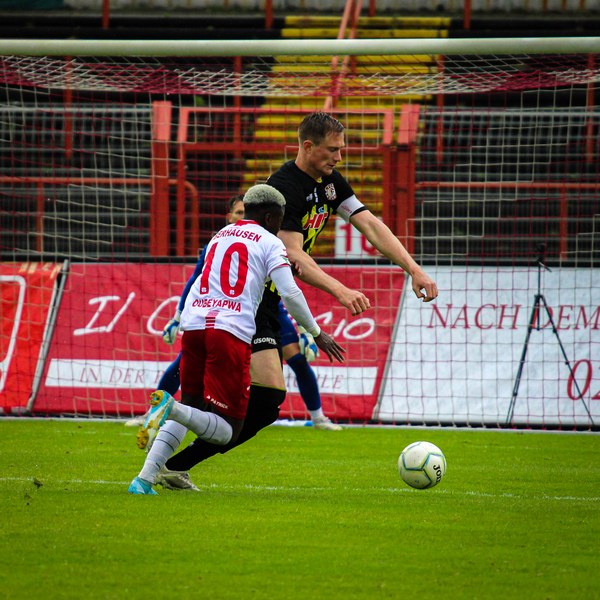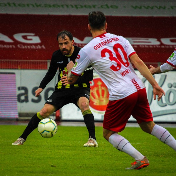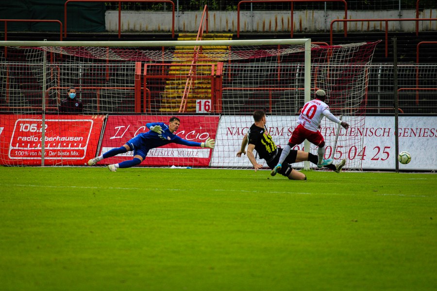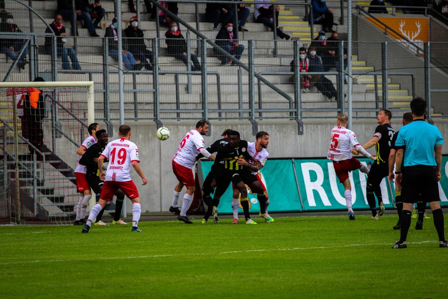 Nachdem die Fortuna am Mittwoch noch im Bitburg-Pokal angetreten ist, stand heute wieder Ligaalltag auf dem Programm. Der Tabellensiebte aus Oberhausen durfte heute nach langer Zeit wieder Zuschauer im Stadion begrüßen. 500 Fans empfingen die Mannschaften lautstark auf dem Spielfeld. Im Vergleich zum Pokalspiel vor wenigen Tagen nahm Alexander Ende nur einen einzigen Wechsel vor: Für Hamza Salman stand Pascal Itter in der Startelf. In Oberhausen regnete es auch vor Anpfiff schon ununterbrochen, weshalb einige Spieler auf dem nassen Rasen den Halt verloren und wegrutschten. Jan-Luca Rumpf holte sich in einem intensiven Spiel schon früh die gelbe Karte ab, nachdem er seinen Gegner umgrätschte (7. Min.). Die vielen Ballverluste und die damit verbundenen Ballbesitzwechsel führten dazu, dass der Beginn der Partie sehr hektisch wirkte. Ein leichtsinniger Ballverlust in der Vorwärtsbewegung von Timo Hölscher leitete beinahe die Führung der Gastgeber ein. Ein Steckpass landete bei Oubeyapwa, in seinen Abschluss warf sich Lanius rein und klärte gerade noch zur Ecke. Der anschließende Eckball ließ die Zuschauer dann jubeln. Das Spielgerät wurde an den zweiten Pfosten befördert, dort stand Terada bereit, der per Kopf den 1:0 Führungstreffer erzielte (12. Min.). Die Fortuna lag früh zurück, fand aber auch nach dem Rückschlag nicht wirklich in die Partie. Das Spiel der Fortuna war teilweise sehr überhastet und sie schafften es kaum den Ball über mehrere Stationen laufen zu lassen. Rot-Weiß Oberhausen kam dagegen öfter in die Nähe des gegnerischen Tores und holte zumindest immer mal wieder einen Eckball raus. Die erste gefährliche Aktion auf Seiten der Fortuna leitete Hölscher ein. Der zentrale Mittelfeldspieler spielte einen punktgenauen Ball in den Lauf von Suheyel Najar. Er rannte auf das gegnerische Tor und suchte den Abschluss. Fassnacht, der im Vollsprint angerauscht kam, schmiss sich dazwischen und konnte den Gegentreffer verhindern (25. Min.). Das sollte auch die einzige nennenswerte Chance in Durchgang eins für die Fortuna bleiben. Der Torschütze Terada hätte beinahe einen Doppelpack geschnürt. Ausgang war eine schöne Kombination der Kleeblätter, bevor Terada das Leder knapp rechts am Kasten von Rauhut vorbeisetzte (32. Min.). Fortuna Cheftrainer Alexander Ende wechselte bereits vor dem Pausenpfiff und brachte den von seiner Verletzung zurückgekehrten Maik Kegel. Für ihn räumte Kai Försterling das Feld, der bereits mit einer gelben Karte belastet war (39. Min.). Bevor es für beide Mannschaften in die Kabinen ging, hatten die Oberhausener erneut eine gute Möglichkeit. Kreyer ließ die komplette Abwehr der Fortuna alles andere als gut aussehen und tanzte die Hintermannschaft im Strafraum aus. Sein abgeblockter Schuss landete beim Oberhausener Topscorer Oubeyapwa. Aus guter Position konnte sein Abschluss ebenfalls gerade noch abgewehrt werden (42. Min.). Kurz darauf pfiff Schiedsrichter Schäfer zur Halbzeit.