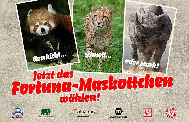 Seit Freitag, dem 27. März 2015, könnt Ihr das neue Fortuna-Maskottchen wählen: Dabei stehen drei vom Aussterben bedrohte Tiere zu Auswahl, die im Kölner Zoo eine Heimat gefunden haben. Macht die Maskottchen-Wahl zu Eurer Wahl und gewinnt attraktive Preise der Fortuna-Partner.