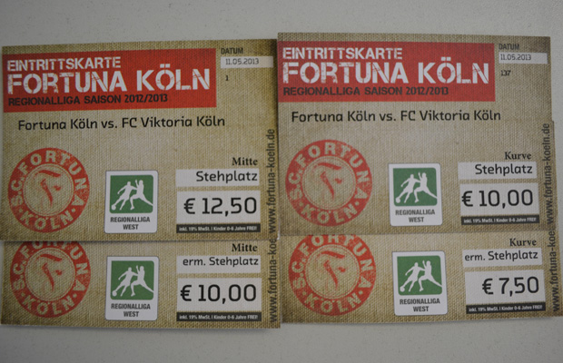 Am morgigen Dienstag startet der Vorverkauf der Stehplatzkarten für das Heimspiel gegen den FC Viktoria Köln (Samstag, 11. Mai 2013). Die Tickets können wie gewohnt an unseren Vorverkaufsstellen Lotto Kluth (Höninger Weg 184, 50969 Köln), Lotto Burckhardt (Gottesweg 23, 50969 Köln) und Weinparadies Hürth (Weierstraße 43, 50354 Hürth) sowie im Fortuna-Fanshop (Severinsstraße 81, 50678 Köln) erworben werden. Die Preise für die verschiedenen Bereiche lauten wie folgt: