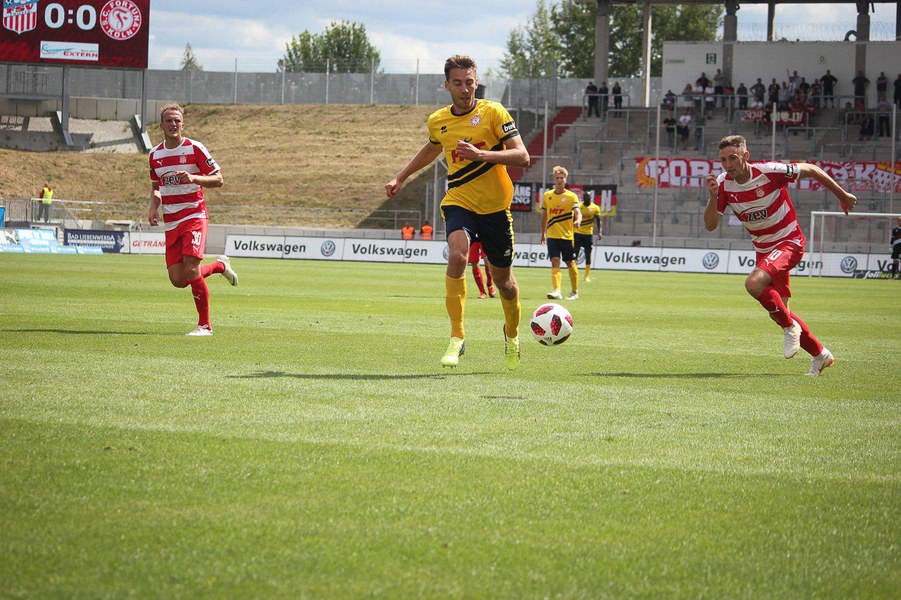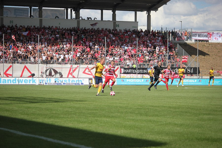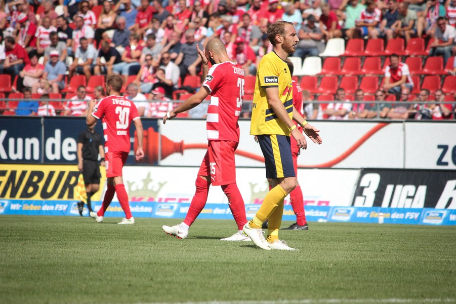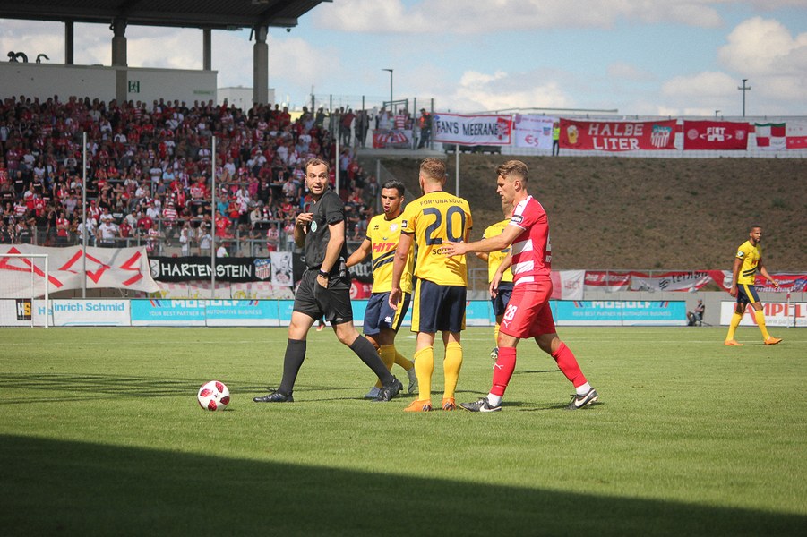 Die Teams ließen sich etwas Zeit, bis sich die Statistikzettel der Medienvertreter füllten. Das Tempo der Partie war zunächst nicht so hoch wie noch bei hochsommerlichen Temperaturen unter der Woche gegen den Karlsruher SC. Die Anfangsphase dieses Auswärtsspiels war geprägt von kleineren Fouls und Ungenauigkeiten. Auch nach einer Viertelstunde waren beide Torhüter noch nicht wirklich gefordert. Die Fortuna versuchte es neben einigen spielerischen Ansätzen auch oft, Michael Eberwein mit einem langen Ball aus der Defensive zu erreichen und so durch den verlängerten Ball per Kopf Moritz Hartmann ins Spiel zu bringen. Nach rund zwanzig Minuten entwickelte die Fortuna ein leichtes Übergewicht in Sachen Ballbesitz. Immer wieder spielte man sich gefällig bis an den Strafraum der Gastgeber heran. Die beste Chance bis dahin hatte Hartmann, als er aus der Drehung an Brinkies scheiterte (27.). Dabei blieb es vorerst auch, auch wenn die Fortuna die langen Bälle seltener werden ließ und sich teils konzentriert in die Hälfte des FSV kombinierte. Dennoch waren es die Schwäne, die gegen Ende der ersten Hälfte so etwas wie eine Chancen hatten, als Reinhardt es flach aus der Distanz versuchte (41.). Das sollte es dann für die erste Spielhälfte gewesen sein.