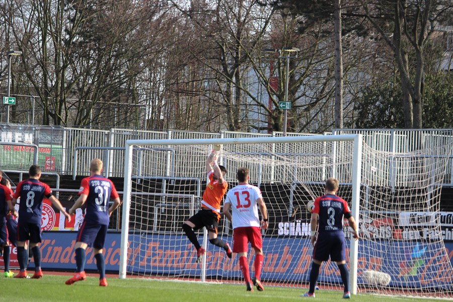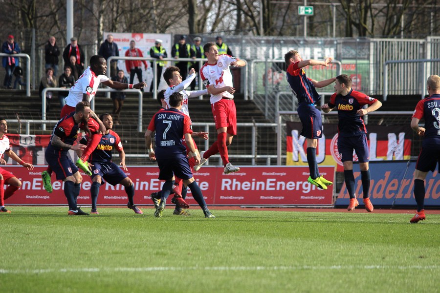 Von Beginn an entwickelte sich eine kurzweilige und temporreiche Partie im Südstadion. Die Fortuna zeigte sich dabei mutig, störte früh und suchte den Weg nach vorne: Souza verbuchte die erste Offensivaktion (6.). Danach meldete sich aber auch Regensburg an. Dem Jahn war das Selbstvertrauen, das man im Jahr 2017 noch ohne Niederlage war, anzumerken: So tauchte George vor Boss auf (7.). Kurz darauf probierte sich Grüttner an einem Fallrückzieher und Lais zwang Boss per Kopf zur Parade (10./11.). Immer wenn speziell Thommy ins Laufen kam, wurde es bei den Gästen gefährlich. Nach und nach stellte sich Rechtsverteidiger Engelman aber gut auf den Regensburger ein. Ein Ballgewinn von Engelman war dabei eine Initialzündung: Danach näherte sich Dahmani mit zwein Versuchen dem Tor von Pentke an (22./23.). Zudem scheiterte Souza nach einer Einzelaktion am Außennetz (27.). Danach lauerten beide Teams auf Fehler des Gegners, es passierte zunächst wenig. Kurz vor der Pause wurde es aber ereignisreich: Zunächst markierte Grüttner nach einem Solo von Thommy die Führung für Regensburg (44.). Im Gegenzug scheiterte Theisen an Jahn-Schlussmann Pentke (45.). Es hätte aber noch schlimmer werden können für die Fortuna, als Boss in höchster Not nach einem Konter gegen George klären musste (45.). So ging es mit dem 0:1 in die Pause.