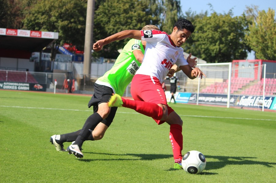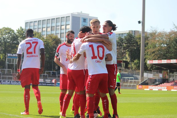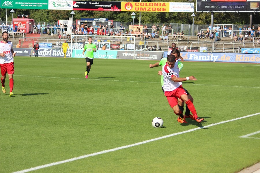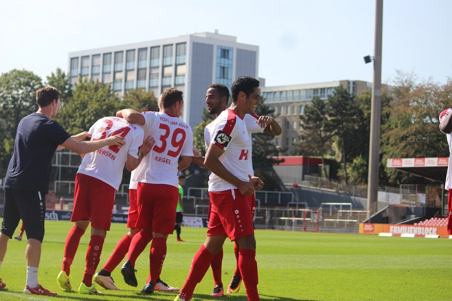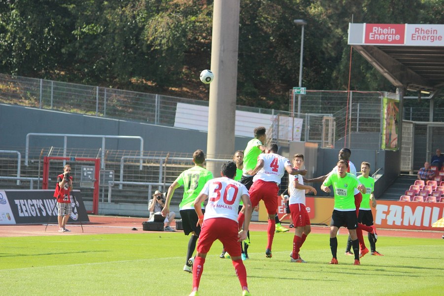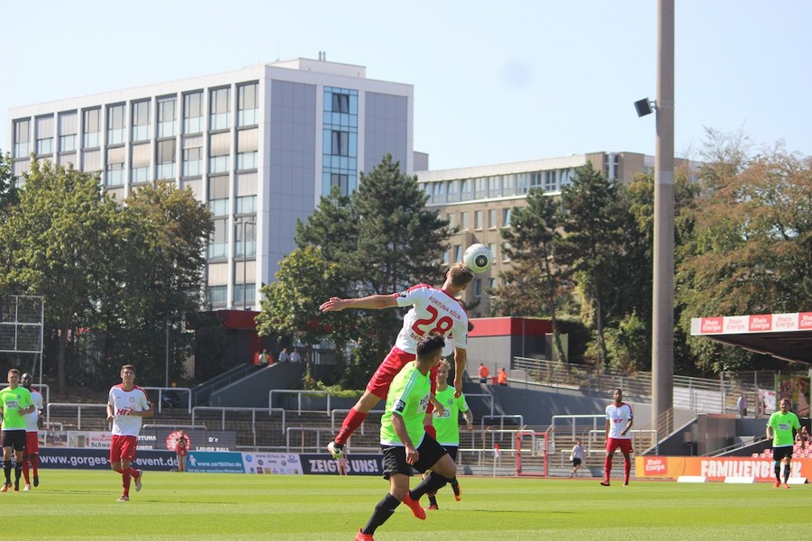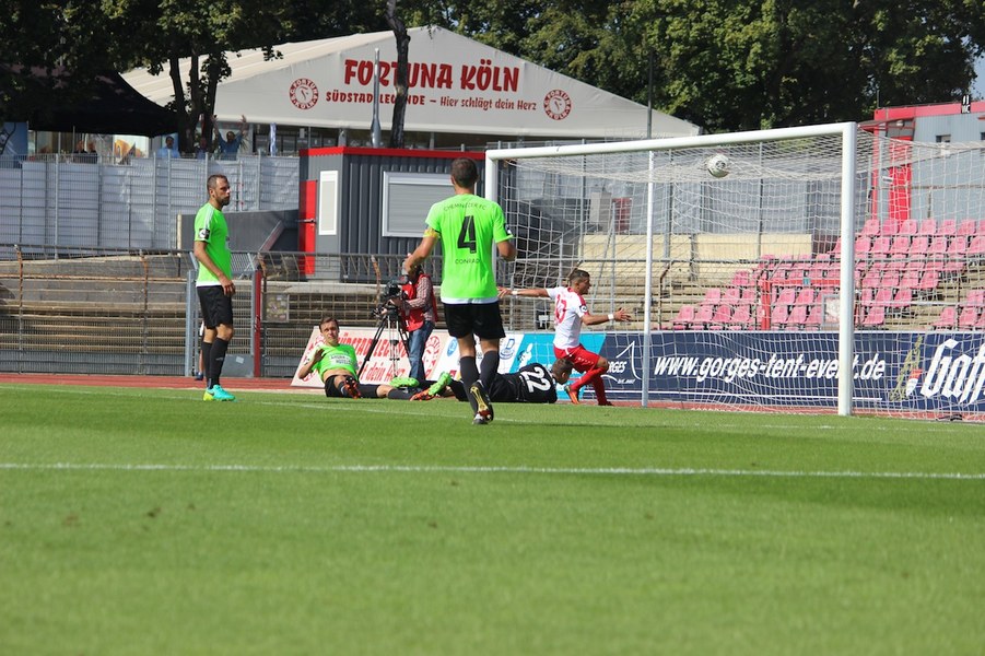 Dabei gab es im Südstadion zunächst eine vorsitichtige Anfangsphase zu sehen, die nur von einem Highlight gestört wurde - das hatte es aber in sich: Nach einem Einwurf hatte Frahn aus nächster Nähe die Führung auf dem Fuß, scheiterte aber an Poggenborg (5.). Ansonsten versuchten beide Teams fußballerisch in die Partie zu finden, auch wenn die Fortuna über Kegel den einen oder anderen Diagonalball einstreute. Beide Teams waren aber auf Kontrolle bedacht und versuchten Fehler zu vermeiden. Erst Mitte der 1. Halbzeit wurde es lebendiger: Nachdem Uaferro nach der ersten Ecke die erste Kölner Offensivaktion verbuchte (13.), hatte Koruk bei seinem Drittliga-Startelfdebüt die Fortuna-Führung nach einem Kegel-Freistoß auf dem Kopf (23.). Es war das Lauern auf das 1:0 im Südstadion, wobei Chemnitz dem Tor in seinen Aktionen näher war: Zunächst streifte ein Schuss von Frahn am langen Pfosten vorbei (23.). Kurz darauf küsste Cincotta mit einem fulminanten Lattentreffer das Südstadion wach (25.). Es war der Weckruf für die Fortuna, die den entsprechend aufnahm: Nach einem Angriff von Chemnitz konterten die Kölner mustergültig: Andersen trieb den Ball durchs Mittelfeld in Richtung Dahmani, der vor dem Tor exakt in den Lauf von Souza legte - 1:0 für die Fortuna (33.). Der Schock saß bei Chemnitz, die sich schwer taten, eine Antwort zu finden. Immer wieder versuchte man das Sturmduo Frahn und Fink zu finden. In gefährliche Abschlusspositionen kamen die beiden aber nicht. So blieb es bei der Führung für die Fortuna zur Pause.