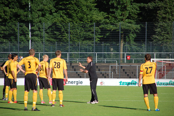 Vor rund 500 Zuschauern im Kölner Franz-Kremer-Stadion entwickelte sich von Beginn an eine temporeiche Partie. Dabei erwischte die U21 des 1. FC Köln den besseren Start. Nach einer schönen Kombination über die rechte Seite rettete der Pfosten für den schon geschlagenen Fortuna-Schlussmann Poggenborg. Die Fortuna fand Anfangs überhaupt nicht in die Partie und leistete sich viele kleine Ungenauigkeiten im Passspiel. Die Gastgeber nutzen die Fehler aus. Mittelfeldspieler Stefan Thelen erzielte nach einem schnellen Gegenstoß die 1:0-Führung (24. Minute). „Der FC agierte taktisch sehr gut. Wir haben in der ersten Halbzeit überhaupt nicht in die Partie gefunden“, resümierte Chefcoach Uwe Koschinat nach dem Spiel.