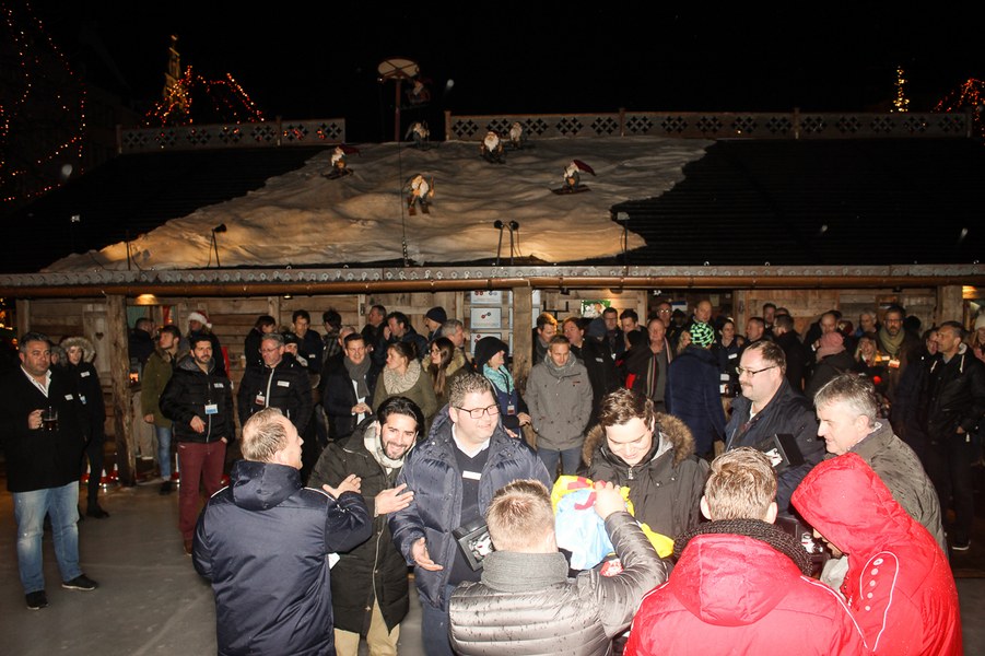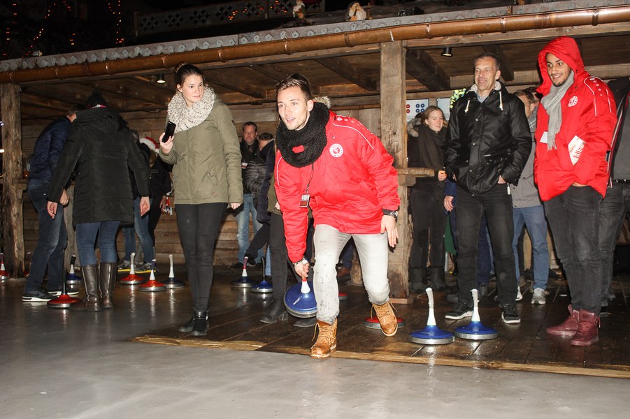 Nach einer Begrüßung von Benjamin Bruns, Mitglied der Geschäftsleitung Fortuna Köln und Sascha Müller, Leiter Vertriebssteuerung & Marketing Gruppe Procar Automobile, gab es zunächst eine herzhafte Brotzeit zur Stärkung. Anschließend ging es an die Eisstockbahn. In zwei Gruppen mit gemischten Teams wurden dann die Eisstöcke fleißig in Richtung Daube befördert. Am erfolgreichsten war dabei das Team von den Fortuna-Profis Tim Boss und Hamdi Dahmani sowie Christian Schardt von der Weinmanufaktur Christian Schardt und Peter Schmitz von der Bäckerei Schmitz & Nittenwilm.