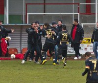 (Auch das Trainerteam und die Ersatzspieler freuen sich mit Abdelkader Maouel über dessen wunderschönes Freistoßtor, Foto: Gert König)