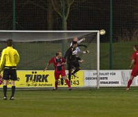 (Der Wegberger Torwart Sascha Rodemers, hier im Duell mit Handi Dahmani, war zu bedauern - gleich dreimal musste er den Ball aus dem eigenen Netz holen, Foto: Gert König)