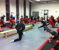Gleich beim ersten Training des neuen Jahres musste das Trainerteam um Matthias Mink improvisieren. Das Flutlicht der Ostkampfbahn versagte seinen Dienst, so dass die Spieler eine Kräftigungseinheit, unter der Leitung von Physiotherapeut Christian Osebold, absolvierten. Zuvor stand aber das obligatorische Wiegen auf dem Programm - hier wurde schonungslos aufgedeckt, wer sich an die Vorgaben gehalten hatte. Einsamer Spitzenreiter dabei Kevin...