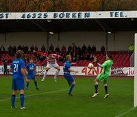 (Fabian Montabell erzielt per Kopfball die Führung gegen die Sportfreunde Siegen, Pedro Miletic hat keine Chance, Foto: Gert König)