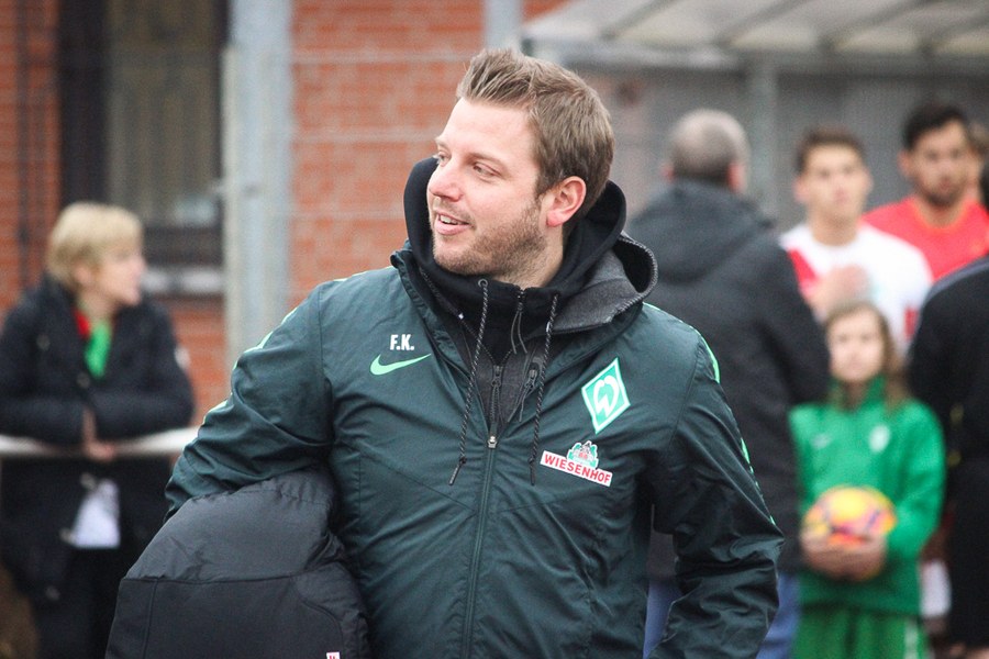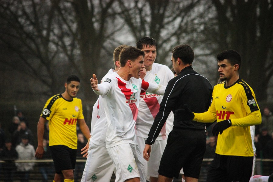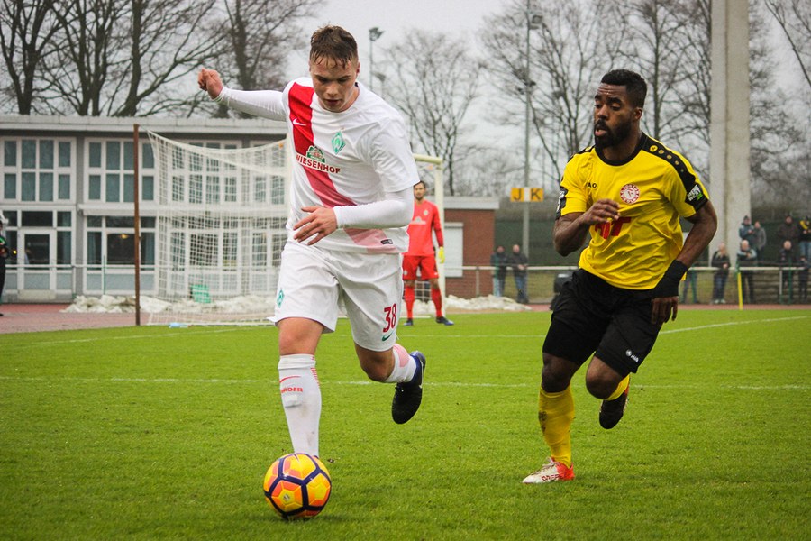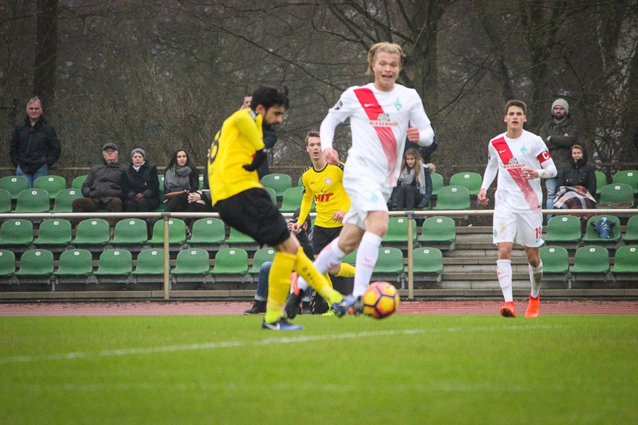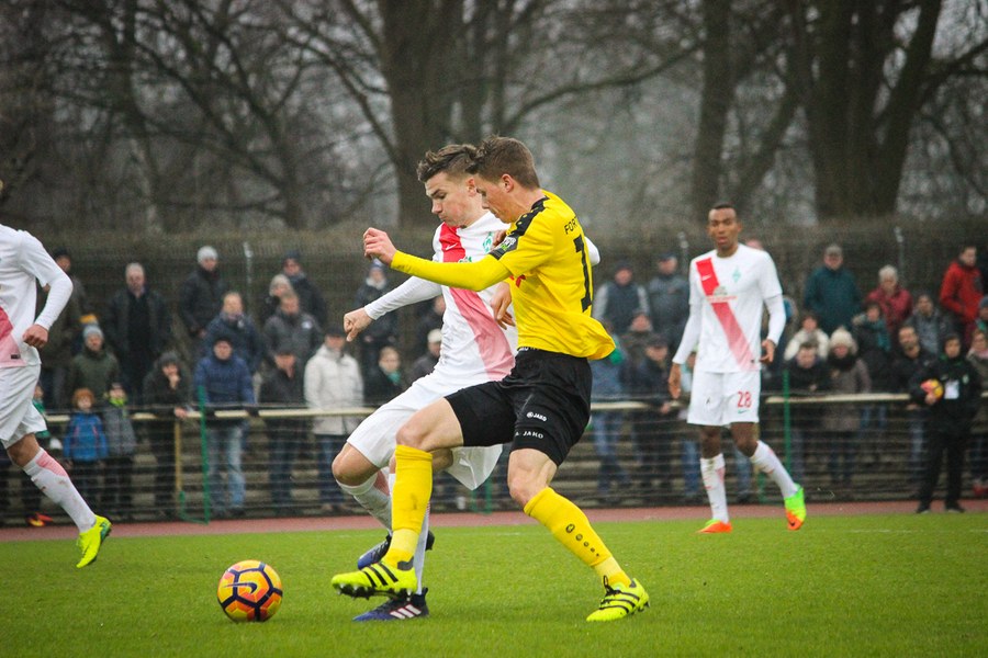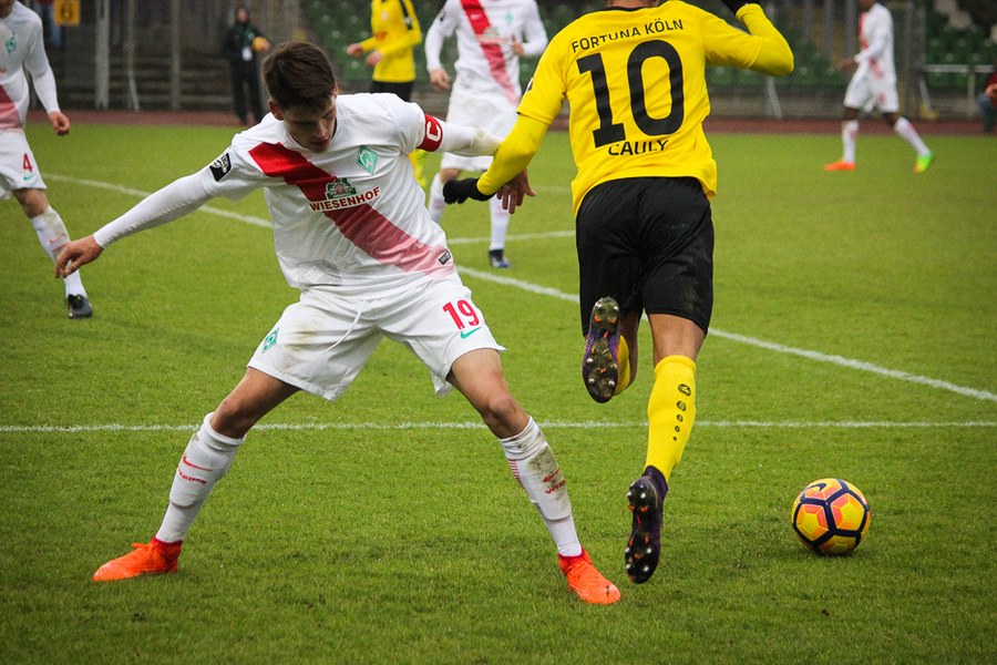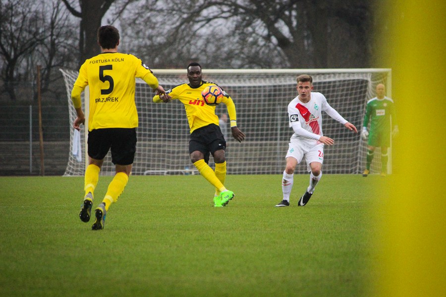Die Fortuna versuchte früh, Kontrolle auf das Spiel zu bekommen und Dominanz auszuüben. Bremen ließ die Südstädter erstmal kommen, um dann auf Konter zu lauern. Zwei solcher Möglichkeiten ergaben sich früh dabei über die Profileihgabe Eilers (3.) und Stürmer Eggestein (6.). Die Fortuna suchte nun mit Bedacht die Offensive, sollte aber die erste große Möglichkeit bekommen: Nach Flanke Theisen, kam Alibaz frei vor Oeschlägel zum Abschluss, scheiterte aber am Werder-Keeper (13.). Die Kölner taten sich aber schwer, die Partie in den Griff zu bekommen. Bremen lauerte auf Fehler und schaltete blitzschnell um. So tauchte wieder Eilers frei vor Poggenborg auf, traf aber nur den Pfosten (17.). Es blieb allerdings eine zähe Angelegenheit. Auf nassem Rasen schlichen sich auf beiden Seiten Fehler ein, sodass kein Spielfluß aufkommen wollte. Aus dem Nichts hatte die Fortuna dann die Chance zur Führung, als Souza nach feiner Einzelaktion im Strafraum zu Fall gebracht wurde. Den fälligen Elfmeter konnte Oelschlägel aber gegen Dahmani parieren (30.). Kurz darauf drohte Werder beinahe der nächste Strafstoß. Schiedsrichter Osmanagic ahndete Oelschlägels Einsteigen gegen Theisen nach Rücksprache mit dem Linienrichter aber nicht als Foul (32.). Das Spiel wurde nun hektischer und kurz or der Pause sorgte dann Schmidt für das Highlight bis dato: Aus 35 Metern zimmerte der Bremer den Ball unhaltbar für Poggenborg zur Werder-Führung unter die Latte (41.). Mit dem Ergebnis ging es in die Kabine.