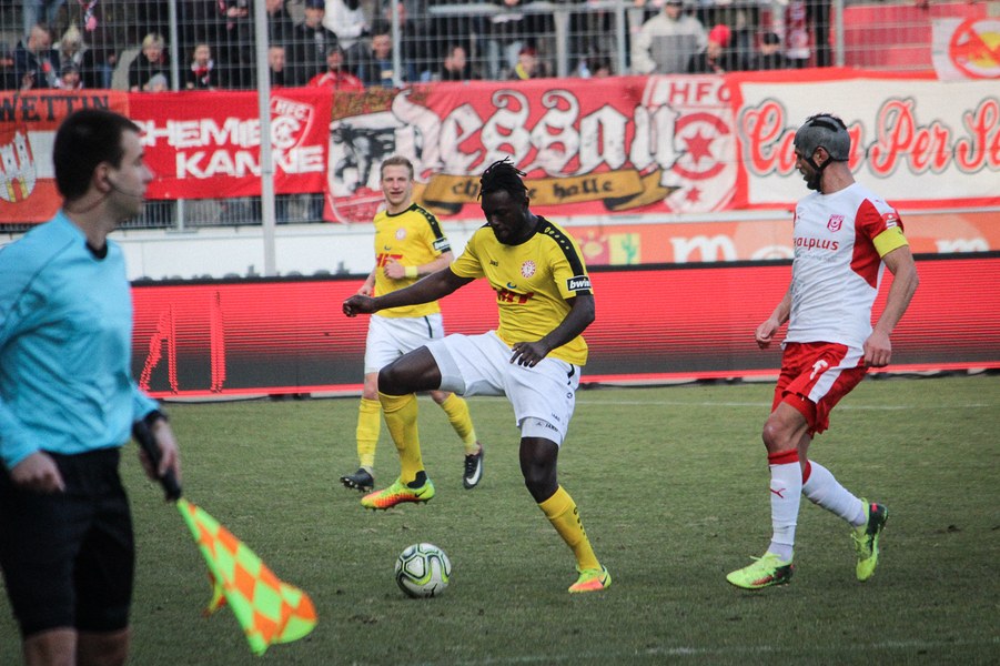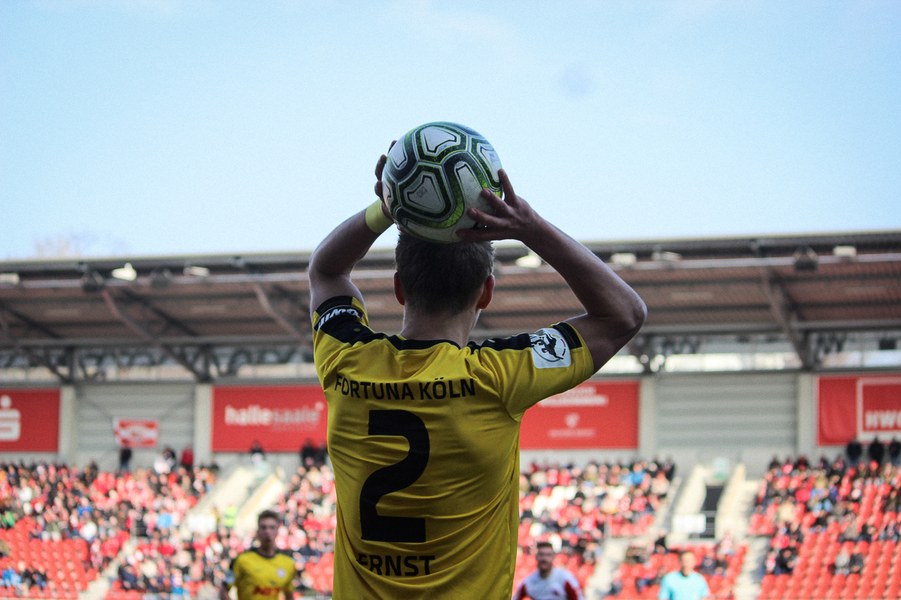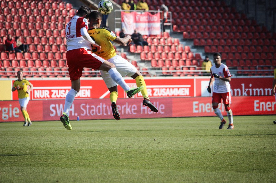Nach zwei Siegen in Folge ging die Fortuna mit einer breiten Brust in die Partie beim angeschlagenen Halleschen FC. Dabei gelang den Kölnern fast ein Traumstart: Nach 25 Sekunden lief Keita-Ruel alleine auf Oliver Schnitzler zu. Der Torhüter machte sich aber groß und konnte den frühen Rückstand verhindern (1.). Ein paar Minuten später war es erneut Keita-Ruel: Nach einem Pass von Kegel konnte er den Ball an Schnitzler vorbei ins Tor lupfen. Der Schiedsrichter entschied allerdings auf Abseits (8.). Danach fanden auch die Gastgeber besser ins Spiel. Vor allem über die rechte Seite mit dem auffälligen Ajani drückte man die Fortuna in die eigene Hälfte. Torchancen konnten sie sich jedoch noch nicht heraus spielen. In diese Phase fiel dann die Führung der Fortuna: Kegel schickte Ernst mit einem langen Ball tief in die gegnerische Hälfte. Dort legte er den Ball in den Strafraum zu Keita-Ruel, der durch die Beine von Schnitzler köpfte (21.). Halle ließ sich vom Rückstand aber nicht beeindrucken und entwickelte mehr Zug zum Tor. Kurz nach der Kölner Führung verpasste Gjasula eine Ajani-Hereingabe nur knapp (23.). Es entwickelte sich daraufhin eine ausgeglichene Partie, in der sich der HFC aber ein optisches Übergewicht erspielte vor allem über die Außen Gefahr aufbaute. Lindenhahn und Gjasula kamen so zu aussichtsreichen Möglichkeiten (28./33.). Die größte Chance verbuchte El-Helwe, der seinen Meister aber in Boss fand (42.). Die Fortuna fand sich vornehmlich in der Defensive wieder und schaffte nur mit einem Distanzschuss von Pulido mal Entlastung (45.). Es blieb aber bei der Pausenführung.