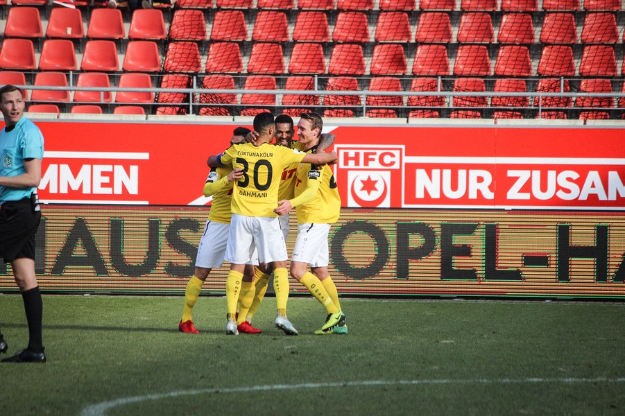 In der 2. Halbzeit erwischte die Fortuna ebenfalls einen guten Start, zeigte sich dieses Mal aber kaltschnäuziger. Nach einem Kegel-Freistoß konnte sich Brandenburger den Abpraller sichern und schob humorlos zum 2:0 ein (56.). Das schnelle 2:0 der Kölner zog dem Erdgas-Sportpark den Stecker, auch wenn die Fortuna danach Glück: Baumgärtel wurde nach einem Eckball alleine gelassen. Der Hallenser verzog allerdings und sein Schuss ging knapp am Pfosten vorbei (63.). Auch danach drückte der HFC auf den Anschlusstreffer. Boss warf sich mit vollen Risiko in eine Fetsch-Hereingabe (66.). Die Fortuna ließ sich nicht beeinducken und suchte die Entscheidung. Nach einem Brandenburger-Zuspiel verpasste Dahmani den Abschluss und die Hallenser konnten die Situation klären (74.). Kurz darauf entschieden die Südstädter aber die Partie! Nach einem Konter marschierte Menz mit nach vorne und schob nach Zuspiel von Keita-Ruel einskalt zum 3:0 ein (76.) Der HFC probierten zwar noch den Ehrentreffer zu erzielen, aber die Defensive der Fortuna stand sicher. Schließlich hatte die Fortuna noch die Chance auf ein weiteres Tor, aber Dahmani konnte den Ball nicht an Schnitzler vorbei bringen (89.). Am Ende feierten die Kölner den ersten Auswärtssieg seit September letzten Jahres und rückt ganz dicht an die Aufstiegsplätze heran.