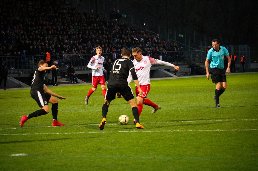 Und entsprechend selbstbewusst starteten die Gastgeber in das Spiel. Der Tabellenführer der Regionalliga West erarbeitete sich zu Beginn mehr Spielanteile gegen den Drittligisten – allerdings ohne dabei große Gefahr auszustrahlen.