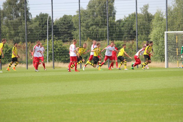 Der zweite Abschnitt sollte sich dabei ausgeglichener gestalten. Der BVB kam nun besser ins Spiel und brachte die Kölner Abwehr ein ums andere Mal in Bedrängnis. Schließlich fiel nach einer guten Stunde der inzwischen verdiente Ausgleich für den jungen BVB, als Mainka zum 1:1 einschob (64.). Lange sah es so aus als ob beide Mannschaften zufrieden mit dem Ergebnis waren, da Torchancen in der Folge ausblieben. Trotzdem sollte es zu einer ereignisreichen Schlussphase kommen: Die Fortuna investierte wieder mehr in die Partie und belohnte sich mit dem 2:1 durch Serhat Koruk (80.). Jedoch sollte der direkte Gegenangriff für kurzzeitige Ernüchterung bei den Kölner sorgen: Der BVB kombinierte sich durch die Abwehr, ehe Al Ghaddioui nur noch seinen Fuß zum 2:2-Ausgleich hinhalten musste (81.). Die Südstädter zeigte aber Moral und erkämpfte sich einen am Ende verdienten Testspielsieg: Serhat Koruk preschte in der 87. Minute in den Strafraum und legte perfekt auf Christopher Theisen ab. Dieser schenkte der Fortuna die dritte Führung im Spiel und brachte den Ball zum 2:3-Endstand im Dortmunder-Tor unter (87.).