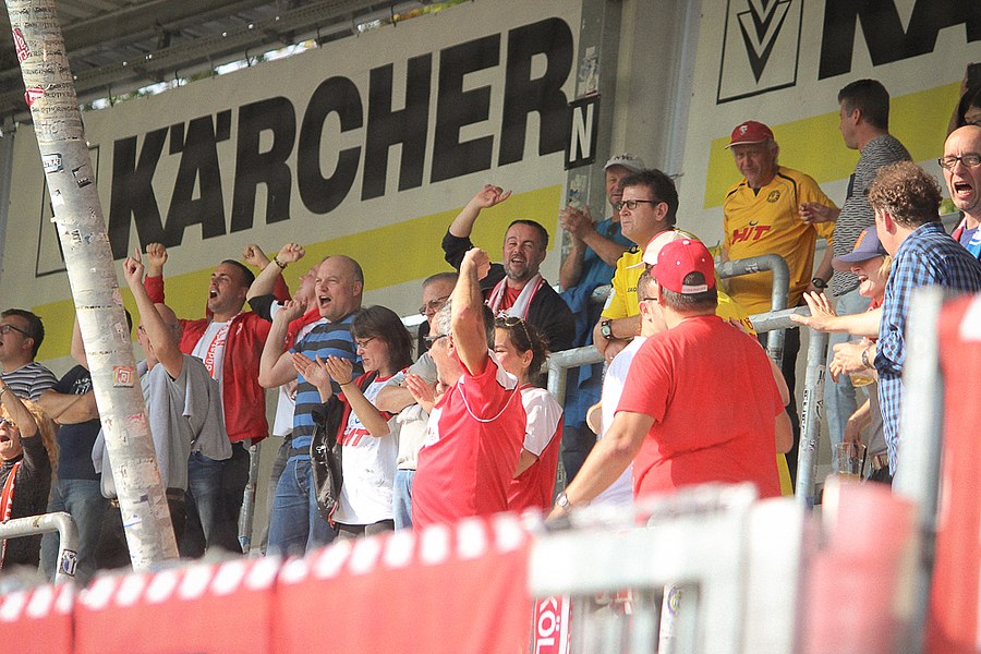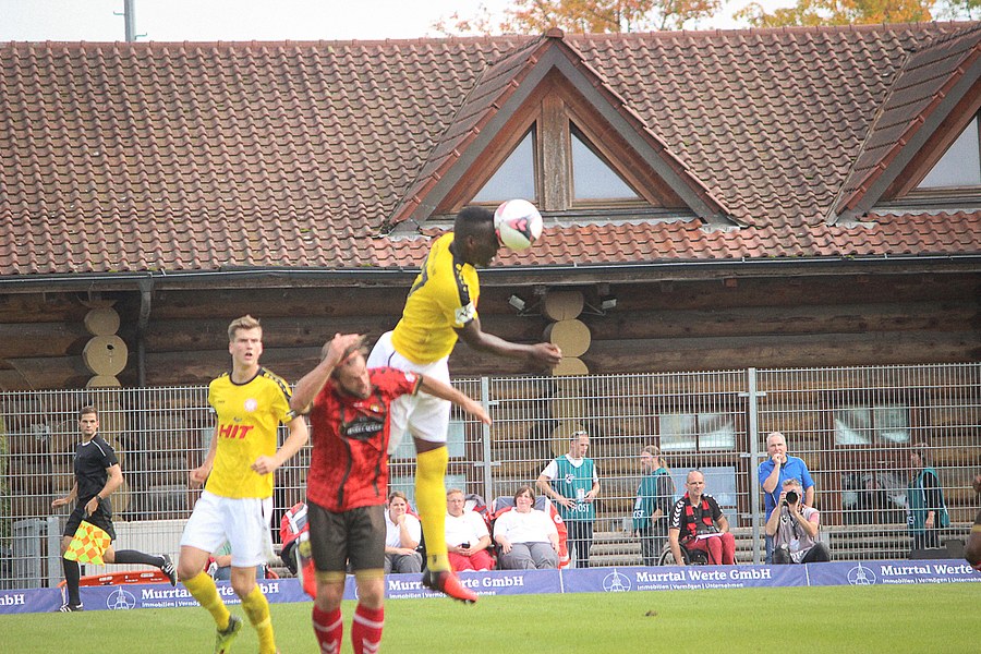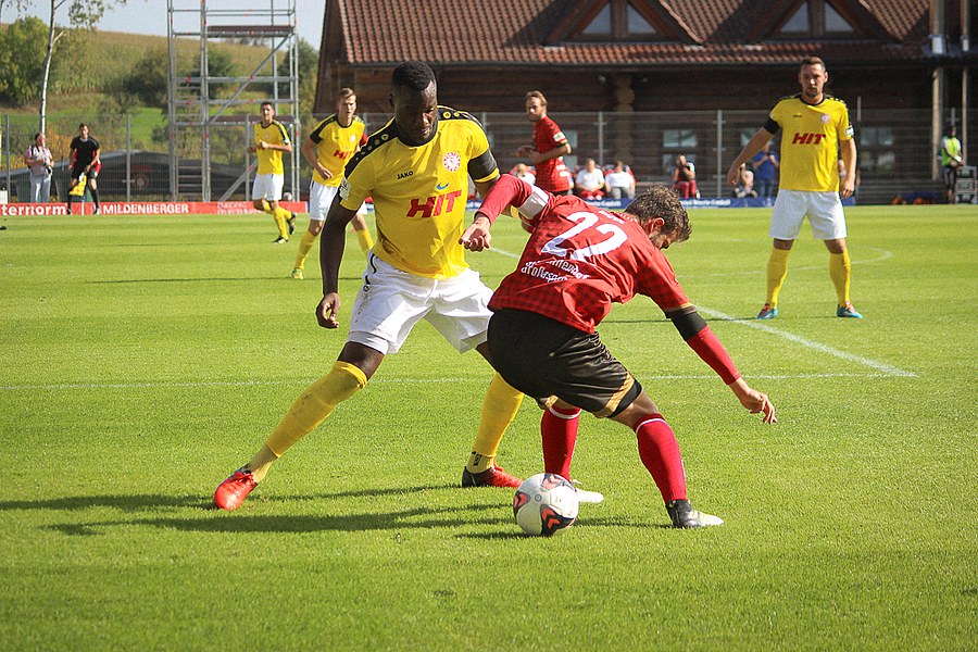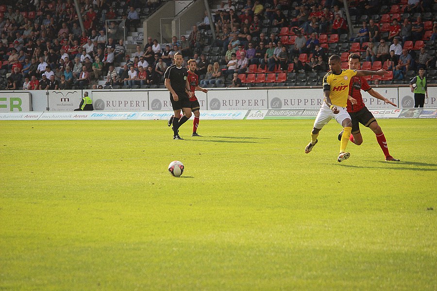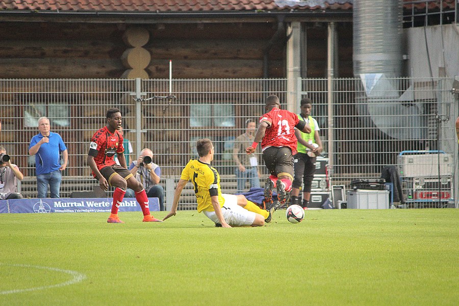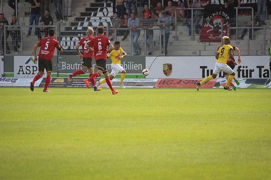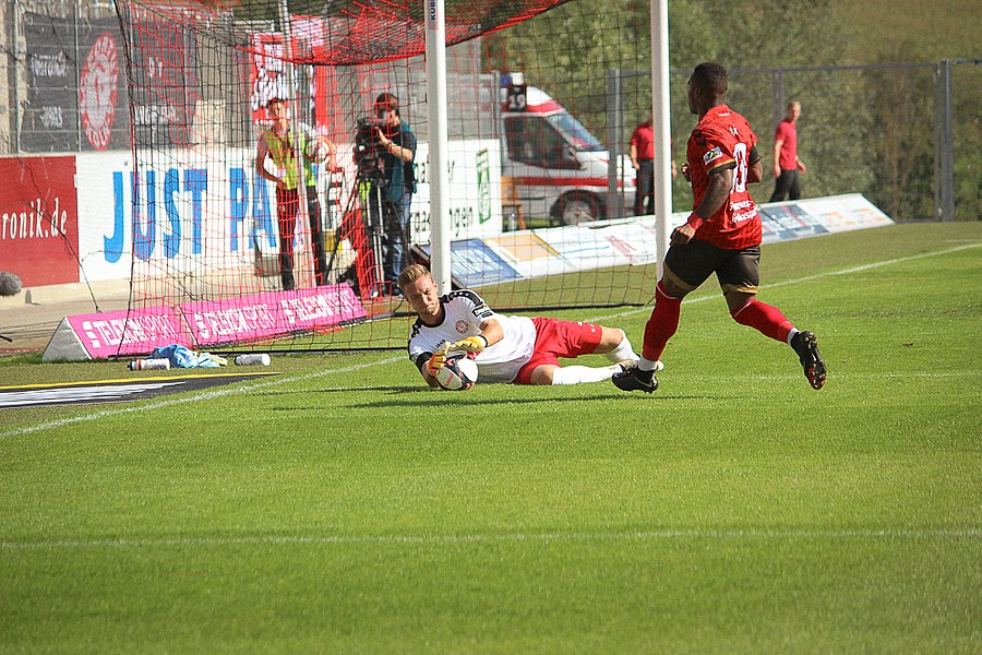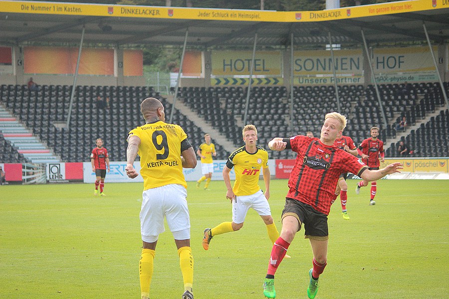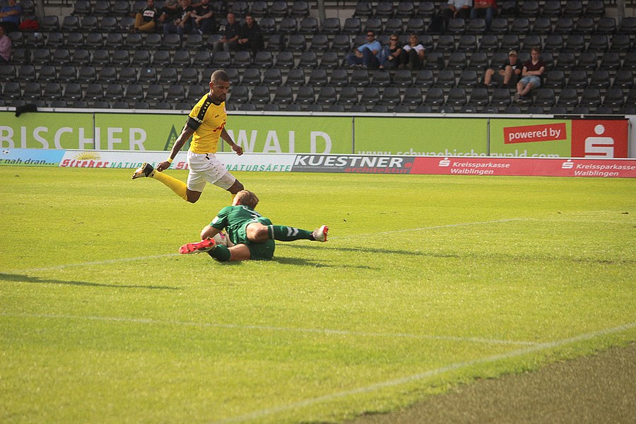 Beide Teams tasteten sich vorsichtig in die Partie. Die Gastgeber agierten dabei in einer Dreierkette im 3-4-3 und sorgten für das erste Ausrufezeichen: Nach einem Abstimmungsfehler der Fortuna tauchte Röttger frei vor Boss auf und schob gegen drei Kölner zur frühen Großaspacher Führung ein (6.). Die Südstädter waren von dem frühen Rückschlag geschockt, während sich die Gastgeber tief aufreihten und auf Konter lauerten. Nach einem solchen tauchten Gyau und Röttger gefährlich im Kölner Strafraum auf (12.). Wachgerüttelt von einem lautstarken Fortuna-Trainer Uwe Koschinat fand die Fortuna aber langsam in die Partie. So konnte man über Kegel und Brandenburger das Spiel mehr in die Hälfte der SG verlagern. Mit einem Geniestreich gelang dann der Ausgleich: Aus dem Halbfeld hob Kegel den Ball gefühlvoll hinter die Viererkette von Großaspach. Dort blieb Dahmani dann frei vor Broll eiskalt und schob zum 1:1 ein (20.).