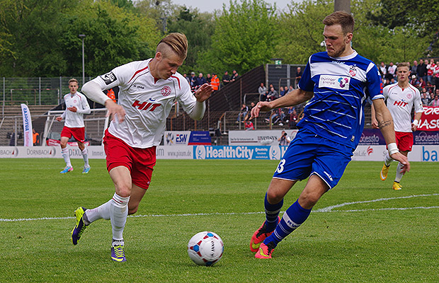 Im vorletzten Heimspiel der Saison sichert sich die Fortuna einen Zähler und punktet dabei nach einem 0:2-Rückstand. Vor 1.623 Zuschauern heißt es am Ende 2:2 (2:2) gegen Rot-Weiß Erfurt. Dabei erwischte die Koschinat-Elf eine schleppende erste halbe Stunde. Zwar hatte Kialka die erste Großchance in der Partie auf dem Fuß (15.). Im Gegenzug belohnte Kammlott aber couragierte Erfurter, die sich vom Anpfiff weg bissiger zeigten: Nach einem hohen Ball tauchte der Erfurter Stürmer frei vor Poggenborg auf und verwandelte sicher zum 0:1 (17.). Mit der Führung im Rücken fanden die Thüringer weiter Sicherheit. Erfurt blieb das offensiv gefälligere Team und baute die Führung folgerichtig aus: Nach einer Hereingabe von Bichler drückte Möhwald den Ball über den Fuß von Flottmann zum 0:2 ins Netz (30.). Fortuna-Trainer Uwe Koschinat reagierte mit einem Doppelwechsel auf den Rückstand und schickte für Rahn und Kialka Glockner und Aydogmus in die Partie. Die Maßnahme zeigte Wirkung und weckte die Kölner auf: Nach einer Kessel-Ecke köpfte Flottmann zum Anschlusstreffer ein (36.). Schließlich gelang den Kölnern noch vor der Pause der Ausgleich, als Hörnig einen Glockner-Freistoß ins lange Eck einköpfte (45.).