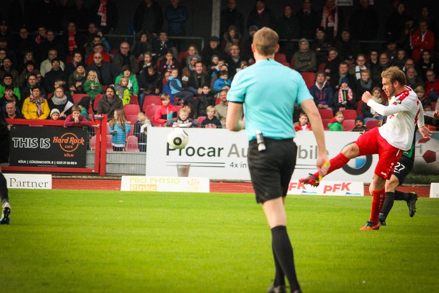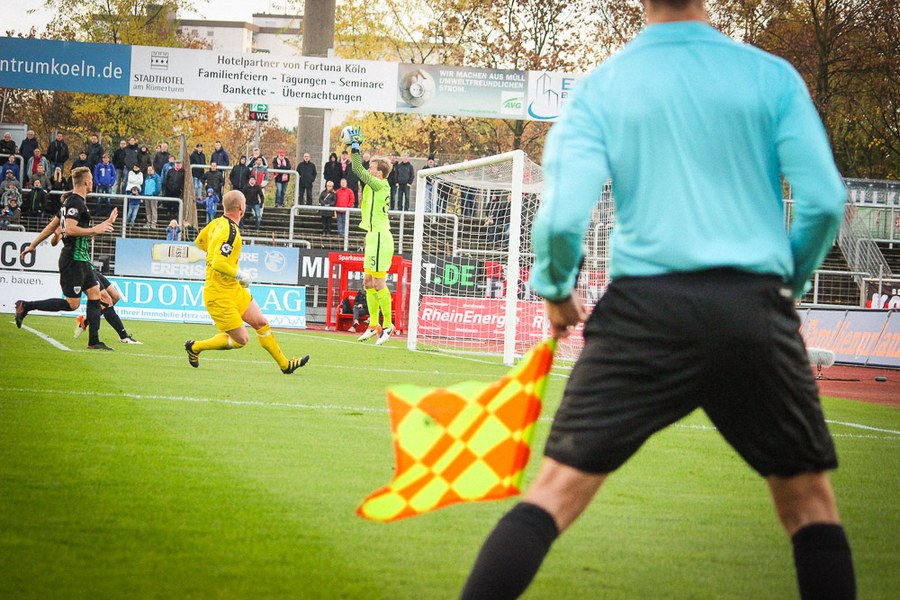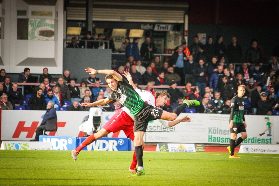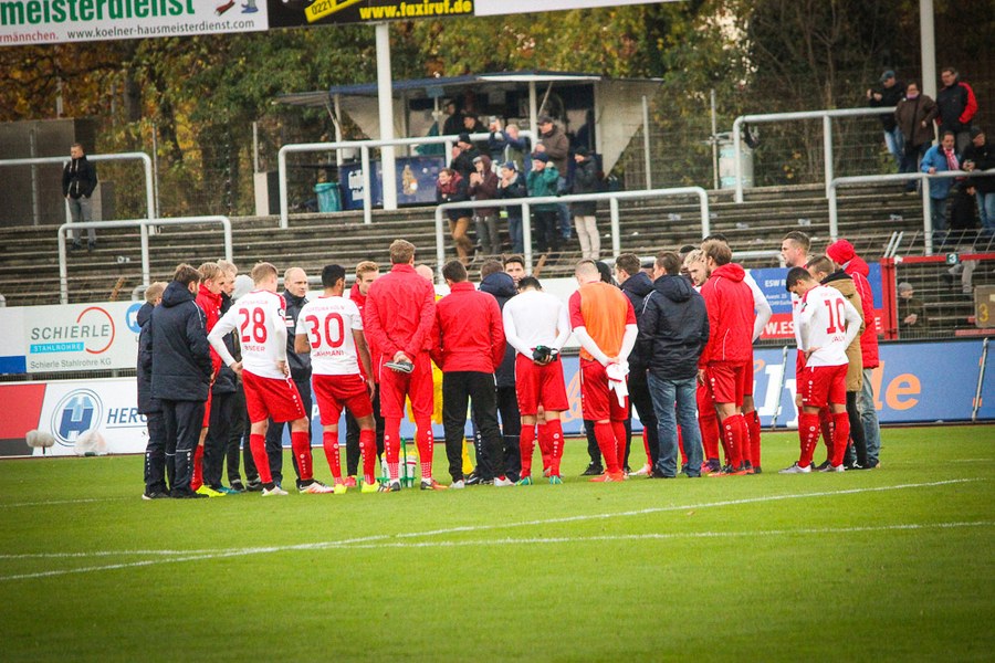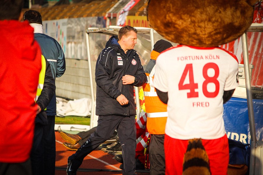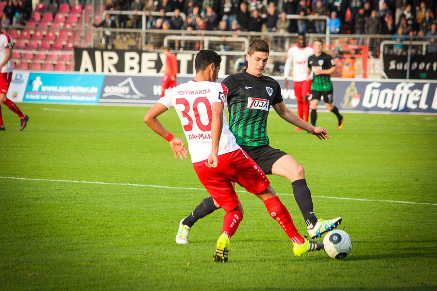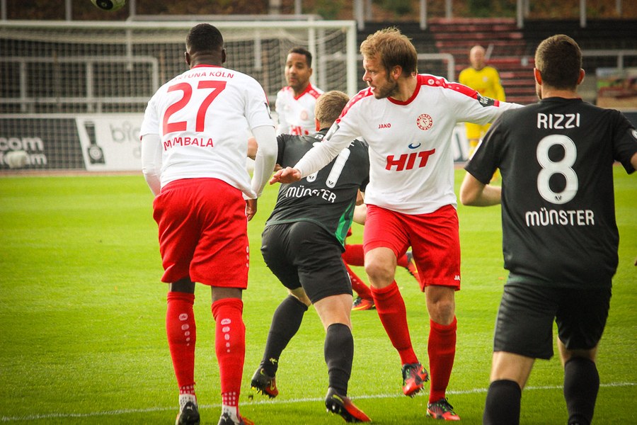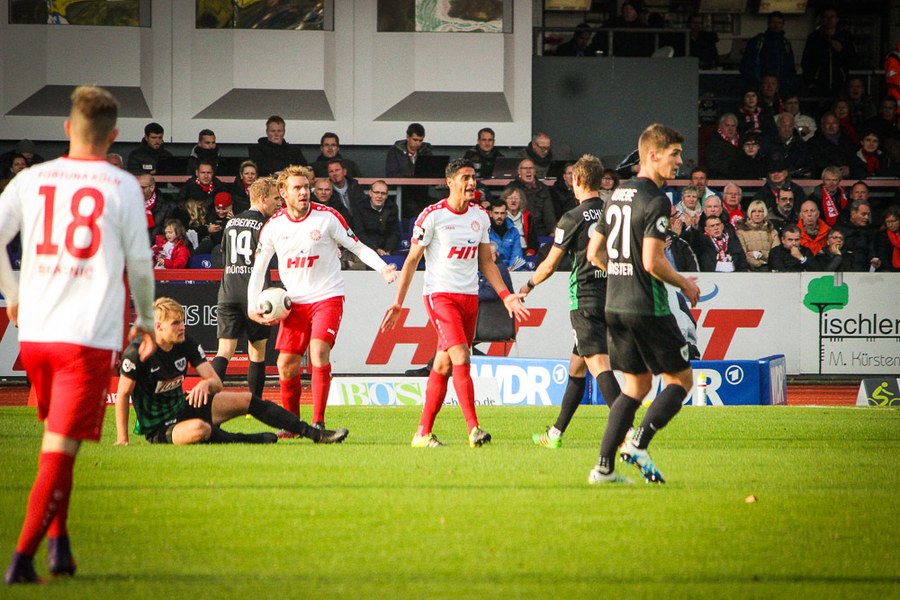 Dabei machte der Tabellenletzte aus Münster von Beginn an Druck. Die Preußen wollten im dritten Spiel unter Neu-Trainer Möhlmann endlich die Trenwende schaffen und das mit aller Macht: Nach einem Fehler in der Kölner Defensive lief Weissenfels allein auf das Tor zu, aber Poggenborg war zur Stelle (3.). Kurz darauf landete ein strammer Distanzschuss von Al-Hazaimeh knapp neben dem Tor (9.). Die Gäste störten früh und spielten zielstrebig nach vorne, sodass die Fortuna kaum Luft zum Atmen bekam. Erst nach Vorarbeit von Bender verbuchte Dahmani den ersten Kölner Abschluss (16.). Nach und nach schafften es die Südstädter, nun das Spielgeschehen mehr vom eigenen Tor wegzubekommen. Viel spielte sich fortan zwischen den beiden Strafräumen ab, auch weil Münster einen Gang runter schaltete. Torchancen gab es keine nennenswerten, dafür Zweikämpfe in Hülle und Fülle, vor allem in der Luft. Bei der Fortuna suchte man immer wieder die linke Seite von Souza. Allerdings fehlte insgesamt die Bindung in der Offensive, sodass bis auf Einzelaktionen wenig bei rum kam. Da sich auch Münster gegen eine stabiler werdende Fortuna-Defensive schwer tat, Chancen zu kreieren, ging es torlos in die Kabine. Einzig ein Distanzschuss von Dahmani ließ das Südstadion nach einmal aufhorchen (45.).