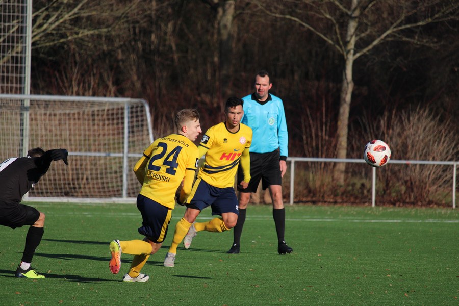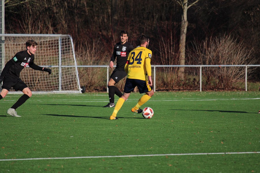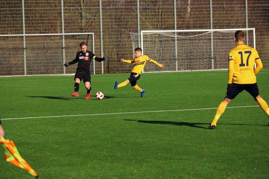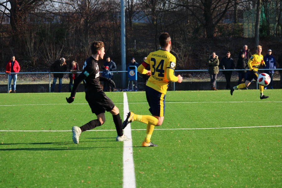 Die Fortuna begann mit Jannik Bruhns, Dominik Ernst, Back-up-Spieler Alwin Komolong, Nico Ochojski, Alem Koljic, Sebastian Schiek, Ali Ceylan, Okan Kurt, Kristoffer Andersen, Moritz Hartmann und Maurice Exslager. Gegen den Mittelrheinligisten übten die Südstädter von der ersten Minute an Druck aus. In der 8. Minute hatte Exslager nach Vorlage von Ernst die erste richtig gute Chance für das Kölner Team, doch Keeper Niklas Kirhoff wehrte den Schuss aus kürzester Entfernung ab.