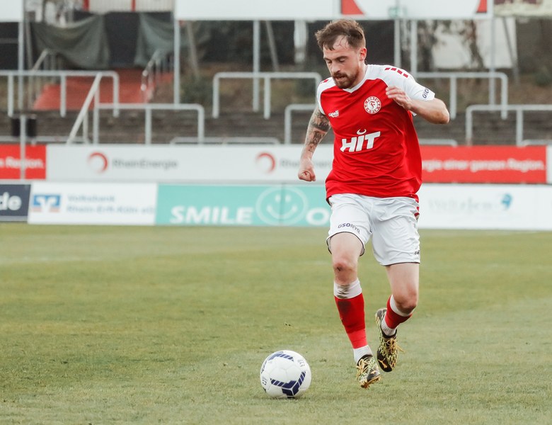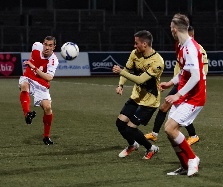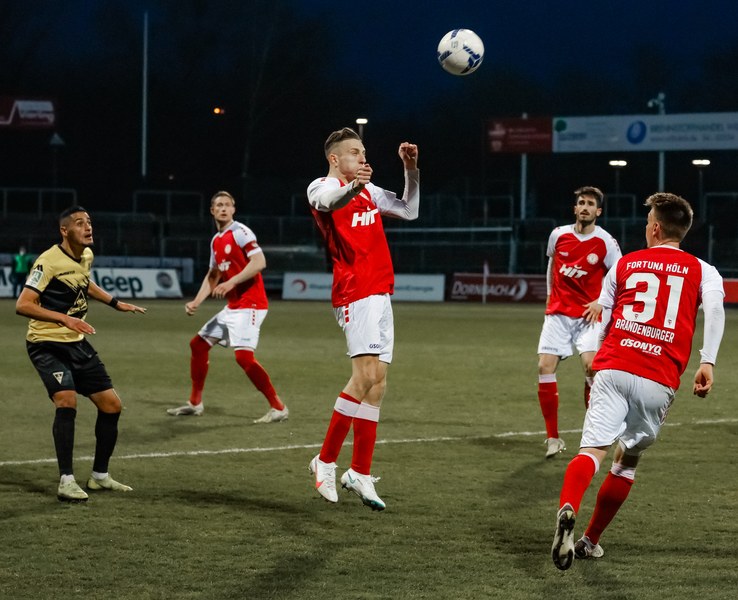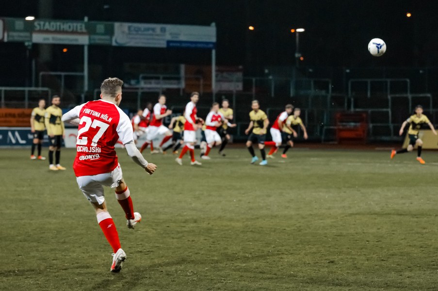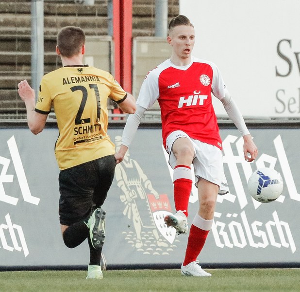 Das Spiel startete mit vielen Zweikämpfen. Die Kölner bekamen in den ersten Minuten gleich mehrere Freistöße zugesprochen, woduruch sie immer wieder Aktionen in der gegnerischen Hälfte hatten. Einer der härteren Körpereinsätze hatte zur Folge, dass Timo Hölscher schon nach vier Minuten angeschlagen den Platz verlassen musste. Nico Brandenburger kam für den jungen Mittelfeldmann. In der 9. Minute kamen die Aachener zu ihrer ersten Chance. Rüter zog die Strafraumgrenze entlang und schloss auf das Kölner Tor ab. Der Ball wurde noch abgefälscht und landete so unerreichbar für Rauhut im Tor. Ein denkbar ungünstiger Start für die Südstädter, die die Köpfe jedoch nicht hängen ließen. Sie spielten solide weiter und erzwangen sich mehr Ballbesitz. In der 24. Minute erspielte sich die Fortuna den ersten Eckball. Najar legte sich den Ball an der Eckfahne zurecht und brachte den Ball vor das Tor der Alemannia und fand in der Mitte Löhden. Der Kapitän schraubte sich hoch und köpfte den Ball Richtung Tor. Dort stand Owusu genau richtig und schob den Ball in den gegnerischen Kasten zum 1:1 Ausgleich ein. Fortuna bekam mehr Kontrolle über das Spiel und kam über Ubabuike zu einer gefährlichen Angriffssituation. Der Außenspieler setzte sich auf seiner Seite durch und hatte genügend Zeit, um den Bal vor das Tor zu bringen. Die Fußabwehr eines Alemannen brachte das Spielgerät zu Itter, der aus dem Rückraum angelaufen kam. In seinen strammen Schuss schmiss sich die Aachener Abwehr noch rechtzeitig zum Abblocken rein (27.). Aber Aachen ließ sich in der ersten Halbzeit nicht von dem Ausgleichstreffer beeindrucken und kam weiterhin zu Offensivaktionen. Ein von Najar verursachter Freistoß an der Eckfahne führte zu einer gefährlichen Gelegenheit für die Aachener. Die scharfe Hereingabe wurde vor das Fortuna Tor gebracht und am zweiten Pfosten rauschte Galle an, seinen Kopfball setzte er nur knapp am rechten Pfosten vorbei (36.). Kurz darauf pfiff Schiedsrichter Jonas Windeln zur Halbzeitpause im Südstadion.