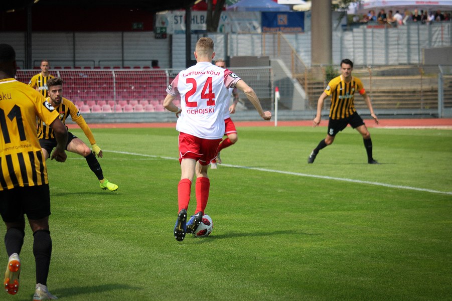 Trainer Zapel begann in der Abwehr mit einer Viererkette. Hierbei setzte er auf Joel Abu Hanna, Boné Uaferro, Moritz Fritz und Dominik Ernst. Im Mittelfeld zogen Kristoffer Andersen, Nico Brandenburger und Okan Kurt die Fäden. Dazu sollten die offensiv ausgerichteten Robin Scheu, Michael Eberwein und Nico Ochojski für Torgefahr sorgen. Im Tor kam Florian Kraft zu seinem ersten Pflichtspieleinsatz für Fortuna Köln.