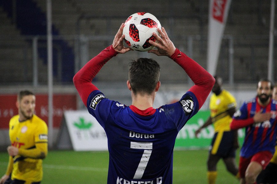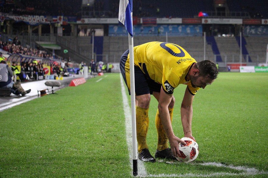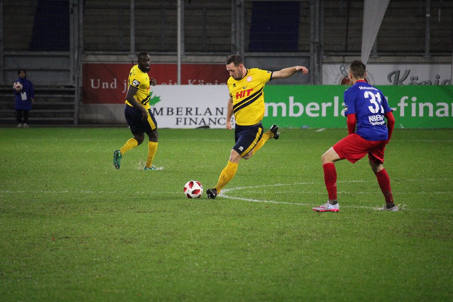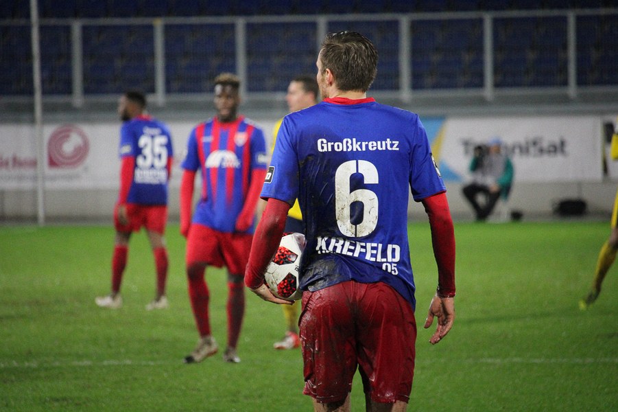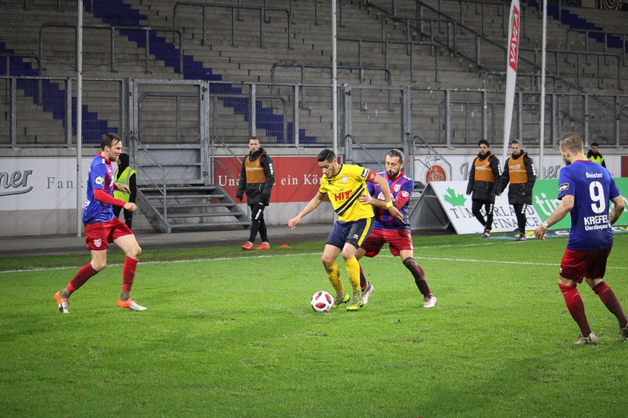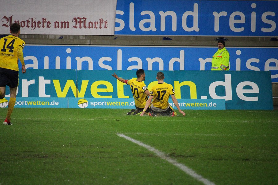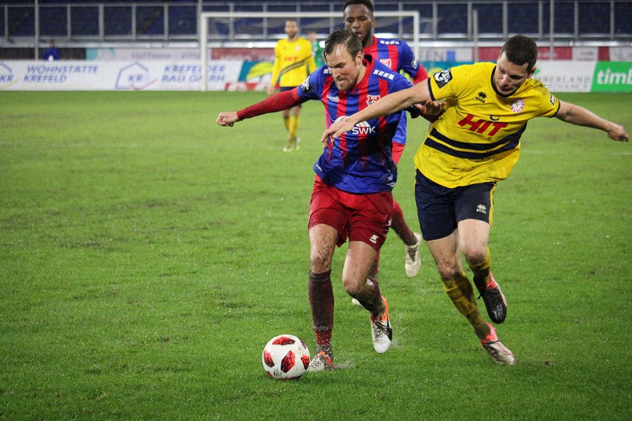 In der elften Minute kam der KFC Uerdingen gefährlich vor das Kölner Tor. Adriano Grimaldi schloss bei seinem ersten Pflichtspieleinsatz für die Krefelder aber nicht mehr ab, weil Bernard Kyere im letzten Moment klärte. Wenig später dann aber doch die Führung für die Gastgeber: Maximilian Beister kam halblinks im Sechzehner der Südstädter an den Ball und versenkte ihn trocken mit dem linken Fuß im rechten Eck – 1:0 für Uerdingen (13.).