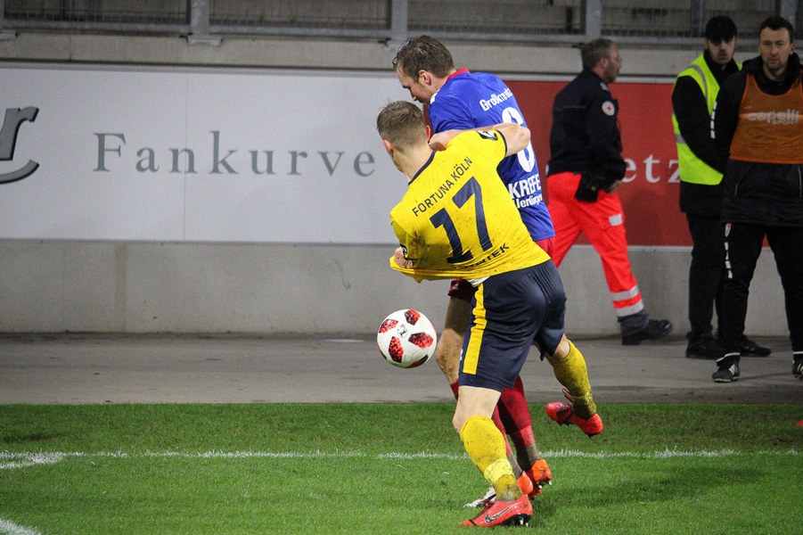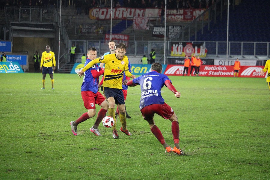 Mit fortlaufender Dauer schwanden bei beiden Teams ein wenig die Kräfte – das war aufgrund des tiefen Platzes in der englischen Woche nicht verwunderlich. Fortuna Köln wirkte trotzdem überlegen und investierte mehr in das Spiel. Zwingende Aktionen gelangen aber kaum. So war der Flachschuss des eingewechselten Anatole N’Gamukol in der 77. Minute eine leichte Beute für Uerdingens Schlussmann Benz. Michael Eberweins Schuss aus acht Metern war ebenfalls zu ungefährlich (80.) für den Keeper. Die Südstädter waren einem Führungstreffer in der Schlussphase zwar näher, doch es blieb beim 1:1.