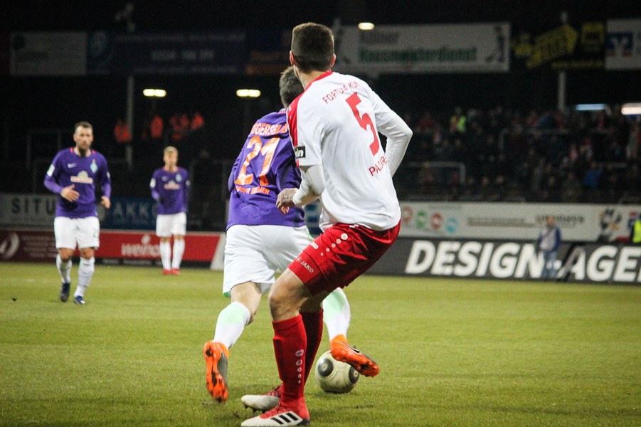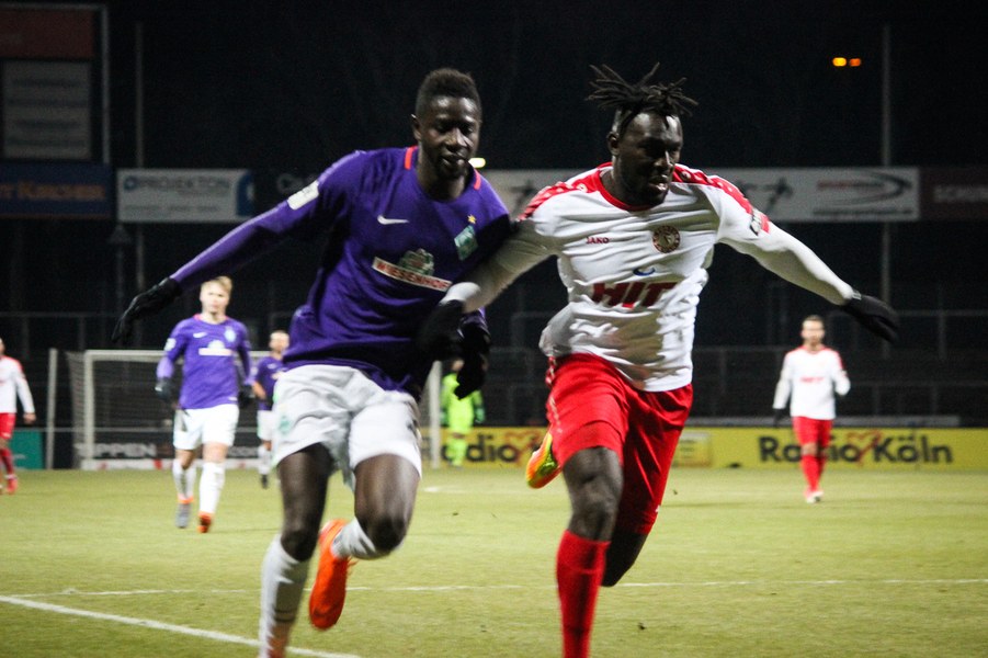 Nach dem Sieg gegen den SV Wehen Wiesbaden wollte die Fortuna wieder drei Punkte einfahren, um oben dran zu bleiben. Werder Bremen II braucht dagegen dringend Punkte für den Klassenerhalt. So entwickelte sich am Freitagabend im Südstadion ein rassiges Spiel, in dem die Fortuna schläfrig begann. In den ersten Minuten dominierte der SVW das Spiel und ging durch Jensen in Führung. Die Werderaner brachen über Außen durch. Den ersten Schuss konnte Boss zwar noch parieren, aber beim Nachschuss von Jensen war er machtlos (7.). Die Fortuna ließ den Rückstand aber nicht lange auf sich sitzen und erhöhte sofort den Druck. Nach einem Ballgewinn im Mittelfeld von Scheu ging es dann ganz schnell. Dahmani kam im Strafraum zum Schuss und glich aus (10.) Auch danach ließen de Kölner kein Stück nach. Farrona Pulido und Dahmani probierten es mit Distanzschüssen (13./15.). Ein Kopfball von Keita-Ruel landete am Pfosten (18.). Kurz darauf schlugen die Kölner durch Farrona Pulido erneut zu: Der Mittelfeldspieler ließ einen Gegner nach dem anderen stehen und schob am Ende zur Führung ein (23.). Die Fortuna hatte die Partie somit innerhalb weniger Minuten eindrucksvoll gedreht. Anschließend verflachte das Spiel danach ein wenig, die Fortuna hatte das Geschehen aber jederzeit unter Kontrolle. Am Ende der 1. Halbzeit wurde die Fortuna immer wieder durch Konter gefährlich. Bei einen dieser schnellen Umschaltbewegungen fasste Brandenburger sich ein Herz und zog aus 20 Meter ab. Der Ball ging nur knapp am Tor vorbei (43.).
