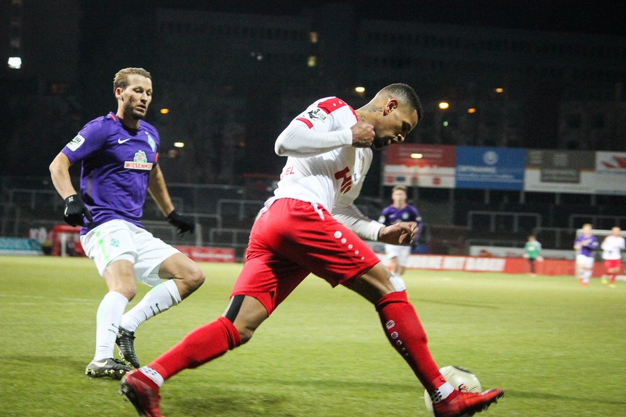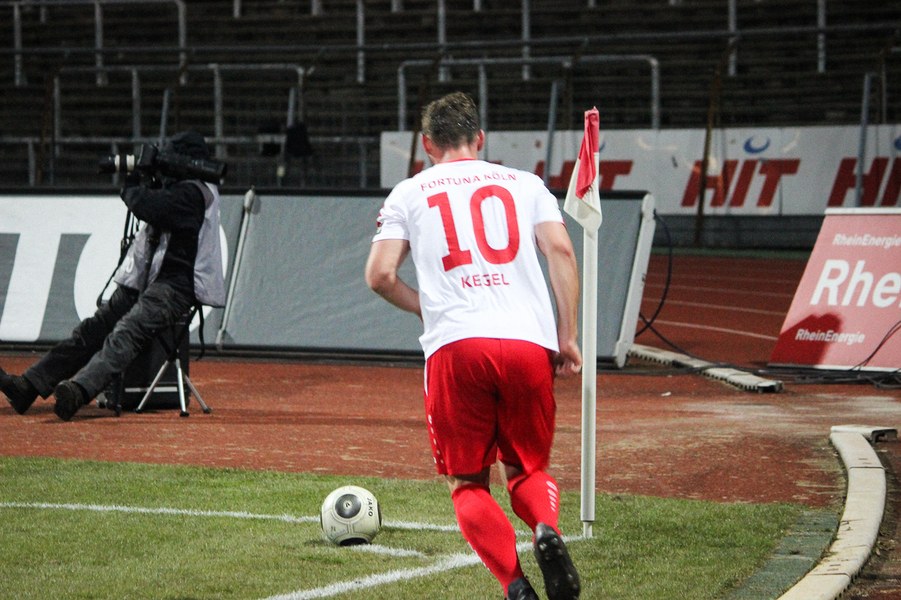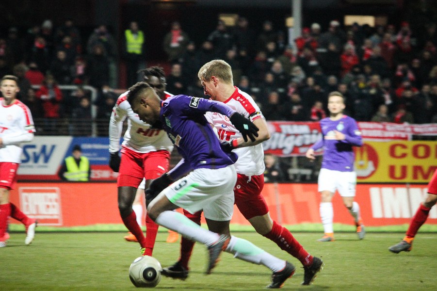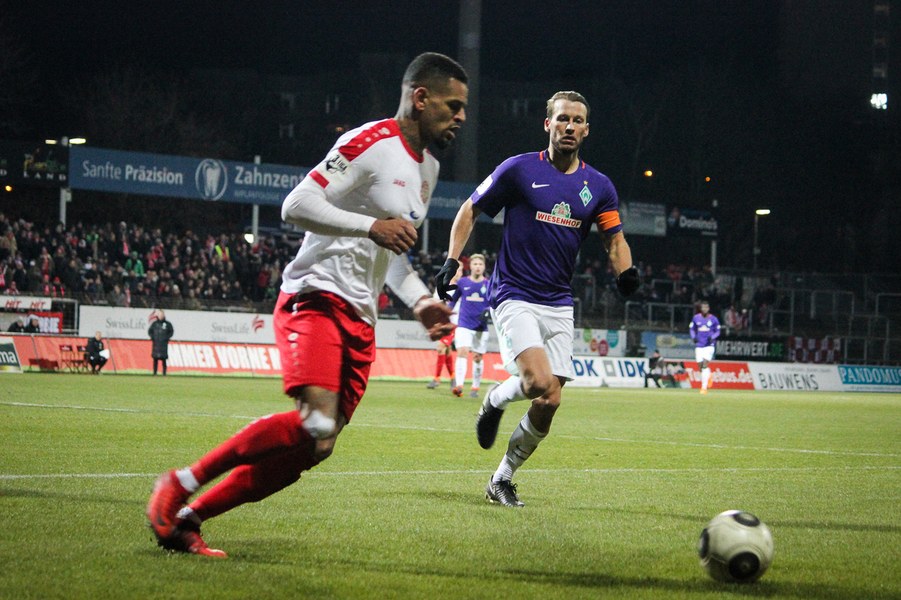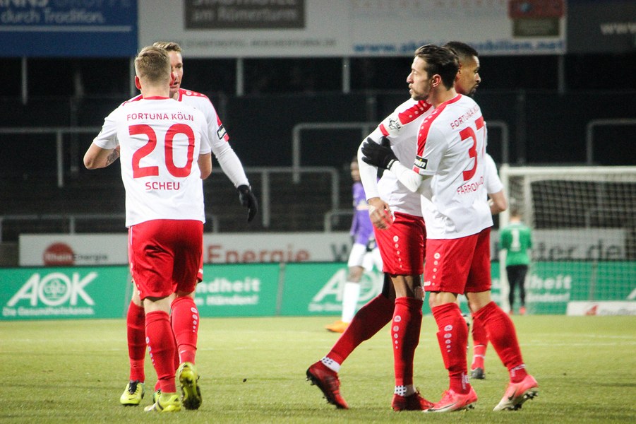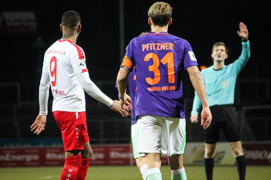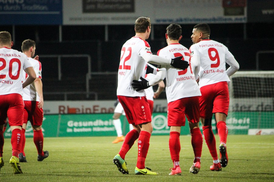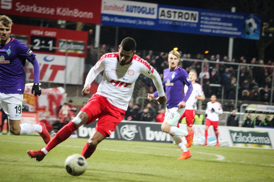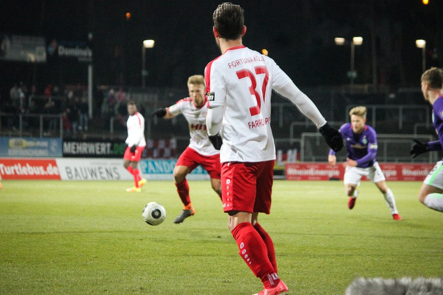 Angetrieben von der guten eigenen Leistung in den ersten 45 Minuten, startete die Fortuna auch in den 2. Durchgang stark! Nach nur wenigen Minuten hämmerte Dahmani den Ball an den Querbalken (47.). Aber auch die Bremer spielten mit, blieben vorerst jedoch ungefährlich. Nach einem starken Solo von Kyere war es dann Farrona Pulido, der die nächste Chance verbuchte. Seine Direktabnahme ging knapp am Tor vorbei (61.) Ein paar Minuten später versuchte sich Scheu an einem Distanzschuss, scheierte aber auch (68.). Bremen wurde in der Folgezeit mutiger und drückte die Fortuna in die eigene Hälfte hinein. Entlastungsangriffe der Kölner waren zu dieser Zeit auch eher Mangelware. Manneh hatte schließlich die große Chance zum Ausgleich. Er konnte sich gegen Kyere durchsetzen, aber Ernst konnte schlimmeres verhindern (80.) Kurz darauf hatte auch der SVW Pech mit dem Aluminium! Kruska hämmerte einen Freistoß an die Latte. Den Abpraller konnten die Kölner jedoch klären (85.) Schließlich gelang es der Fortuna den knappen Vorsprung gegen drückende Gegner noch über die Zeit bringen und wichtige drei Punkte zu sichern. Damit ist die Fortuna für mindestens eine Nacht punktgleich mit dem drittplatzierten SV Wehen WIesbaden.