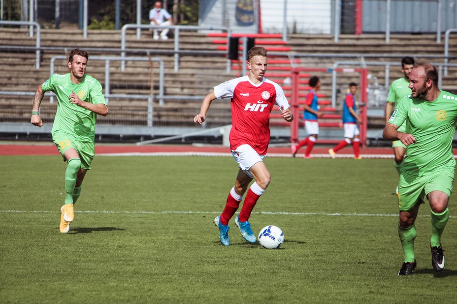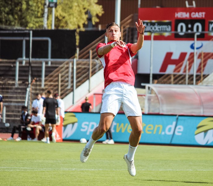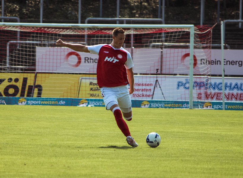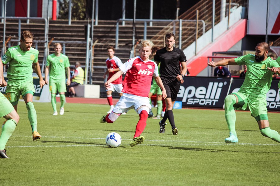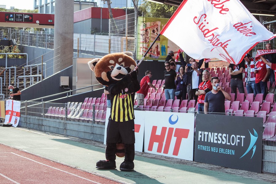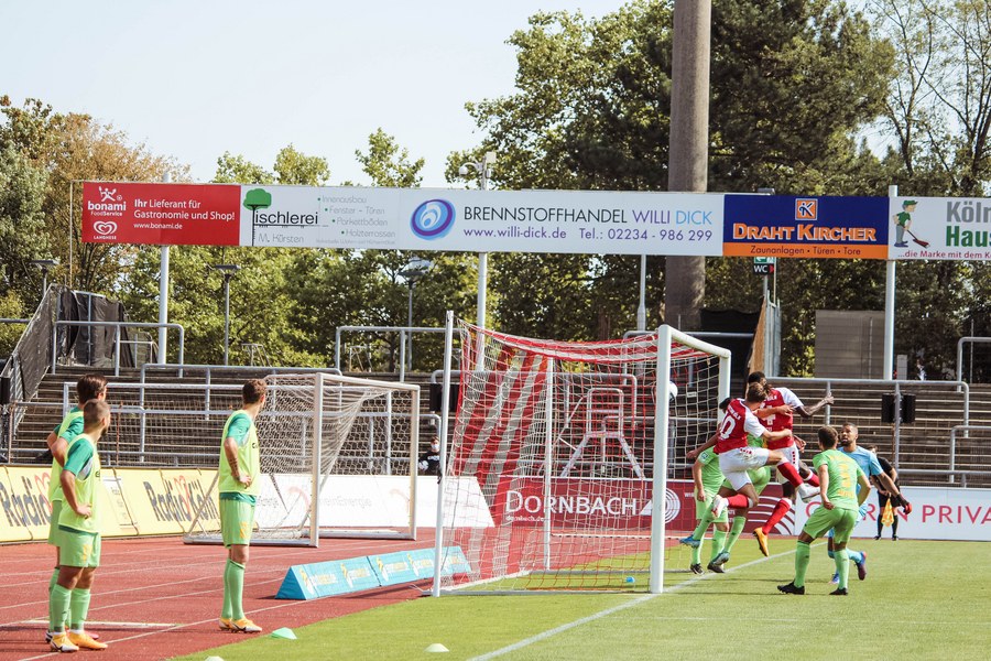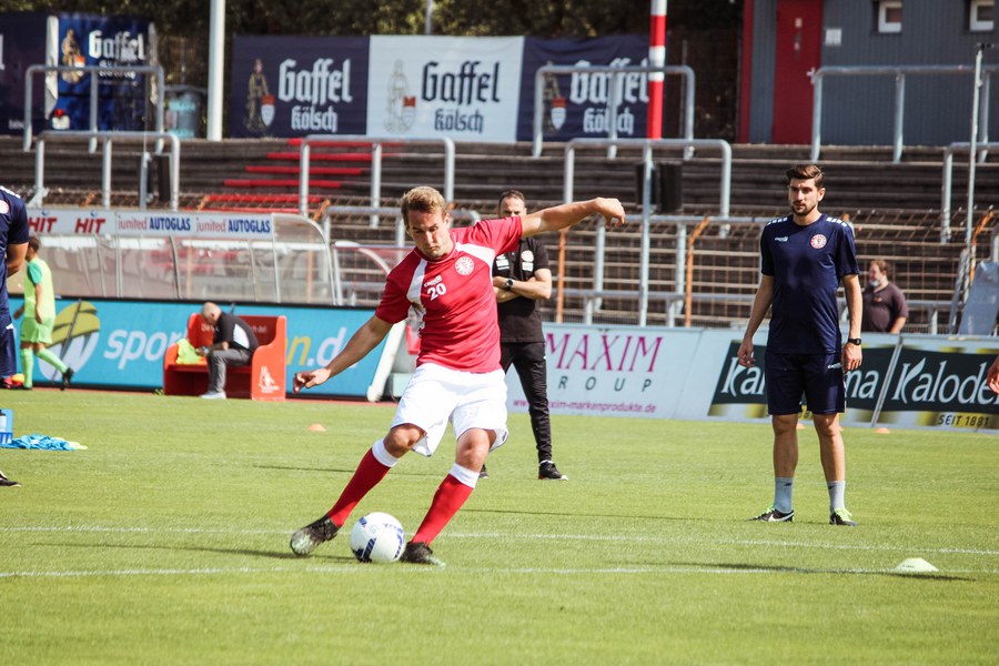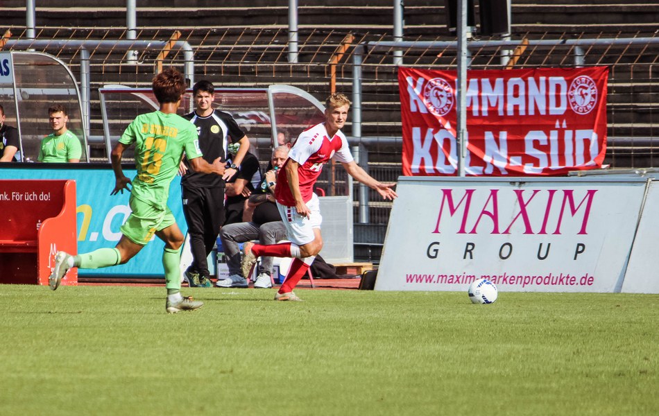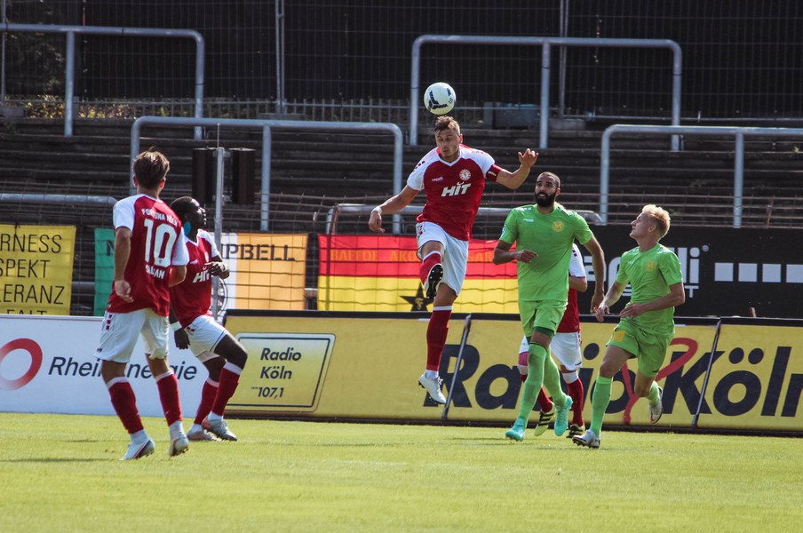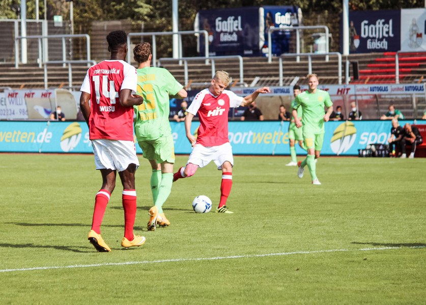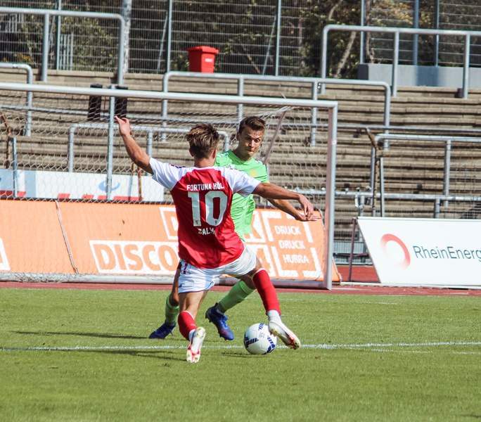Heute rollte nach langer Zeit endlich wieder der Ball bei einem Pflichtspiel im Kölner Südstadion. Im Vergleich zum Spiel gegen Bergisch Gladbach wechselte Trainer Ende sein Team auf einer Position: Hamza Salman ersetzte Roman Prokoph in der Sturmspitze neben Günther-Schmidt. Gleich stand der neue Mann auf dem Feld im Mittelpunkt. Salman spielte eine Ecke flach in den Strafraum, wo sich Franko Uzelac freilief und die einstudierte Variante per Vollspann auf das Tor brachte. Der Schuss landete aber über dem Kasten (5.). Kurz danach probierte es der Flankengeber selbst. Nach Hereingabe von Ubabuike nahm Salman den Schuss mit der Brust an und brachte ihn direkt auf das Tor, blieb aber hängen (8.). Die Gäste nutzten einen Freistoß, um erstmals den Ball auf das Tor zu bringen. Kevin Weggen probierte es zentral vor dem Tor in Uzelac-Manier, setzte den Freistoß aber über den Kasten (15.). Auf der anderen Seite tauchte Poggenberg zentral vor dem Tor auf, aber auch er setzte den Ball über die Latte (16.). Dann der Doppelschlag der Fortuna: Nico Ochojski zwang den Keeper mit einem Schuss aus der Distanz zu einer Glanztat und holte damit einen Eckball raus. Fortuna nutzte nach dem Eckball die zweite Welle und Mike Owusu sorgte nach Hereingabe von Ochojski für die Führung der Südstädter (24.). Dann dauerte es eine Weile, bis die nächste große Chance auf dem Papier auftauchte. 40 Minuten waren gespielt, als es Salman aus der Distanz versuchte, den Ball aber in den Armen des Keepers platzierte. Als schließlich alle im Südstadion den Halbzeitpfiff erwarteten, ertönte ein anderer Pfiff durch die Pfeife des Schiris – Elfmeter! Hamza Salman wurde im Strafraum gelegt und Franko Uzelac verwandelte den fälligen Elfmeter flach und sicher (45.). So ging es mit einer zwei Tore-Führung in die Pause.