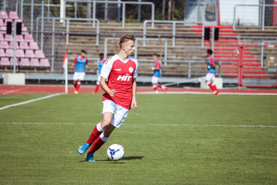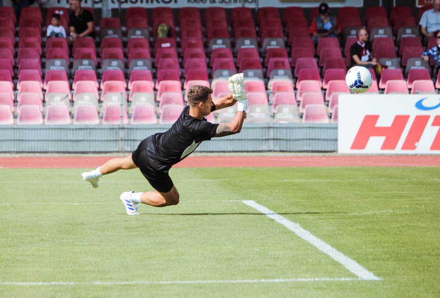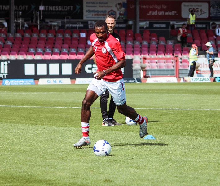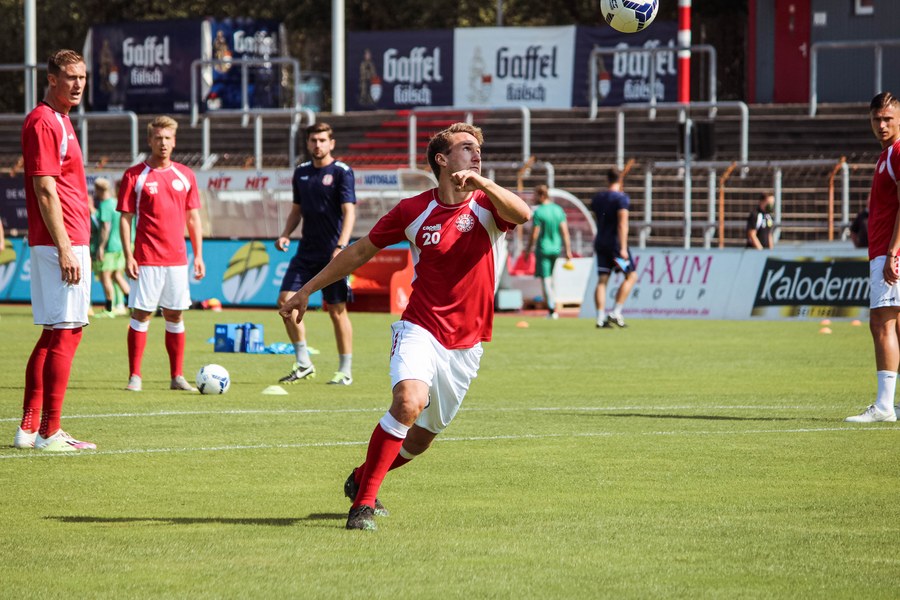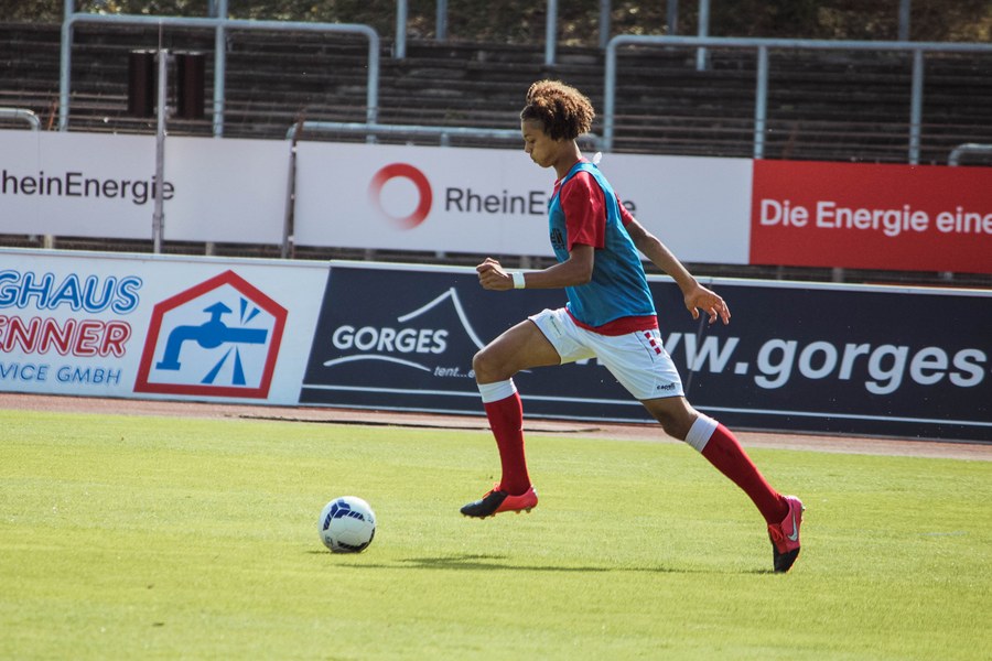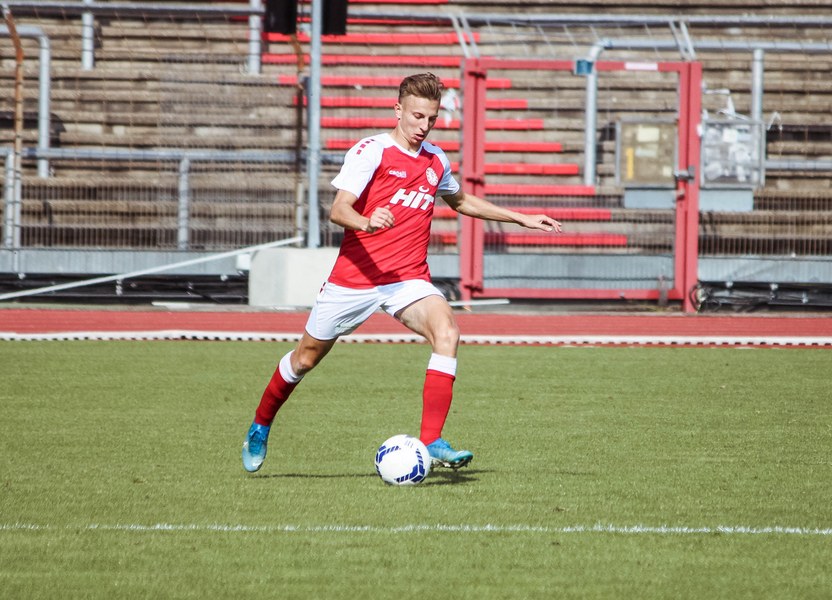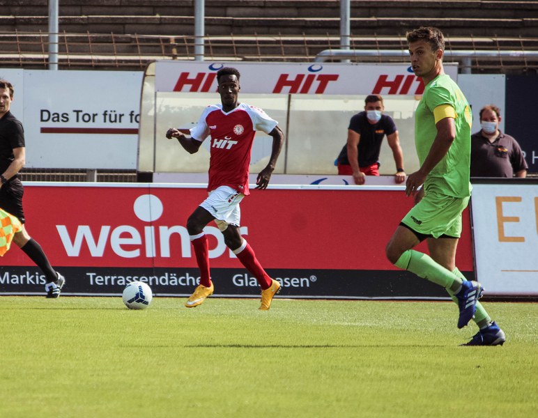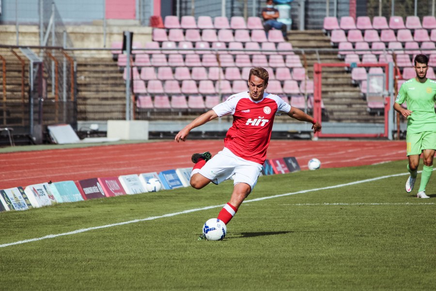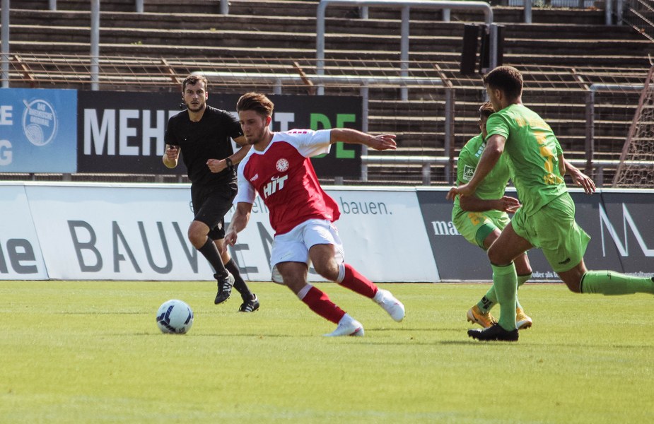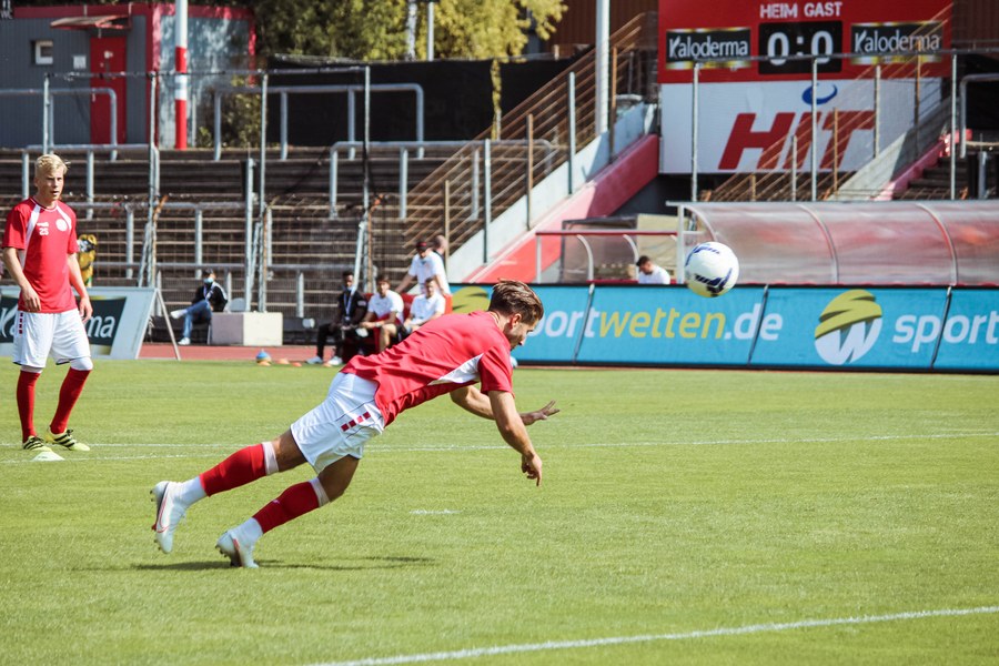 Heute rollte nach langer Zeit endlich wieder der Ball bei einem Pflichtspiel im Kölner Südstadion. Im Vergleich zum Spiel gegen Bergisch Gladbach wechselte Trainer Ende sein Team auf einer Position: Hamza Salman ersetzte Roman Prokoph in der Sturmspitze neben Günther-Schmidt. Gleich stand der neue Mann auf dem Feld im Mittelpunkt. Salman spielte eine Ecke flach in den Strafraum, wo sich Franko Uzelac freilief und die einstudierte Variante per Vollspann auf das Tor brachte. Der Schuss landete aber über dem Kasten (5.). Kurz danach probierte es der Flankengeber selbst. Nach Hereingabe von Ubabuike nahm Salman den Schuss mit der Brust an und brachte ihn direkt auf das Tor, blieb aber hängen (8.). Die Gäste nutzten einen Freistoß, um erstmals den Ball auf das Tor zu bringen. Kevin Weggen probierte es zentral vor dem Tor in Uzelac-Manier, setzte den Freistoß aber über den Kasten (15.). Auf der anderen Seite tauchte Poggenberg zentral vor dem Tor auf, aber auch er setzte den Ball über die Latte (16.). Dann der Doppelschlag der Fortuna: Nico Ochojski zwang den Keeper mit einem Schuss aus der Distanz zu einer Glanztat und holte damit einen Eckball raus. Fortuna nutzte nach dem Eckball die zweite Welle und Mike Owusu sorgte nach Hereingabe von Ochojski für die Führung der Südstädter (24.). Dann dauerte es eine Weile, bis die nächste große Chance auf dem Papier auftauchte. 40 Minuten waren gespielt, als es Salman aus der Distanz versuchte, den Ball aber in den Armen des Keepers platzierte. Als schließlich alle im Südstadion den Halbzeitpfiff erwarteten, ertönte ein anderer Pfiff durch die Pfeife des Schiris – Elfmeter! Hamza Salman wurde im Strafraum gelegt und Franko Uzelac verwandelte den fälligen Elfmeter flach und sicher (45.). So ging es mit einer zwei Tore-Führung in die Pause.