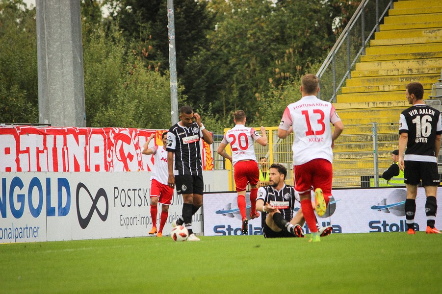 Die Fortuna ergriff nach einer zerfahrenen Anfangsphase die Initiative, konnte ihre Chancen aber nicht nutzen. So köpfte Koljic nach starker Flanke von Ernst aus elf Metern am Aalener Tor vorbei (7.). Nur eine Minute später scheiterte Dahmani ebenfalls mit einem Kopfball von der Strafraumkante (8.). Die Fortuna war spielerisch überlegen, ohne sich dabei mit einem Torerfolg zu belohnen. Einen direkten Freistoß von Kegel konnte VfR-Schlussmann Bernhardt nur mit großer Mühe parieren (19.). Danach gönnte sich das Spiel eine kleine Verschnaupause. Die Fortunen blieben spielbestimmend, ohne dabei aber offensiv zwingend gefährlich zu werden. Scheu verfehlte das Tor mit einem Distanzschuss knapp (34.). Aalen meldete sich mit einem Konter über Morys sowie anschließendem Freistoß von Bär zaghaft in der Partie an (37.). Es war aber nur ein Strohfeuer. Trotzdem ging es torlos in die Kabine, als nach feiner Flanke von Schiek Dahmani über den Querbalken köpfte (44.).