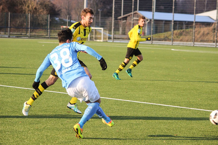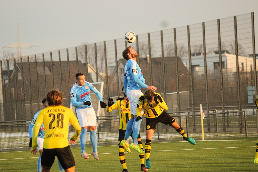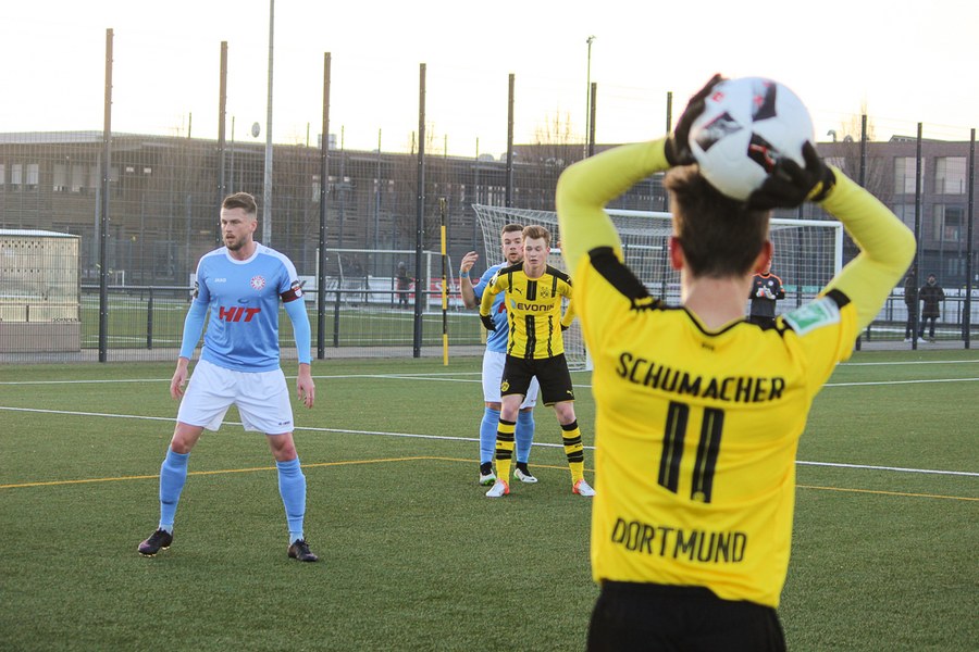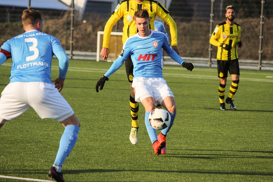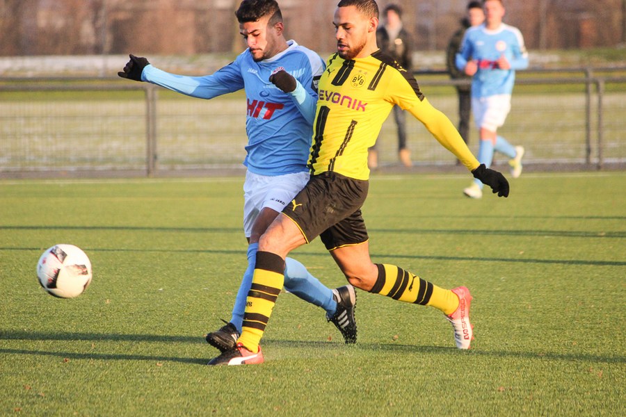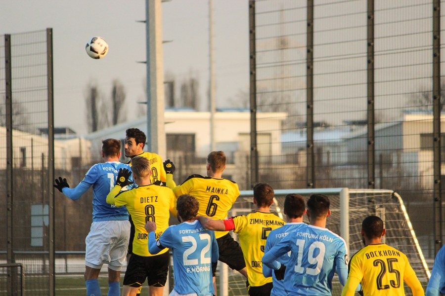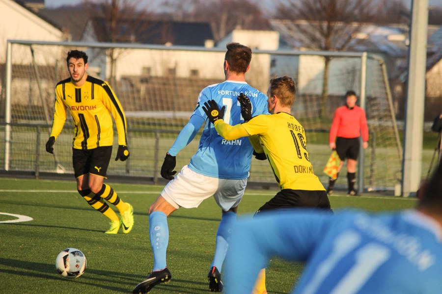 Bei eisigen Temperaturen in Dortmund dauerte es ein wenig, bis die beiden Mannschaften sich warm gespielt hatten. Die Reserve des BVB war es aber schließlich, die als erstes gefährlich vor dem gegnerischen Tor auftauchte: Philipp Hanke kam im Fortuna-Strafstoß zu Fall, Michael Eberwein verwandelte den fälligen Elfmeter souverän (12.). Mit der Führung im Rücken fühlte sich der BVB sichtlich wohl - die Spielanteile wuchsen zugunsten der Schwarzgelben. Die Mannschaft von Uwe Koschinat wirkte nach dem Rückstand etwas verunsichert. Es dauerte bis zur 27. Minute, ehe Hamdi Dahmani ein Zeichen setzte und den Ball nur knapp am Dortmunder Tor vorbeischoss. Im Anschluss hatte Boné Uaferro nach einer Ecke ebenfalls die Möglichkeit zum Ausgleich (29.). Der BVB verbuchte aber insgesamt die zielstrebigeren Aktionen und lag deshalb auch verdient zur Pause in Front.