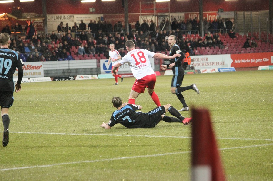 Die ersten Minuten im zweiten Durchgang waren zunächst von Unterbrechungen geprägt. Pazurek und Scheu mussten beide auf dem Platz behandelt werden, nachdem sie in Zweikämpfen einstecken mussten. Der CFC wollte sich auch im weiteren Spielverlauf nicht aufgeben und spielte mutig nach vorne. Brandenburger hätte den Druck der Chemnitzer fast beenden können: An der Strafraumgrenze nahm er einen Ball direkt und verzog nur knapp (61.). So waren die Chemnitzer noch im Spiel und warfen noch einmal alles nach vorne. Entscheidend war dabei die Einwechslung von Aydin. Der Mittelfeldspieler brachte noch einmal frischen Wind in die Begegnung. Die größte Chance von Chemnitz in zweiten 45 Minuten wurde von ihm eingeleitet. Er konnte sich über Außen durchsetzen und spielte eine Hereingabe in die Mitte. Dort stand Slavov, der den Ball aber nicht richtig traf. Boss konnte dadurch klären (68.). Die Fortuna setzte anschließend immer wieder Nadelstiche und hielt Chemnitz so vom eigenen Tor weg. Vor allem über Konter und schnelles Umschaltspiel kamen die Kölner immer wieder gefährlich nach vorne. Manuel Farrona Pulido und Markus Pazurek hätten in dieser Phase das Ergebnis weiter in die Höhe treiben können, scheiterten jedoch im Abschluss (65./75). So blieb es am Ende bei einem 3:0 Sieg für die Fortuna.
