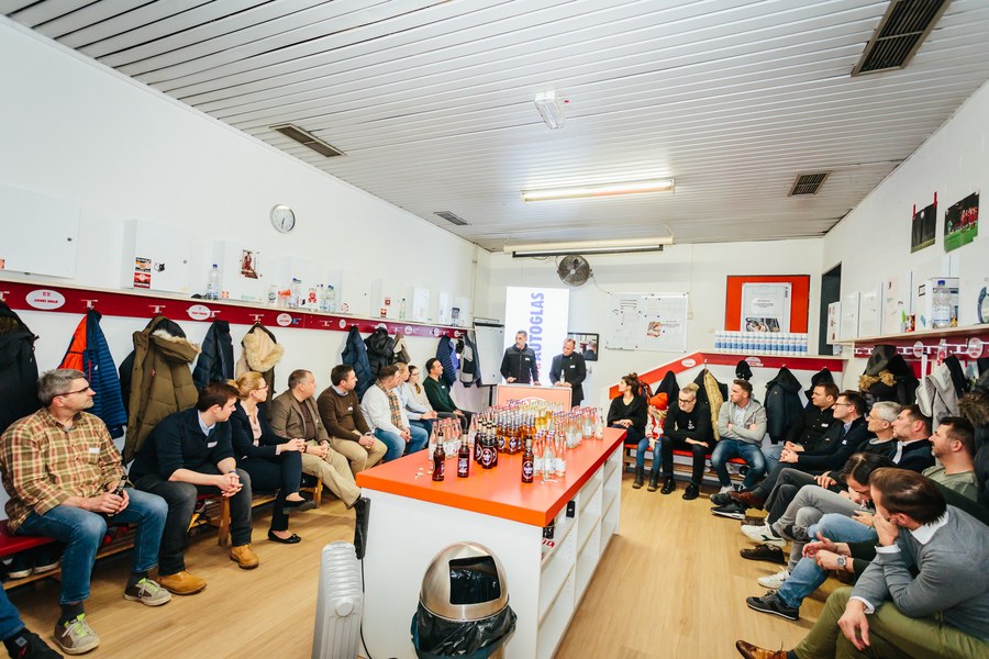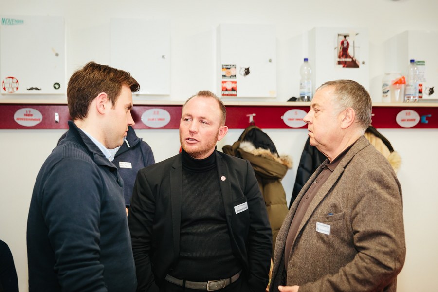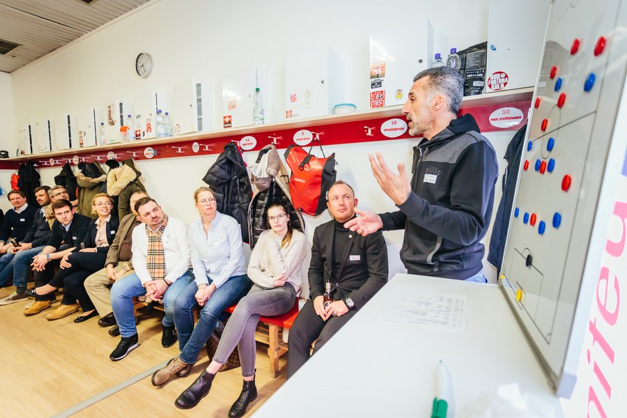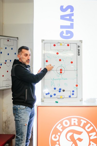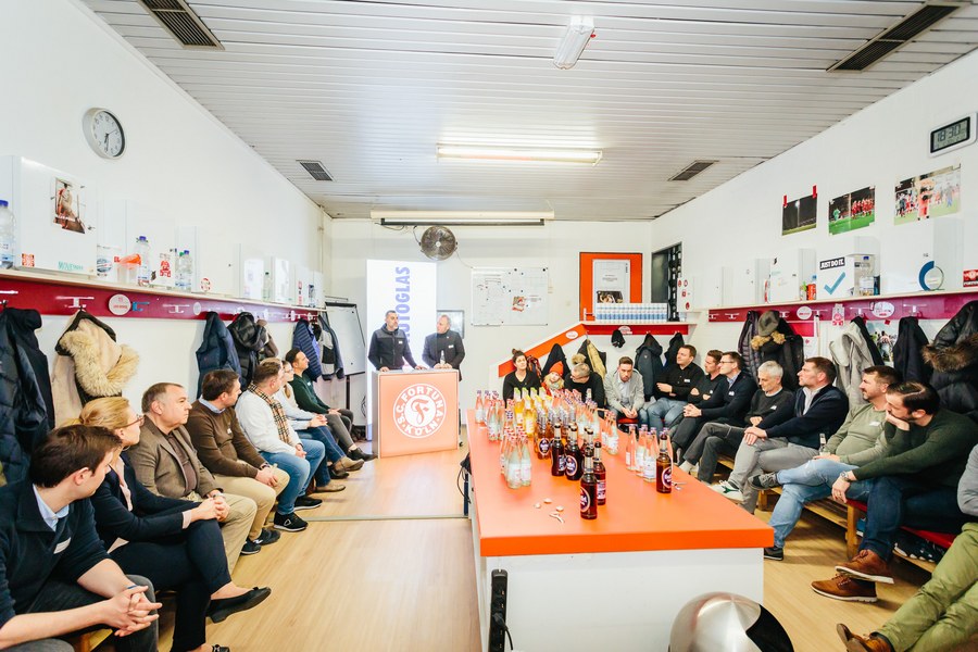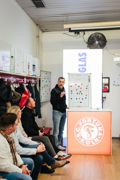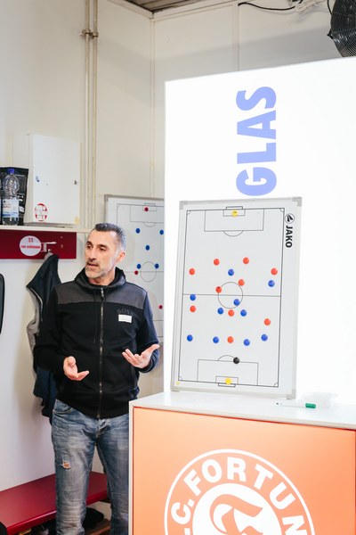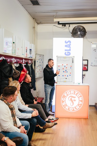 Zum insgesamt fünften Mal und zum zweiten Mal in der laufenden Saison warfen Freunde und Partner beim junited AUTOGLAS Kabinentalk einen Blick hinter die Kulissen der Fortuna. Auch gestern kamen rund 30 Freunde und Partner der Fortuna in der Mannschaftskabine zusammen und lauschten den Worten von Cheftrainer Thomas Stratos. Während es im ersten Teil der Veranstaltung um unseren Trainer und seinen Werdegang als Fußballer und als Mann an der Seitenlinie ging, stand im zweiten Teil die taktische Ausrichtung der Fortuna im Mittelpunkt.