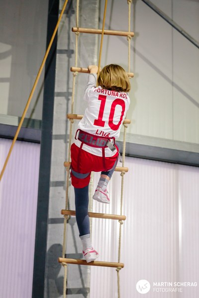 Und dann ging es auch schon los: Nach einer kurzen Einweisung vom Team der Kletterfabrik konnten sich die Fortuna-Partner und die beiden Torhüter ausprobieren. Durch die eigenen Kletterfähigkeiten und die Ideen der anderen inspiriert, ließen sich die beiden Keeper dann auch zu einem Battle hinreißen. Dabei stellte Ersatz-Torwart Kraft die aktuelle Nummer eins der Fortuna, Rehnen, in den Schatten. Der 20-Jährige kletterte die etwa neun Meter hohe Wand etwas schneller hoch und betätigte zum Zeichen des Sieges demonstrativ den entsprechenden Buzzer.