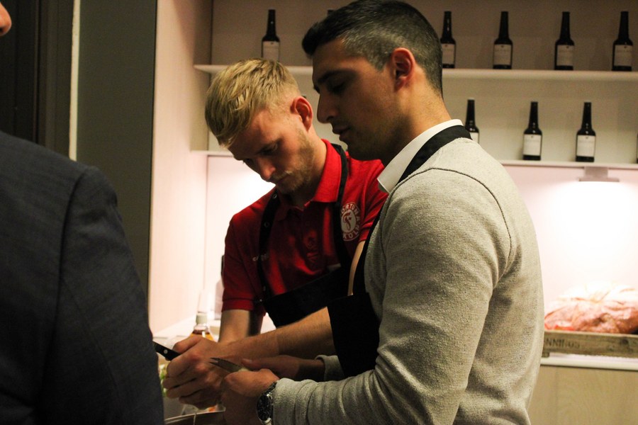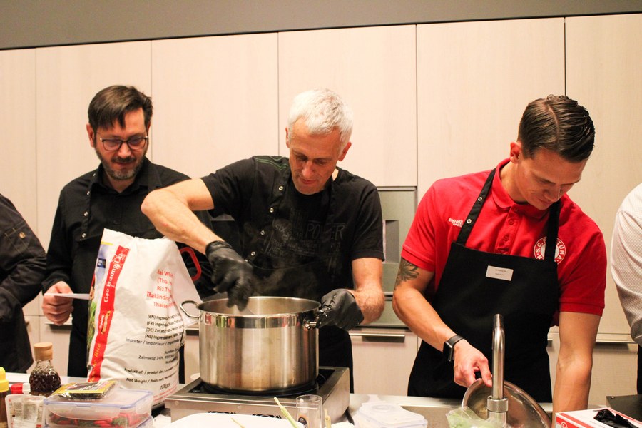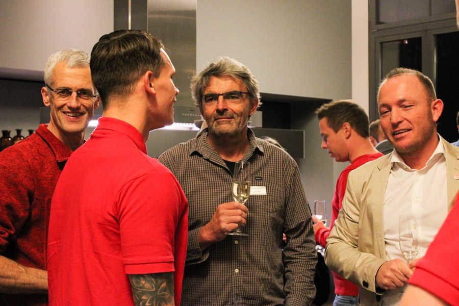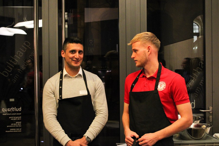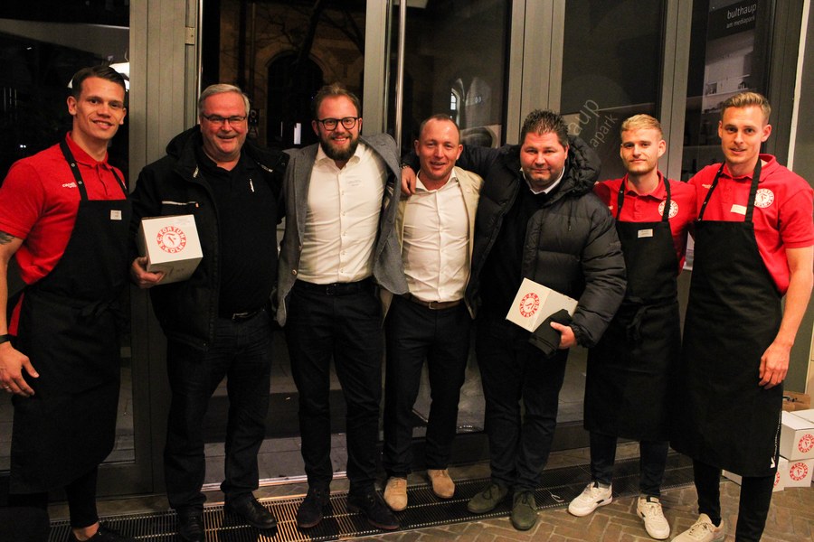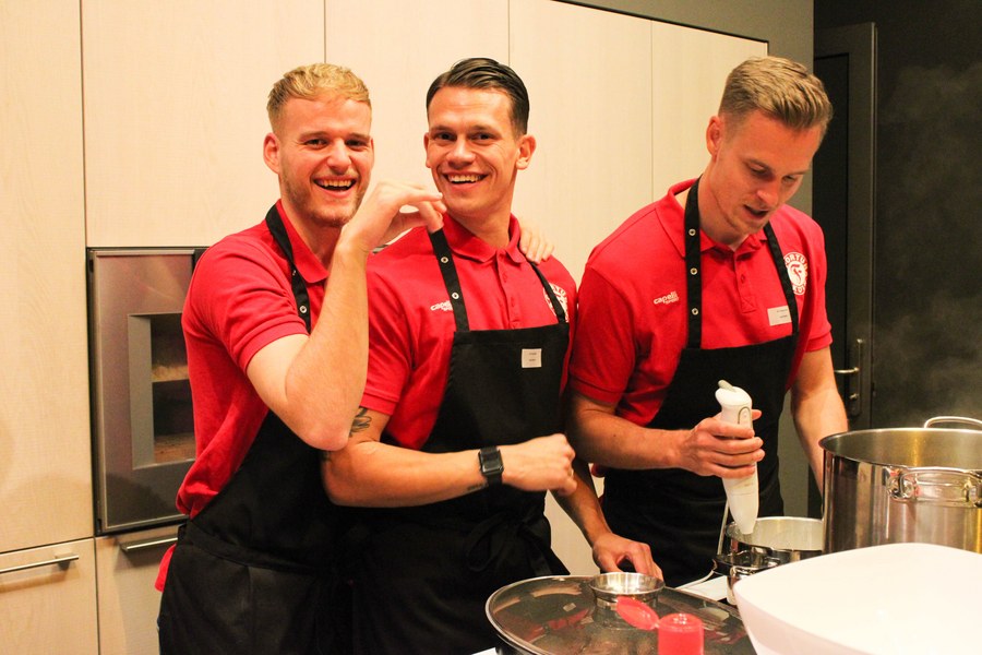 Dabei wurden die Partner der Fortuna in drei Gruppen eingeteilt. Die erste Gruppe kümmerte sich gemeinsam mit und um Gruppenkopf Lars Bender um die Vorspeise. Angerichtet in kleinen Tassen, genossen die Gäste eine Steinpilzsuppe. Seinen Höhepunkt fand der Abend mit dem Hauptgericht, für den Kevin Rauhut mit seiner Gruppe zuständig war. Für einen gelungenen Abschluss sorgten schließlich die Köche der Nachspeise, die von Jannes Hoffmann angeführt wurden.