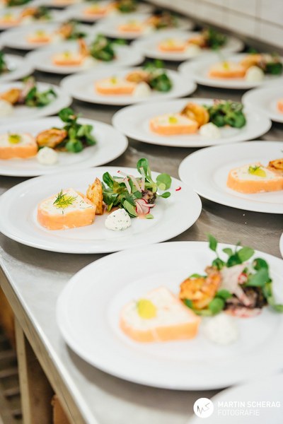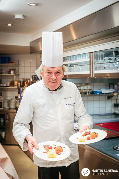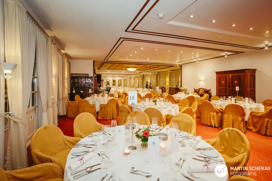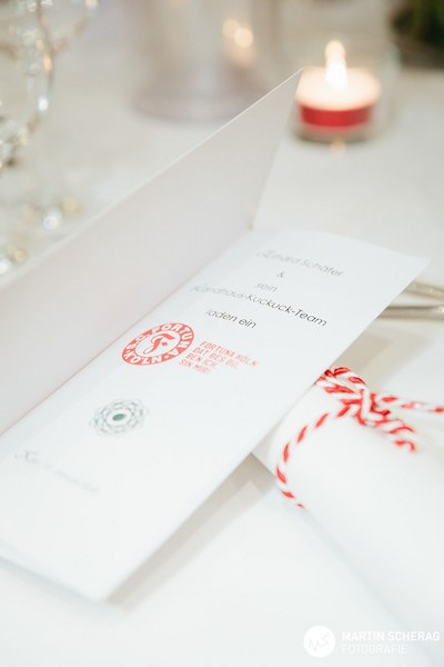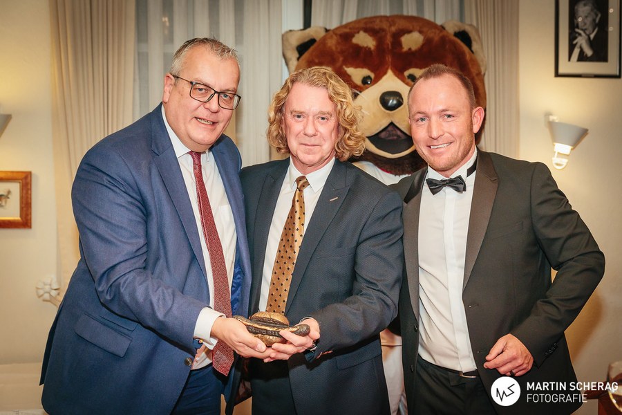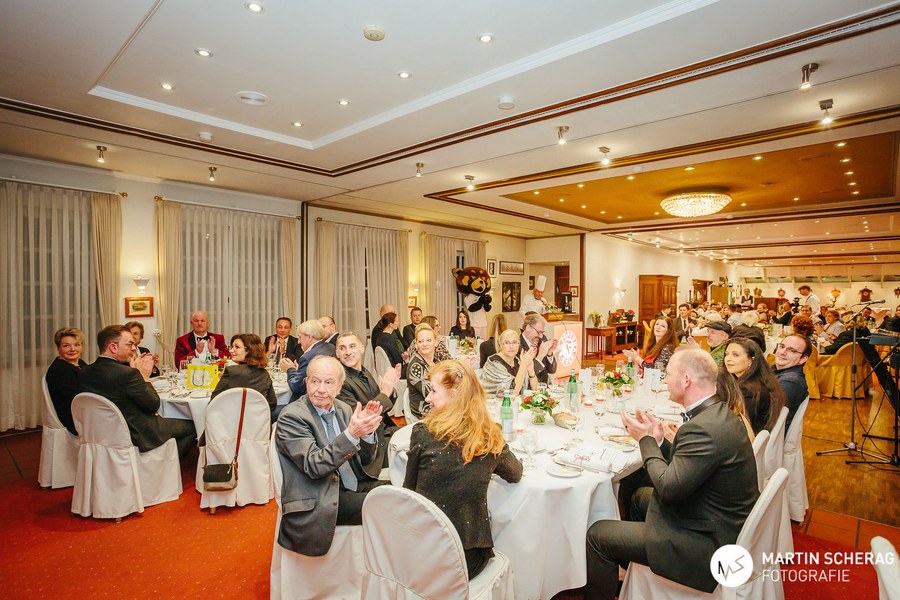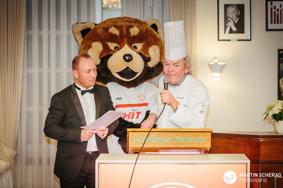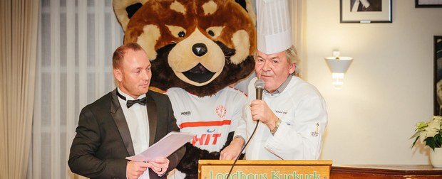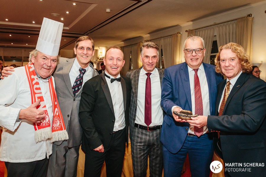 Nach einem kurzen Sektempfang und gereichten Häppchen des Hauses nahmen die rund 130 Gäste an den gedeckten Tischen Platz. Passend zum Anlass, deckte das Landhaus die Tische in rot und weiß. Zunächst übernahm der Gastgeber des Abends das Wort und begrüßte die Gäste, sowie die 1. Mannschaft der Fortuna. Schließlich reihte sich Benjamin Bruns, Geschäftsführer der Südstädter, zu den Rednern und überreichte Erhard Schäfer als kleine Aufmerksamkeit einen unterschriebenen Spielball, sowie das gelb-schwarze Traditionstrikot. Dann fiel der Startschuss für das vier Gänge Menü.