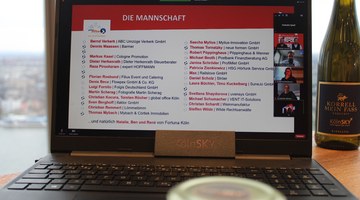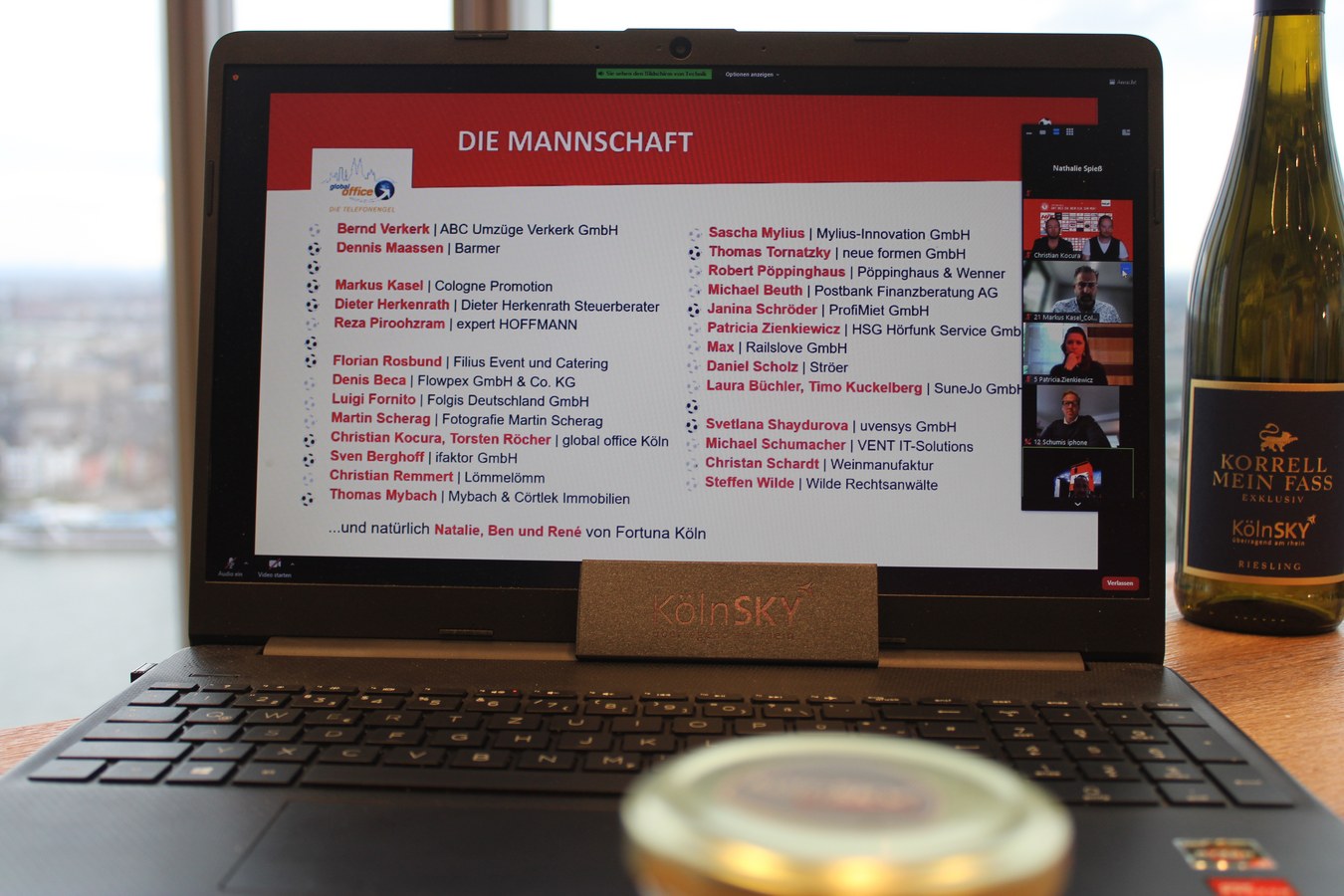 Dieses Mal ging es hoch hinaus. Bei unserem Partner KölnSky fand gestern das dritte Online-Speeddating für die Fortunapartner statt. Aus der 27. Etage des KölnTriangles begrüßten Geschäftsführer Michael Stern, Eventmanager Thomas Sekeres, und Küchenchef Sönke Höltgen über die Plattform Zoom, die teilnehmenden Gäste. Für die 30 Teilnehmer hieß es dann, sich kurz und möglichst prägnant in 60 Sekunden vorzustellen. Für die Halbzeitpause lieferte KölnSky bereits im Vorfeld der Veranstaltung den Teilnehmern ein exklusives Paket nach Hause. Darin enthalten waren, von Küchenchef Sönke Höltgen eigens erstellte Kreationen wie eine mit Brandy verfeinerte Erdbeer-Rhabarber Konfitüre oder bergischer Tafelspitz mit Kartoffel-Bärlauch Salat und Spitzkohl. Dort präsentierten die Gastgeber die zahlreichen Veranstaltungsmöglichkeiten, mit bestem Blick über die Domstadt.