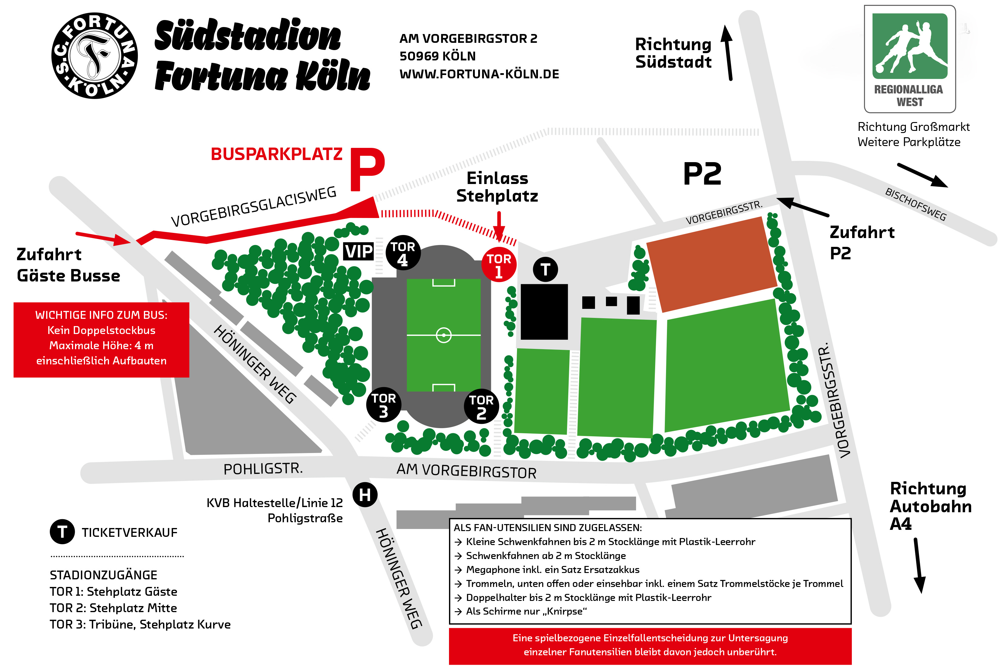 folgend findet ihr zusammengefasst einige hilfreiche Informationen für alle, die ihre Mannschaft im Zuge eines Auswärtsspiels nach Köln ins Südstadion begleiten möchten. Alle Informationen könnt ihr noch einmal ausführlich im Lageplan und der Stadionordnung des Südstadions nachlesen. Diese stellen wir euch ebenfalls zur Verfügung. Beides kann mit einem Klick auf die entsprechende Miniaturansicht geöffnet werden. Bitte lest euch die Informationen sorgfältig durch, um euren Aufenthalt so angenehm wie möglich zu gestalten. Bei weiteren Fragen steht euch außerdem unsere Fanbeauftragten Frank Heller, Annika Onkelbach und Malte Petrikat gerne zur Verfügung.